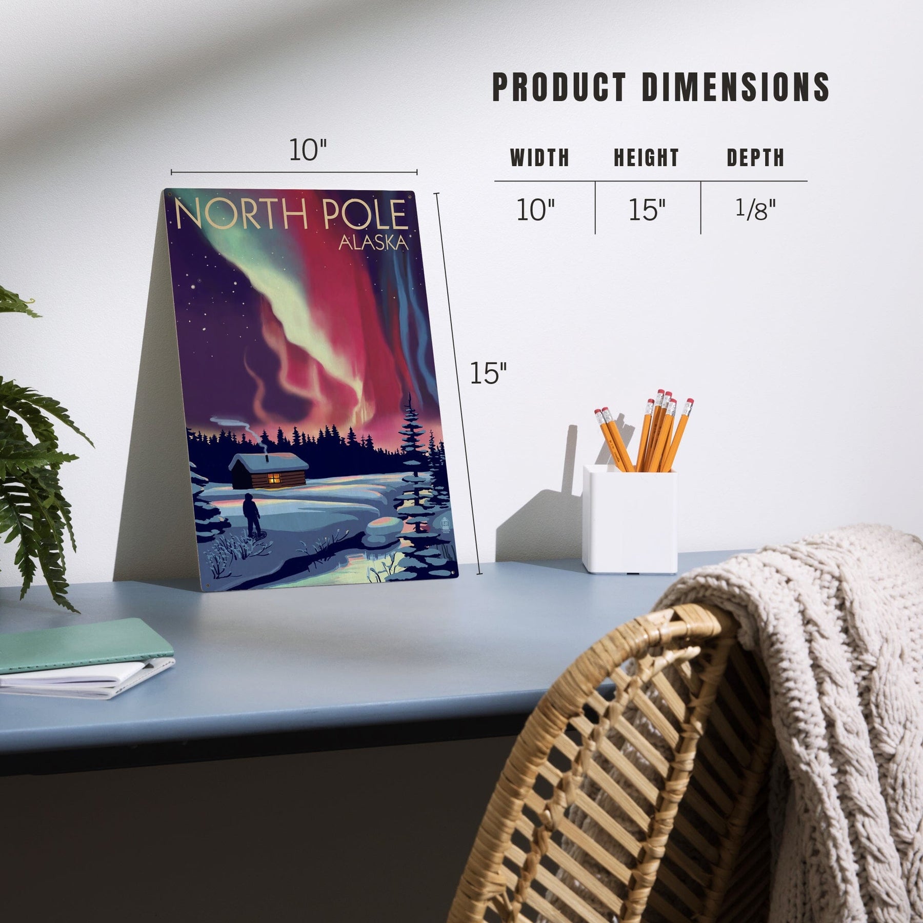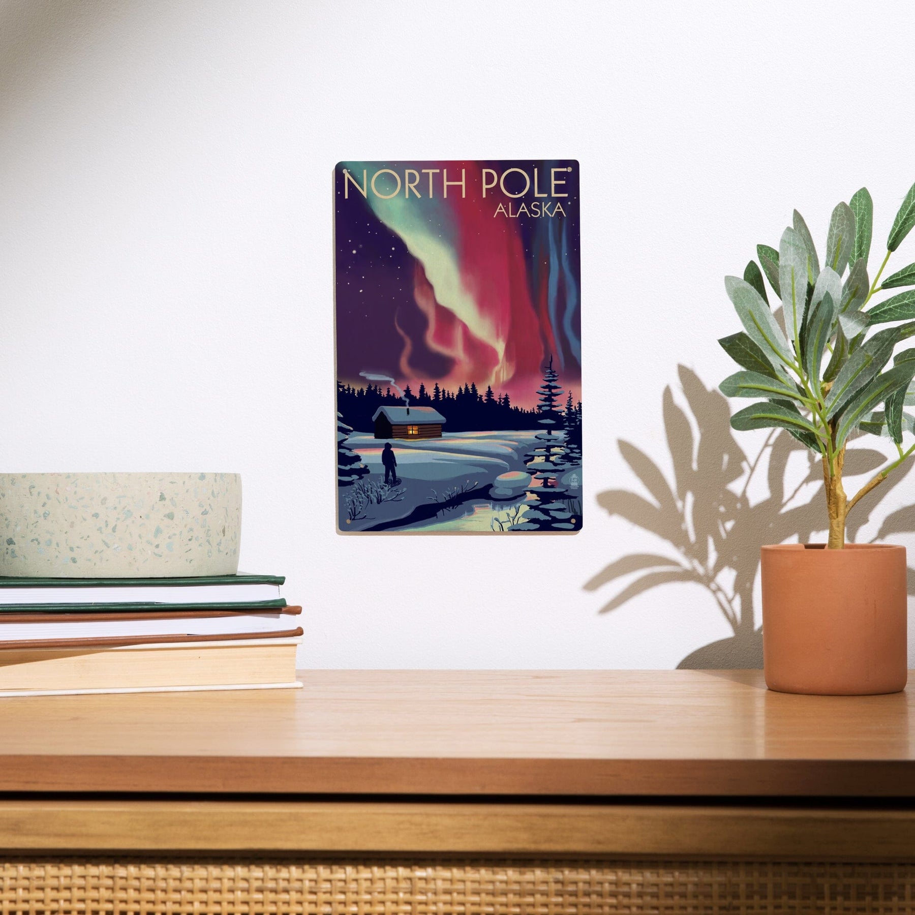 North Pole, Alaska, Northern Lights & Cabin, Lantern Press Poster, Wood Signs and Postcards Wood Lantern Press
