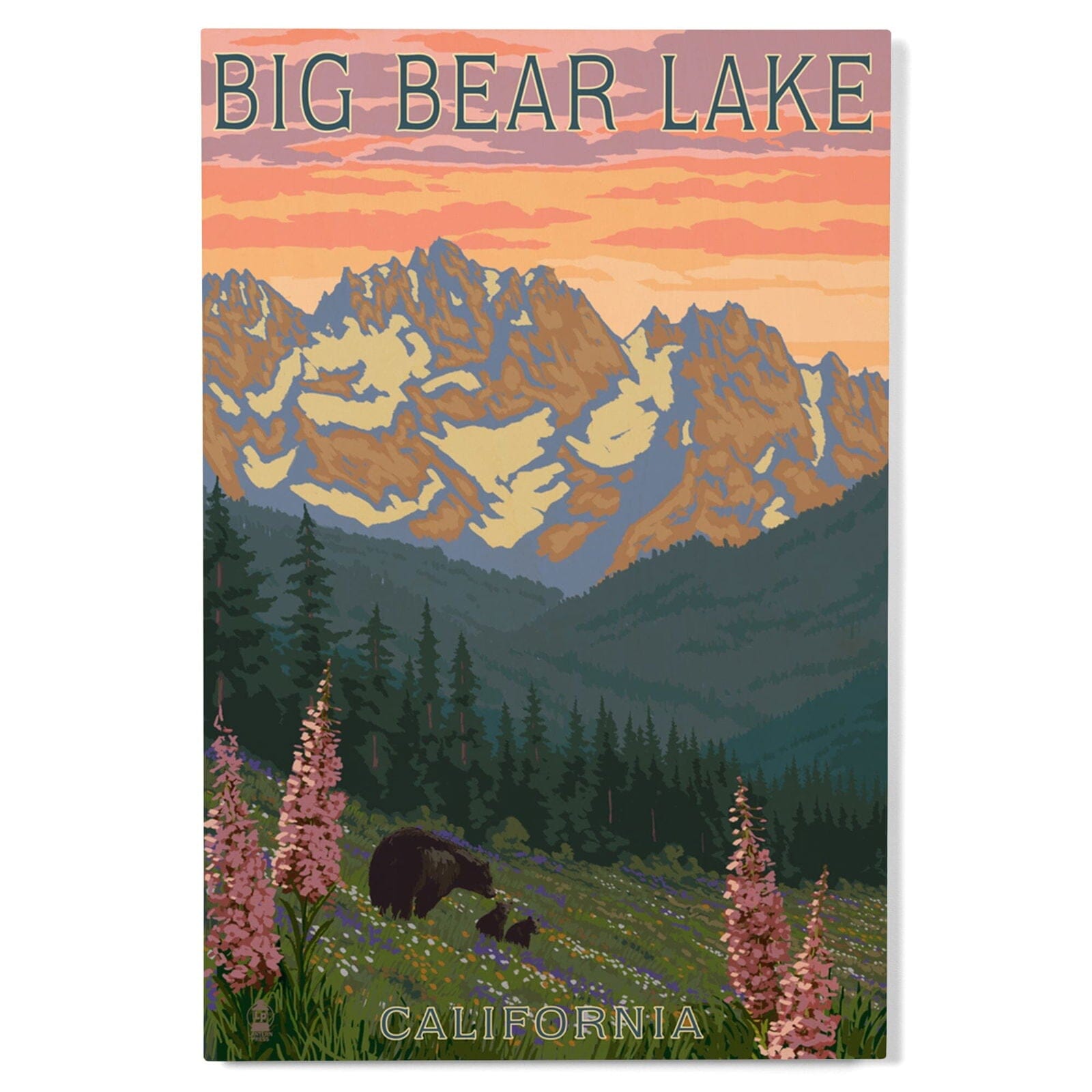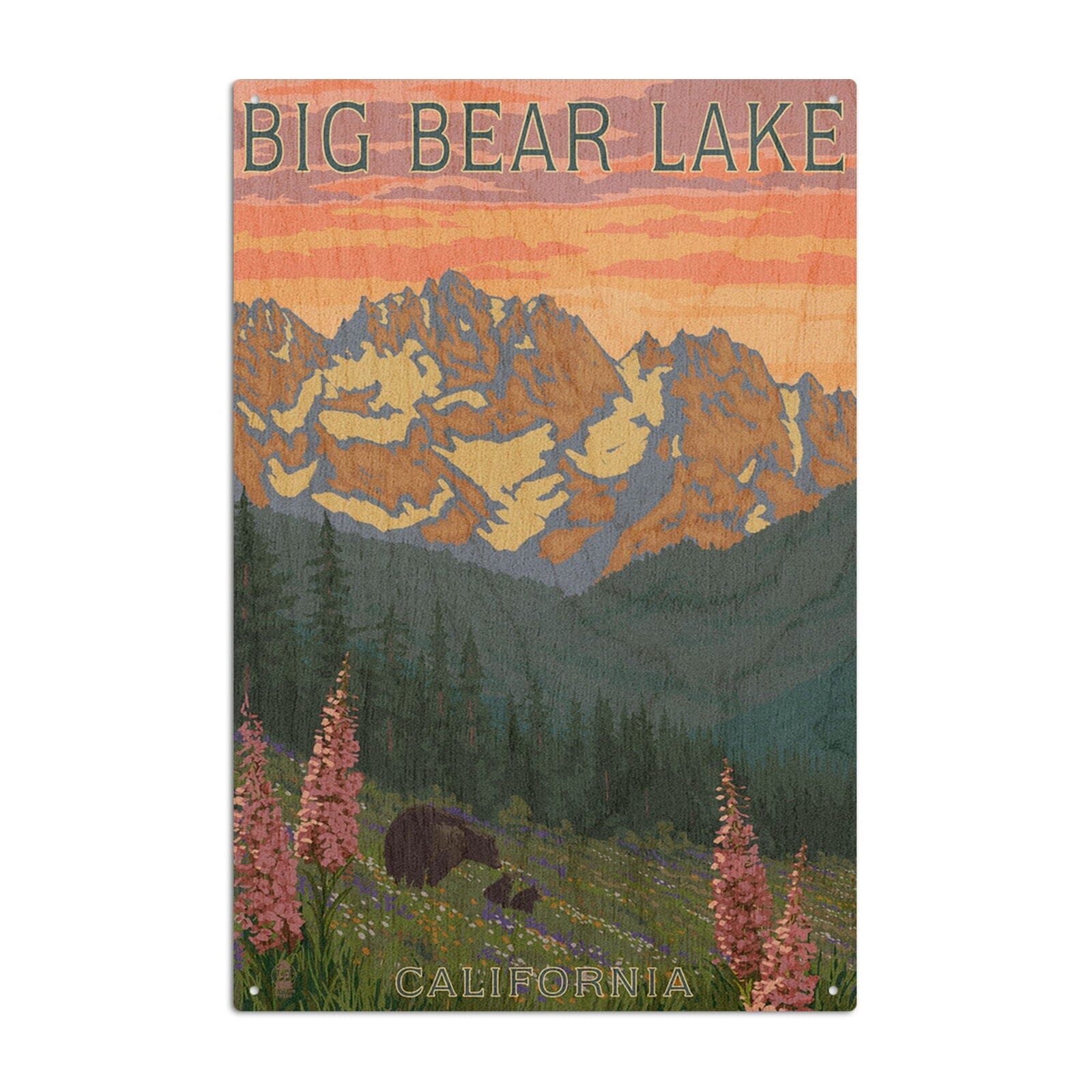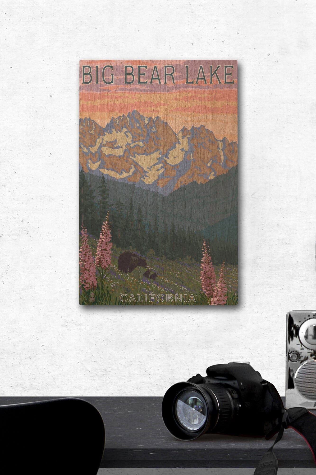 Big Bear Lake, California, Bear and Spring Flowers, Lantern Press Artwork, Wood Signs and Postcards Wood Lantern Press