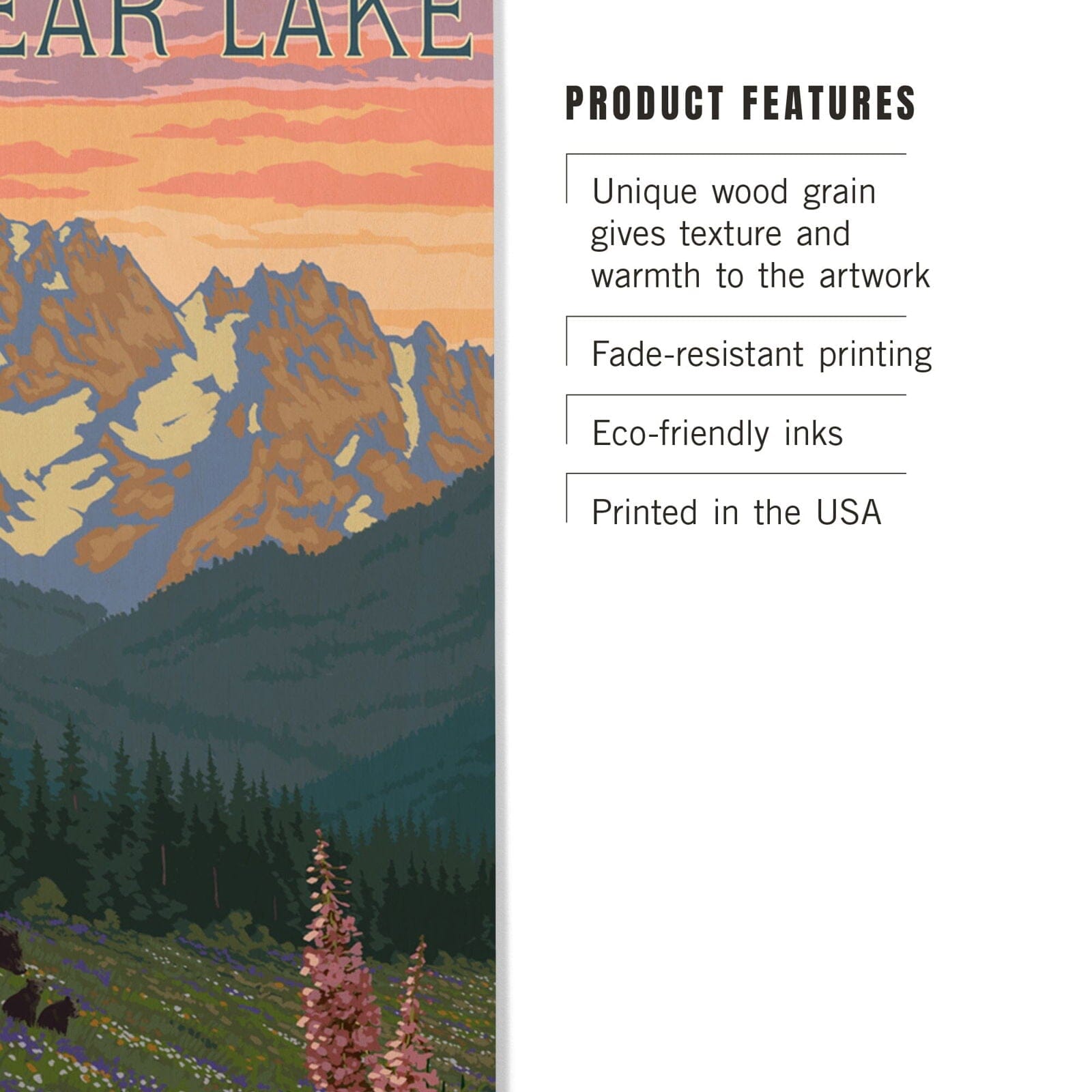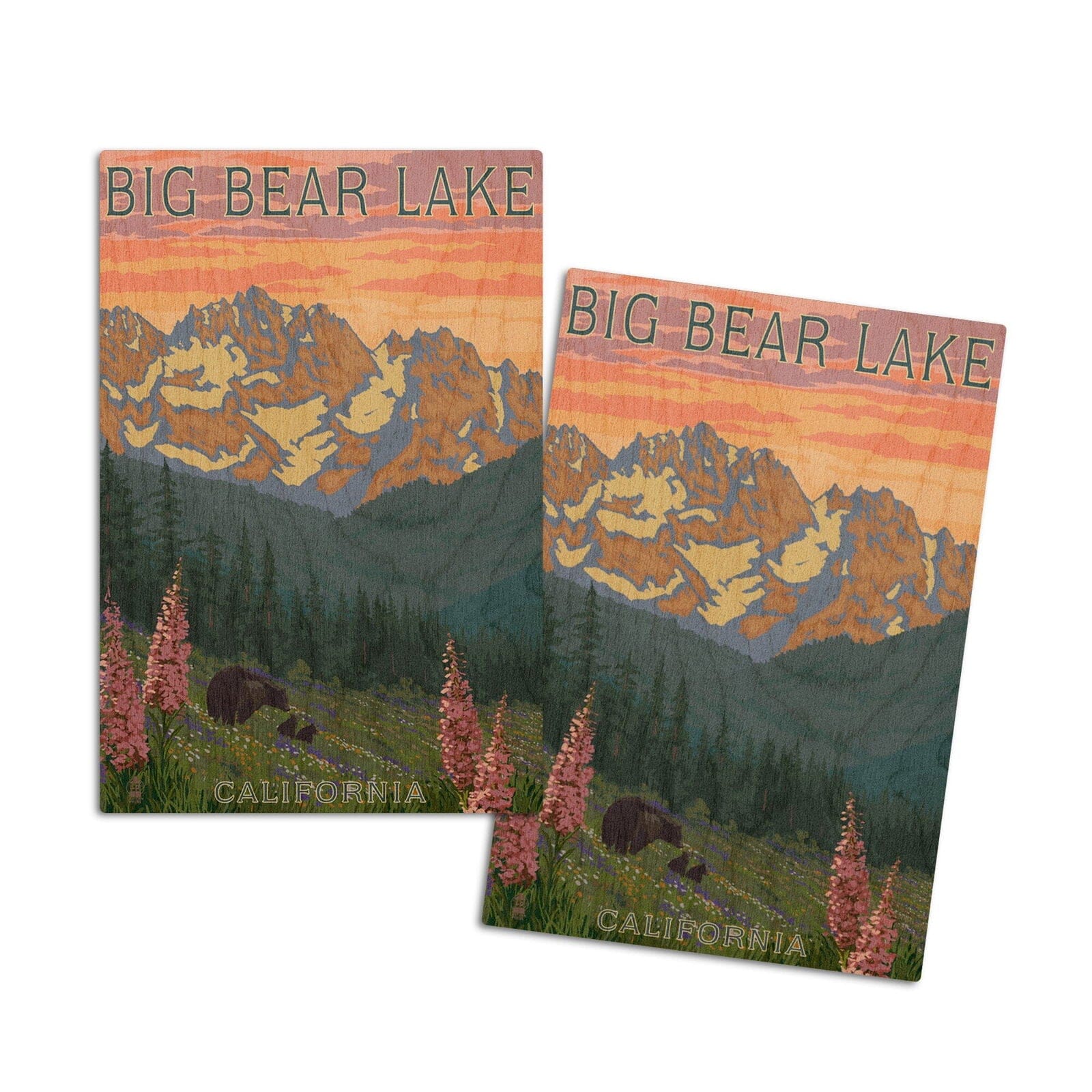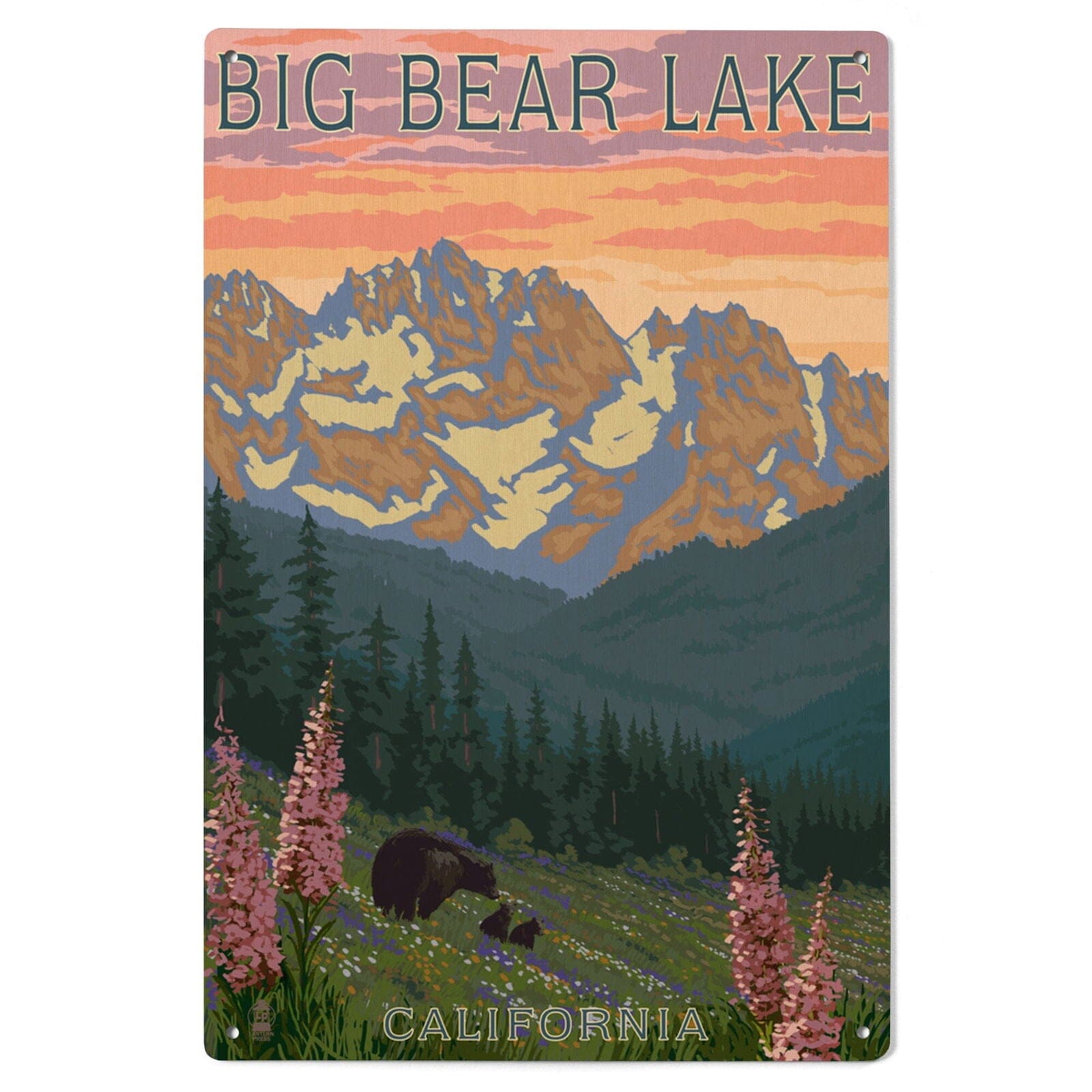 Big Bear Lake, California, Bear and Spring Flowers, Lantern Press Artwork, Wood Signs and Postcards Wood Lantern Press