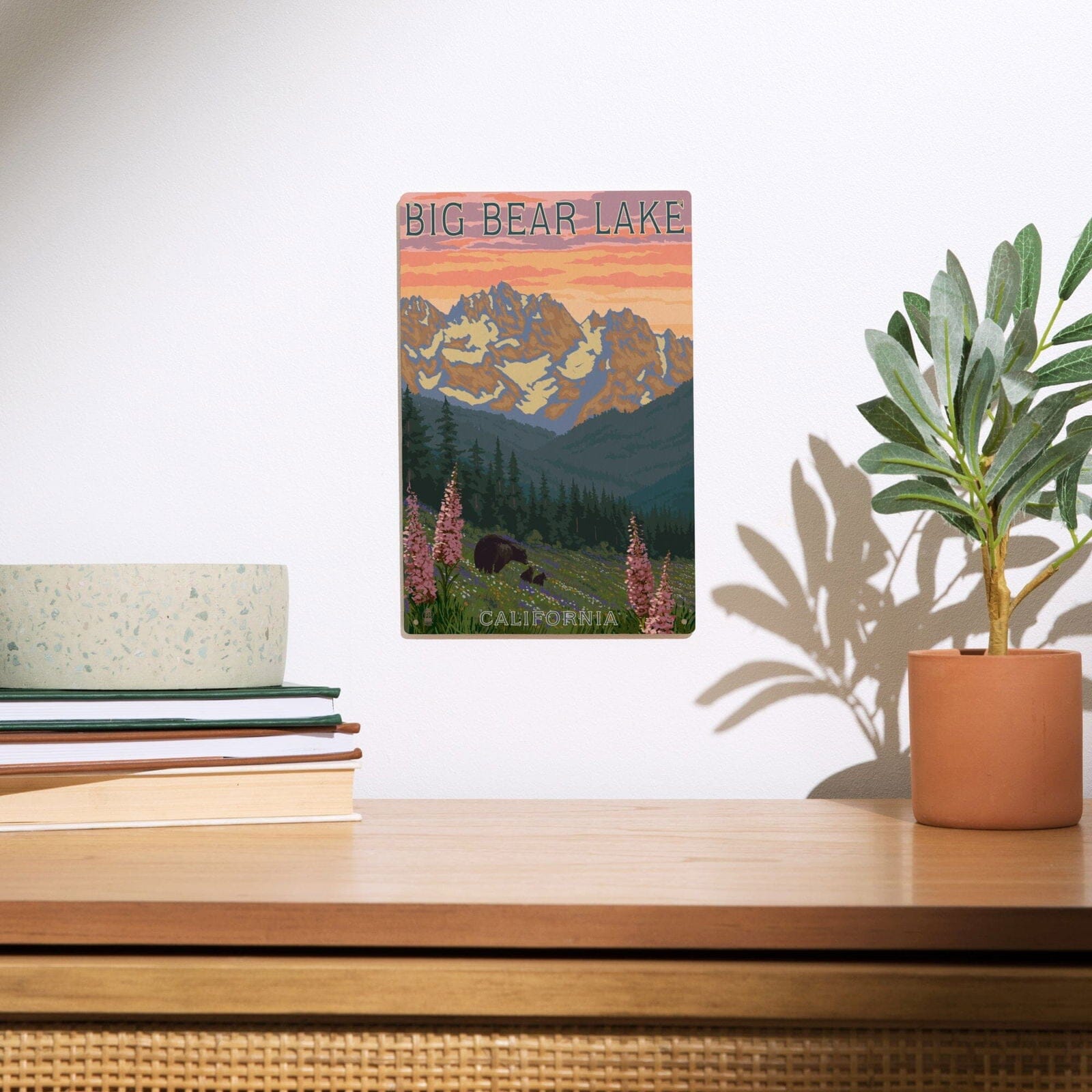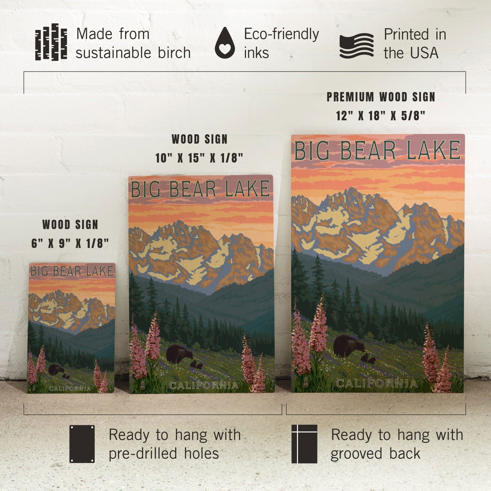 Big Bear Lake, California, Bear and Spring Flowers, Lantern Press Artwork, Wood Signs and Postcards