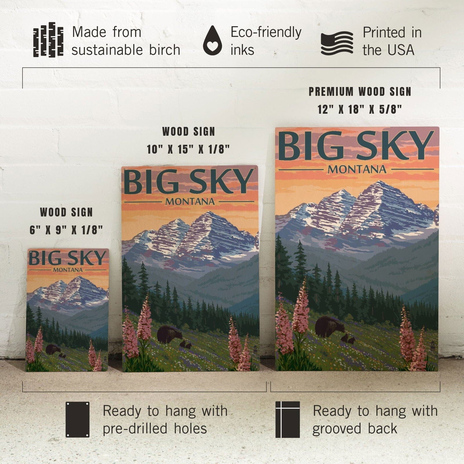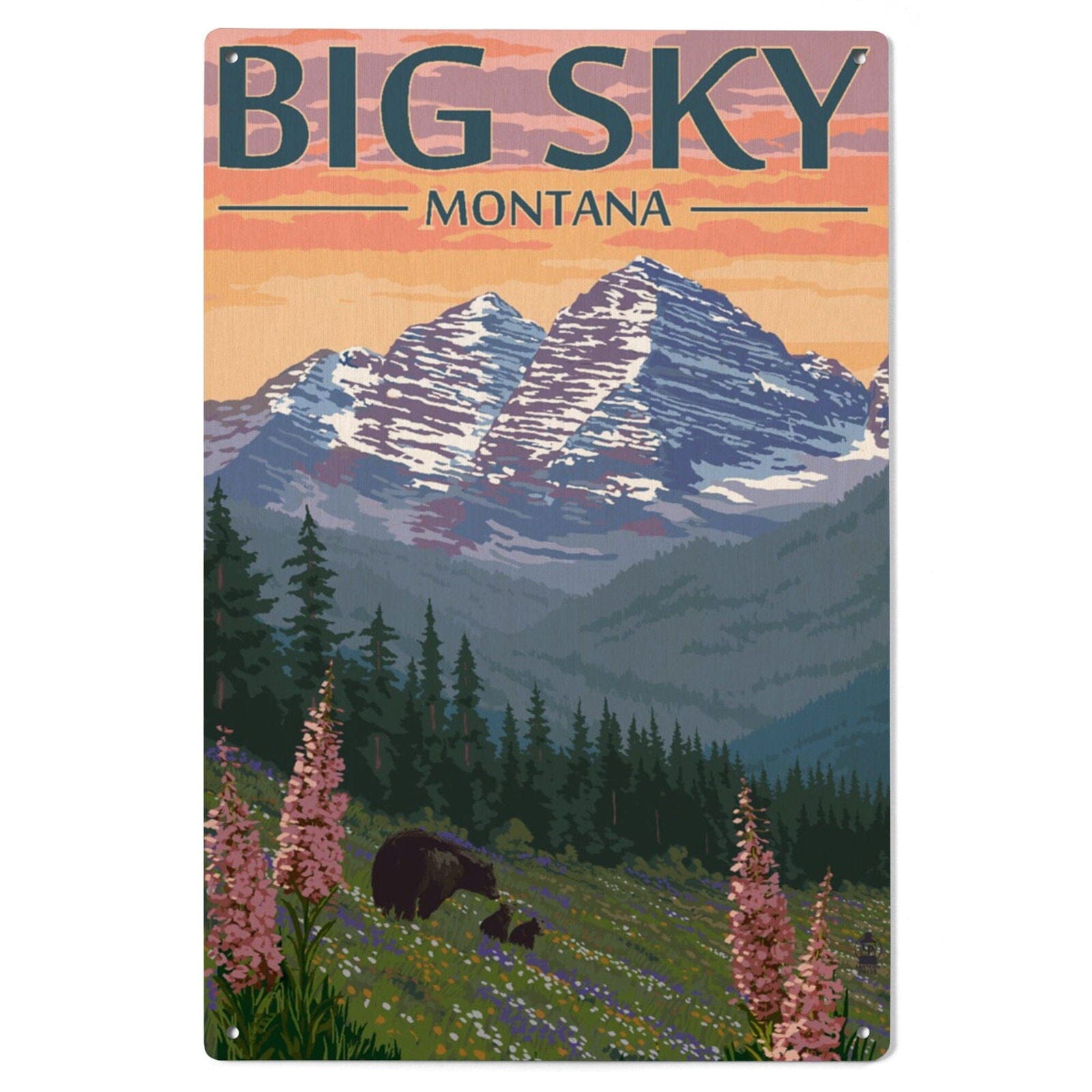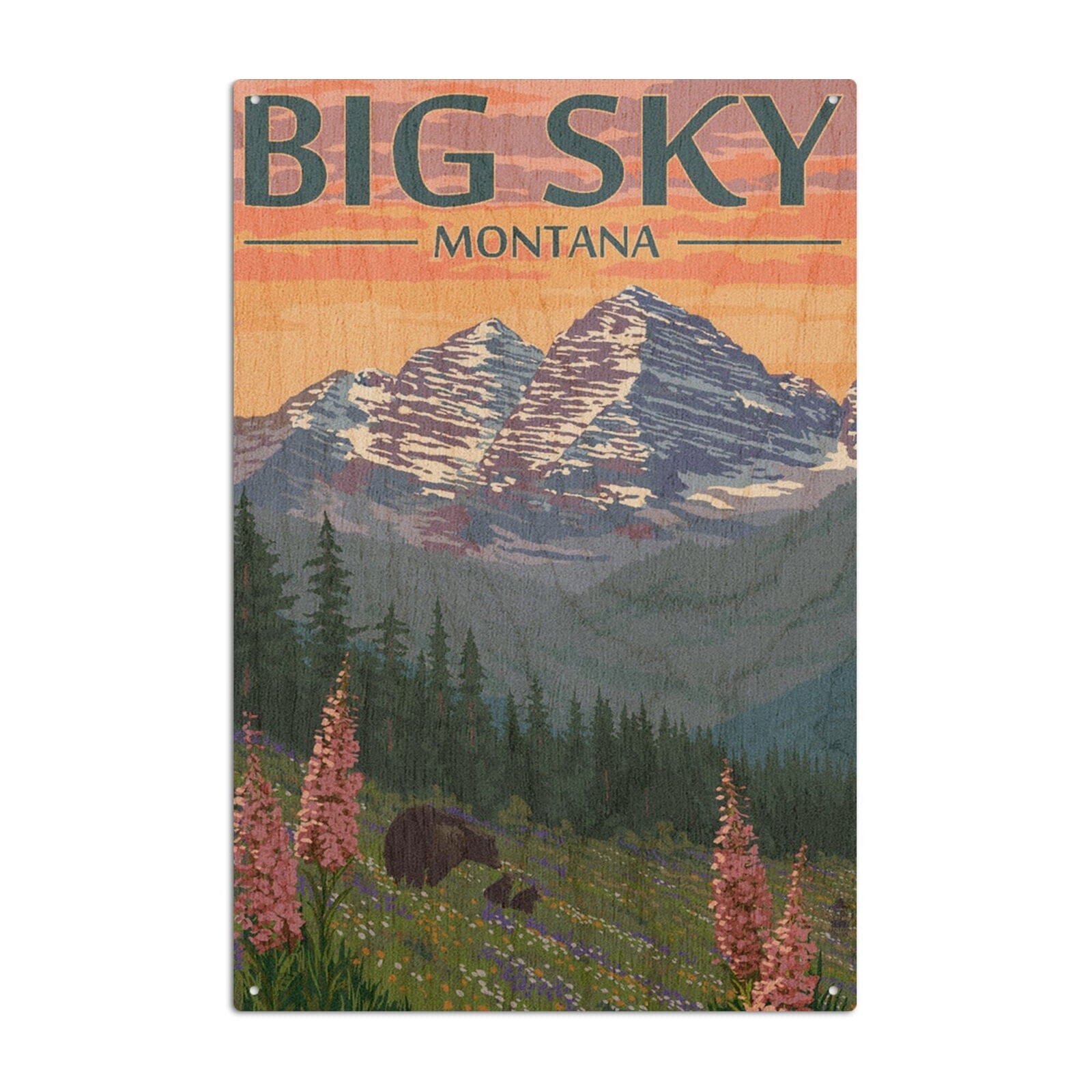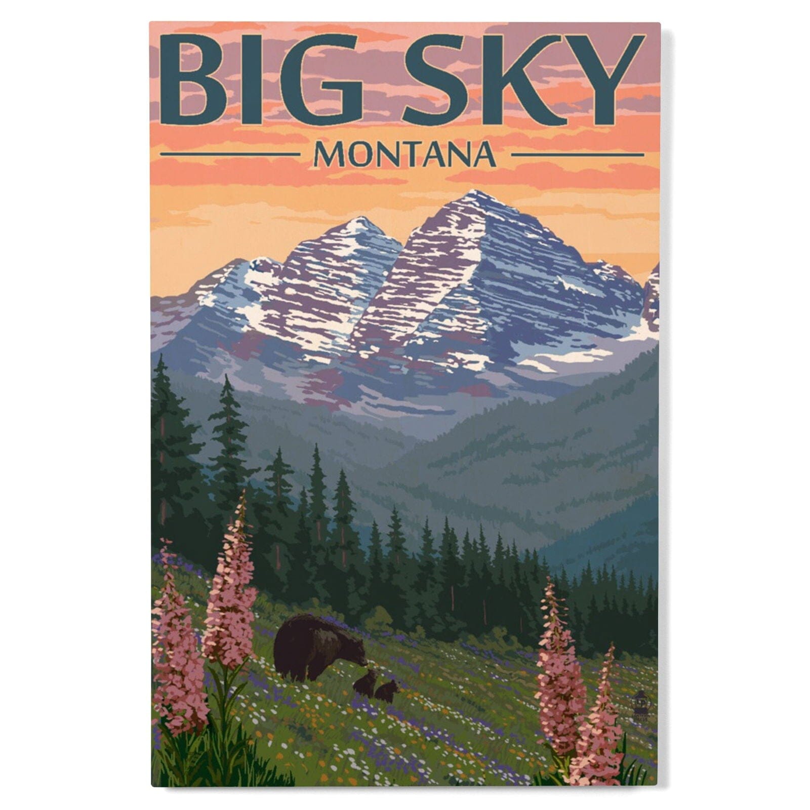 Big Sky, Montana, Bear & Spring Flowers, Lantern Press Artwork, Wood Signs and Postcards