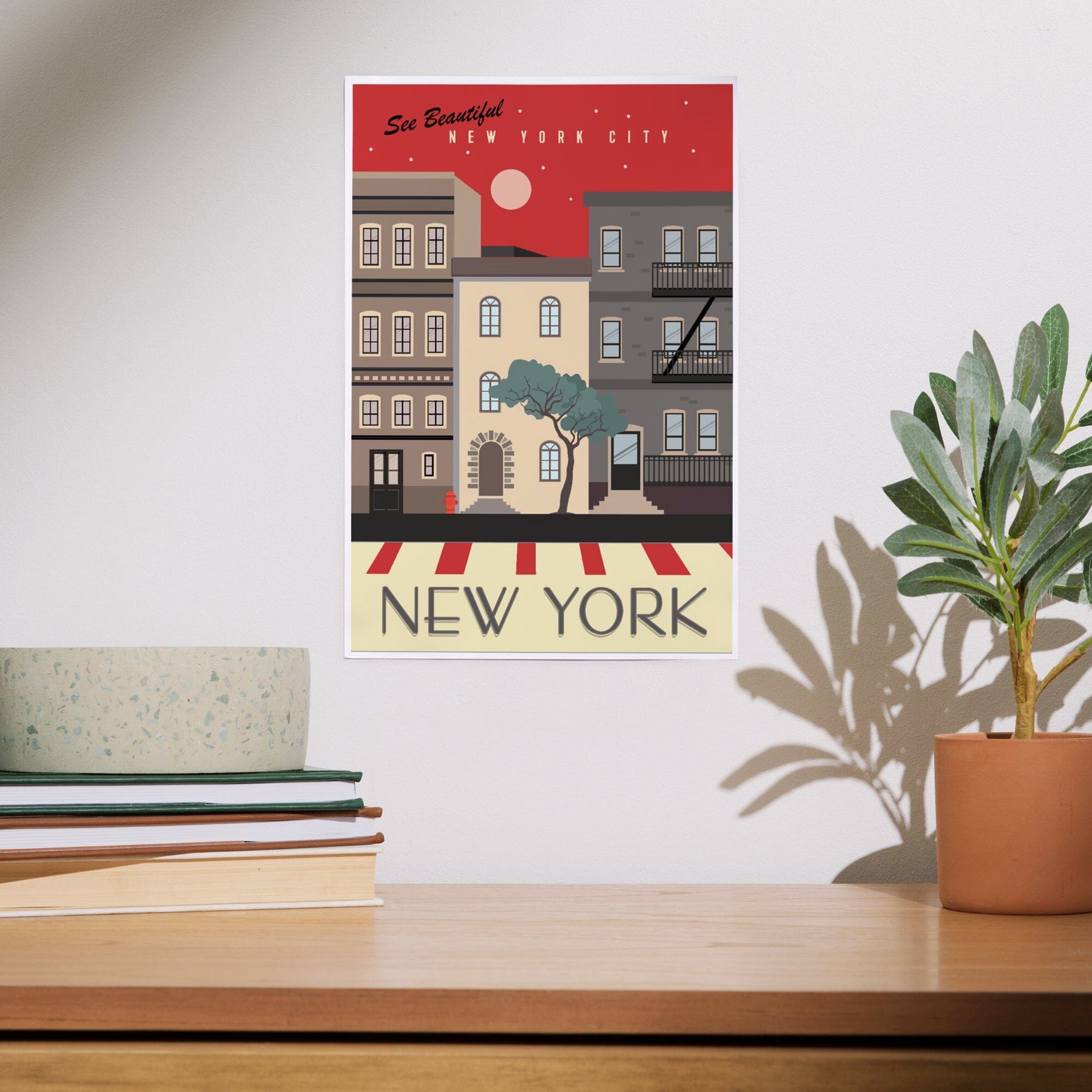 New York City, New York, Brownstones, Street Vector, Art & Giclee Prints