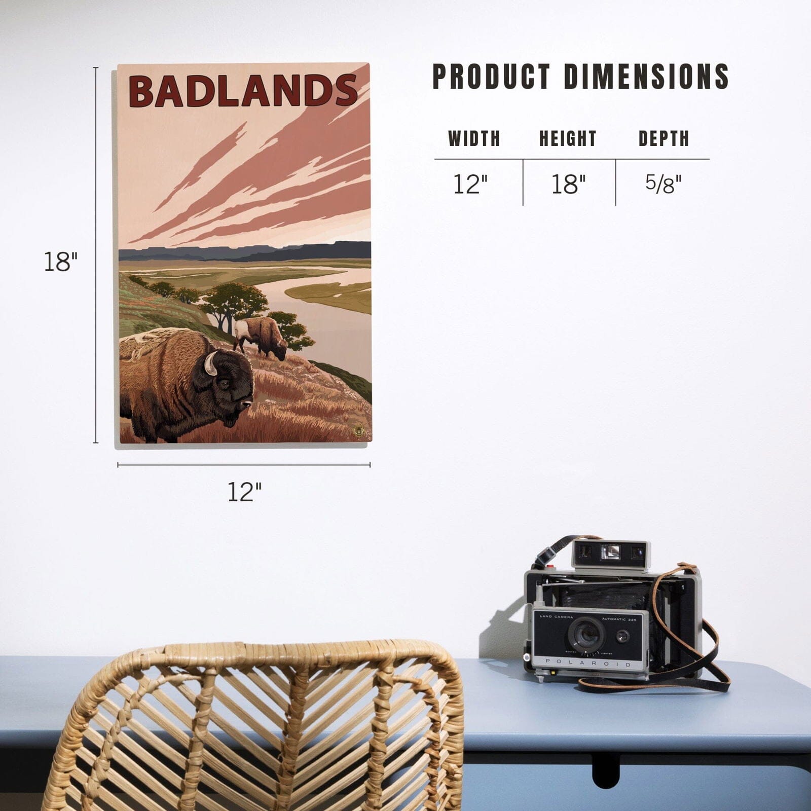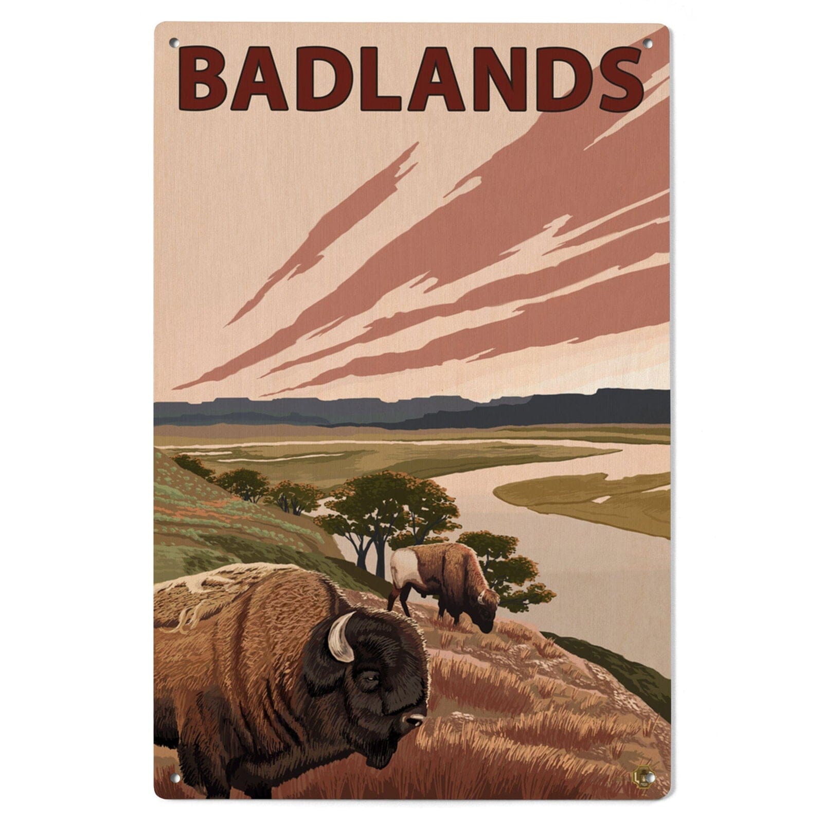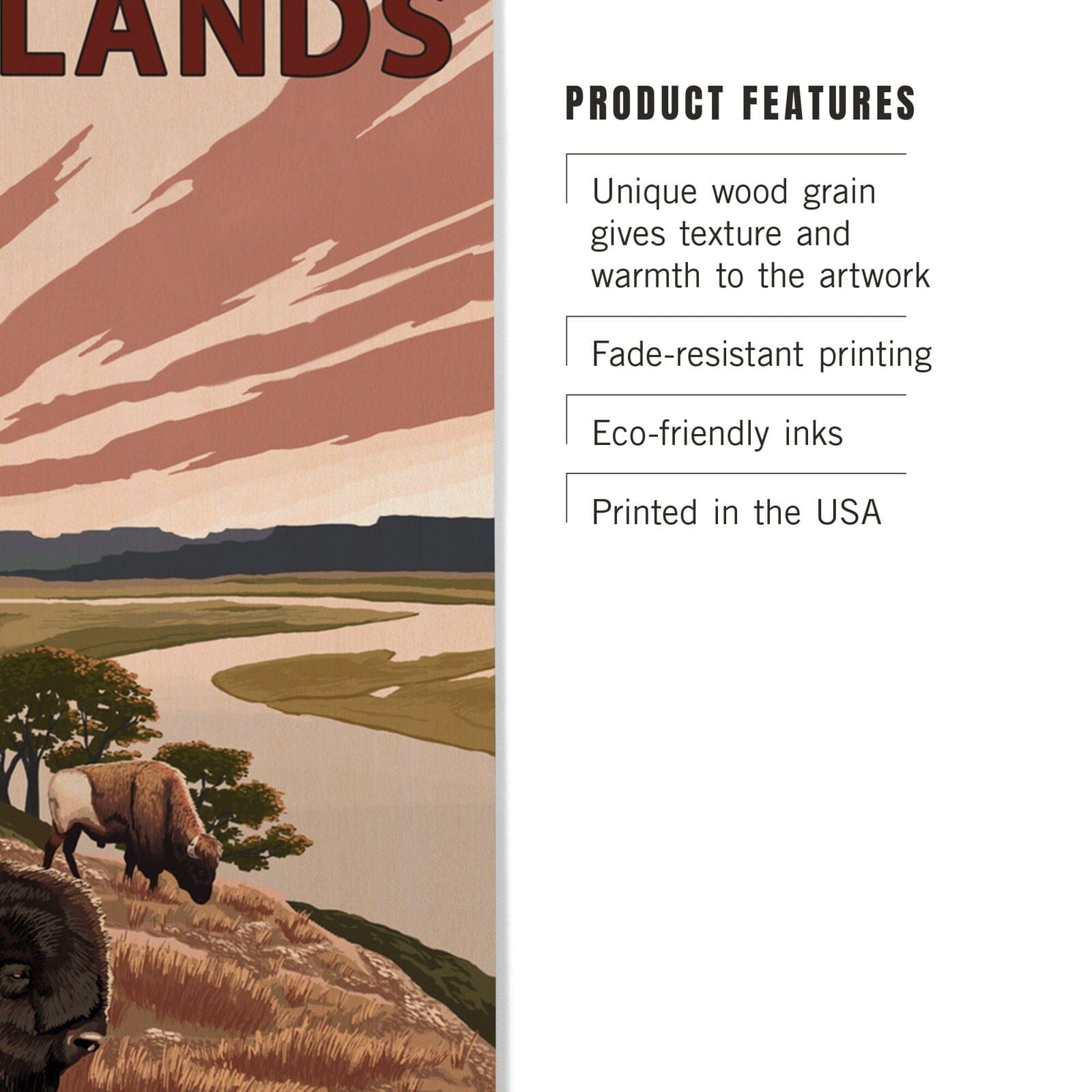 Badlands, North Dakota, Bison and Buttes, Lantern Press Artwork, Wood Signs and Postcards Wood Lantern Press