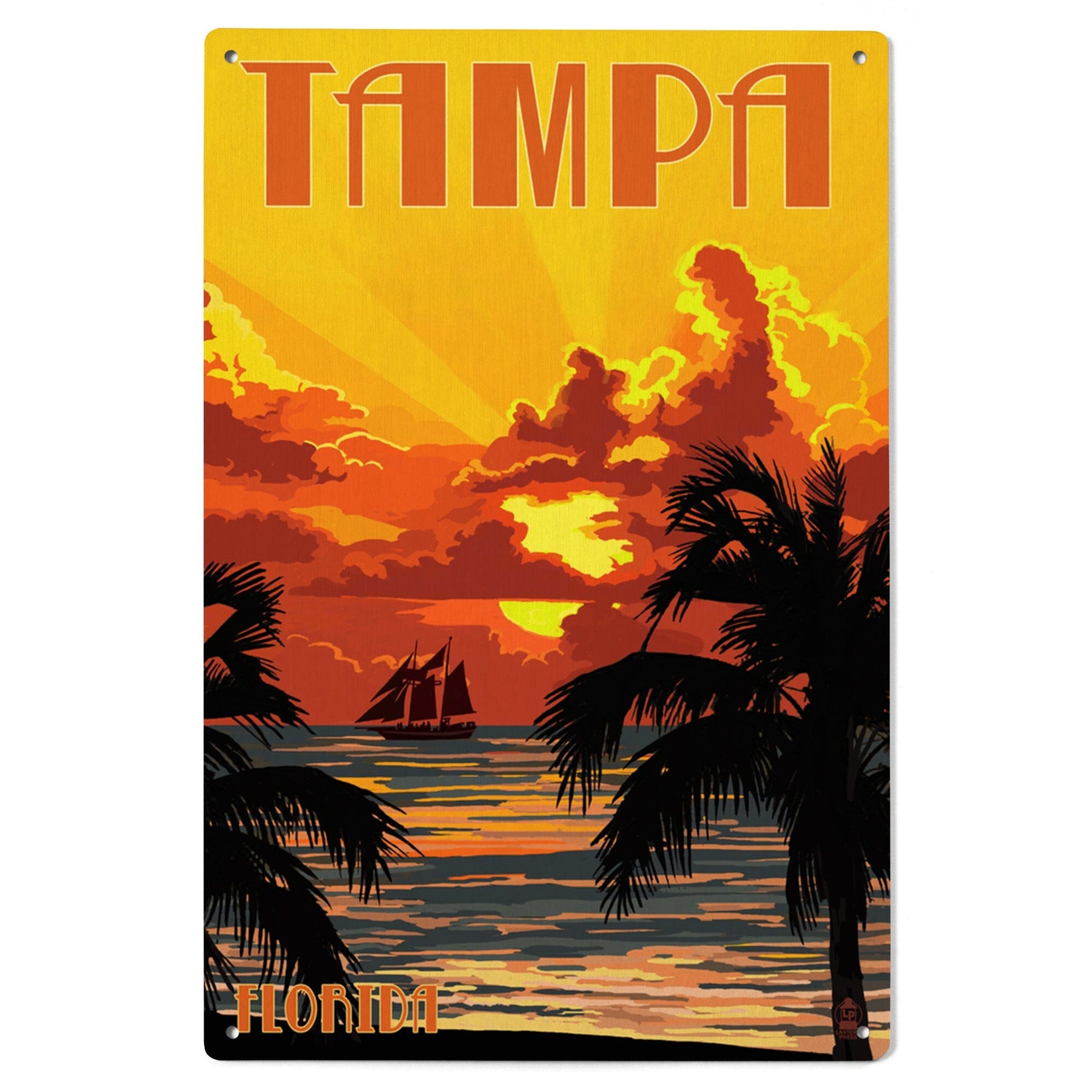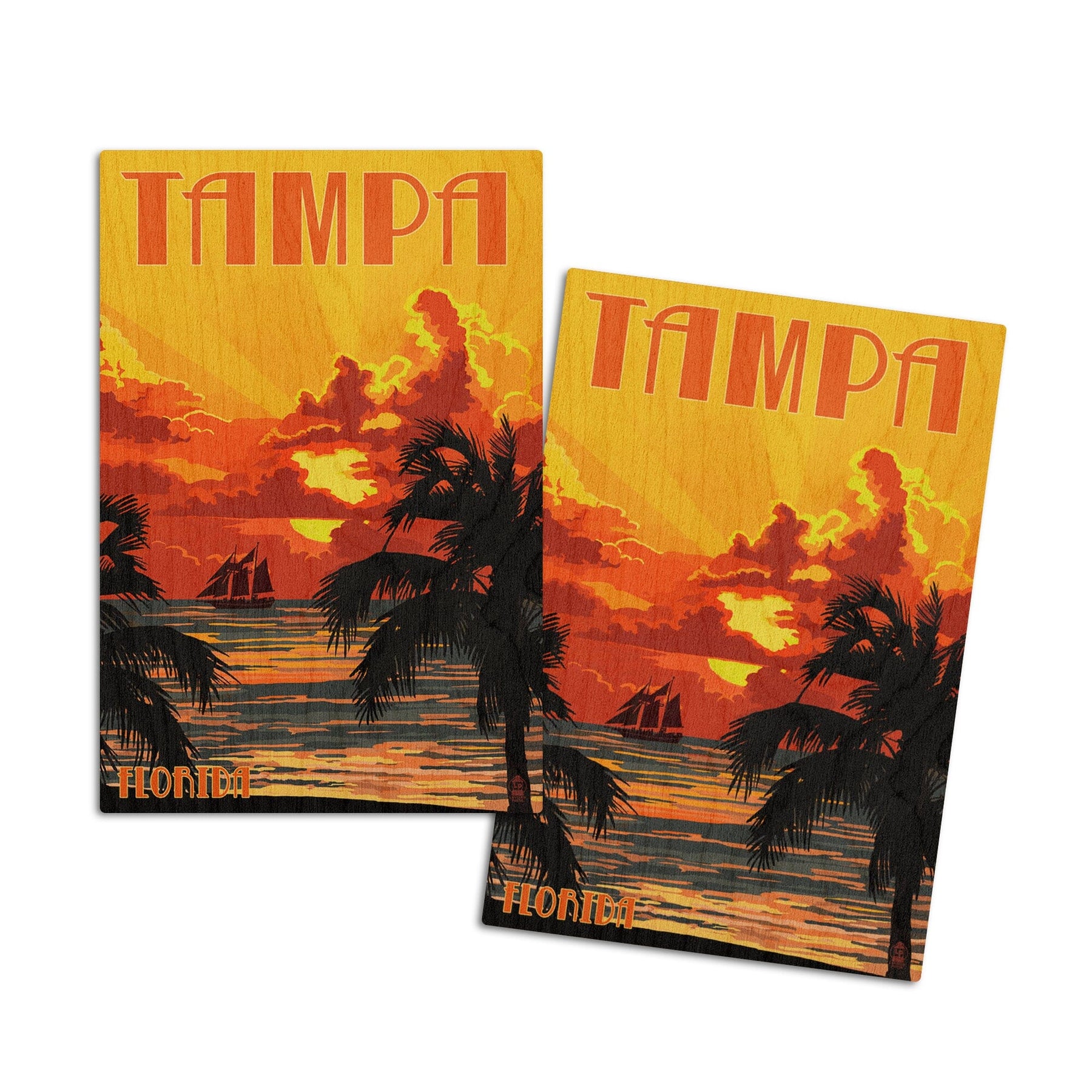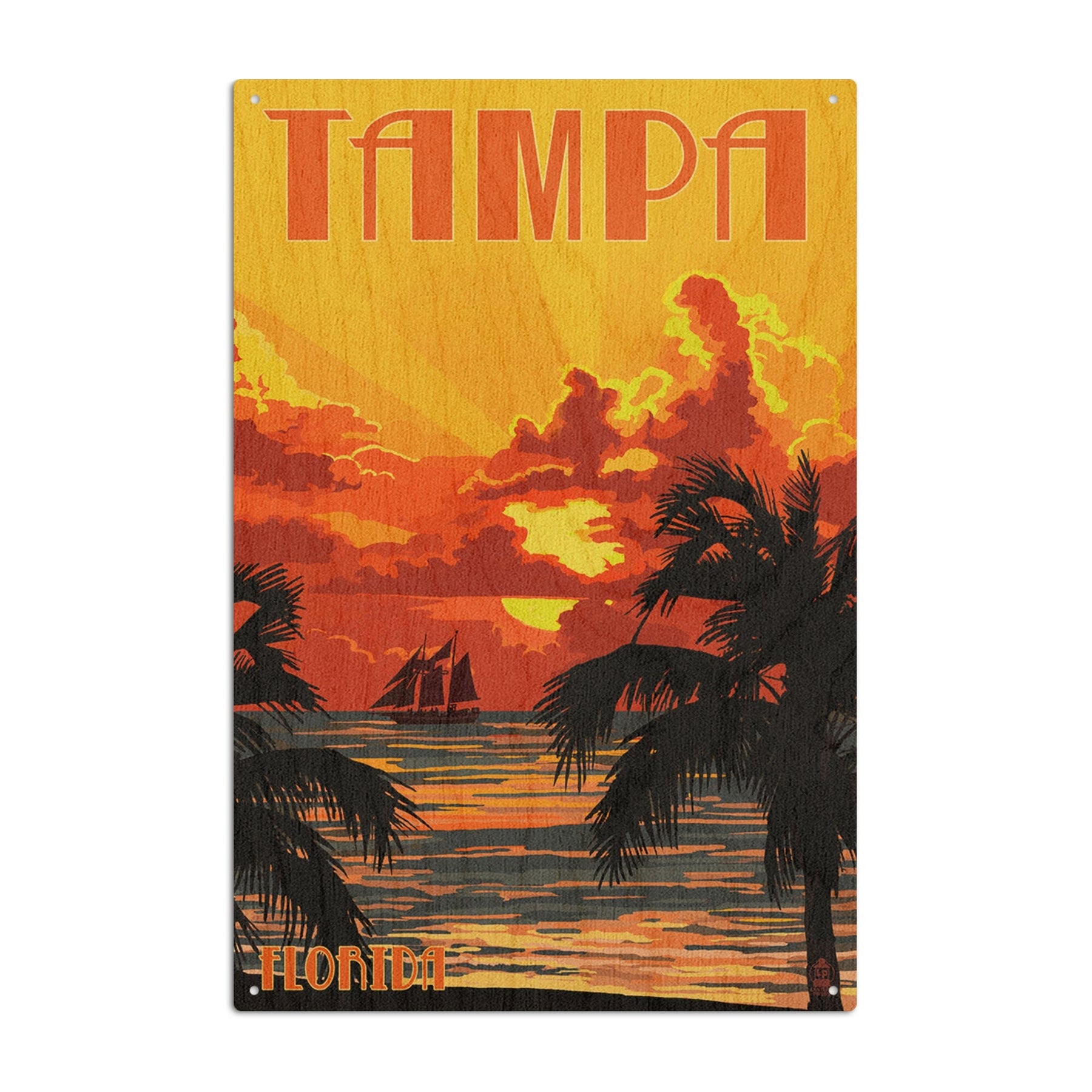 Tampa, Florida, Sunset & Ship, Lantern Press Artwork, Wood Signs and Postcards Wood Lantern Press