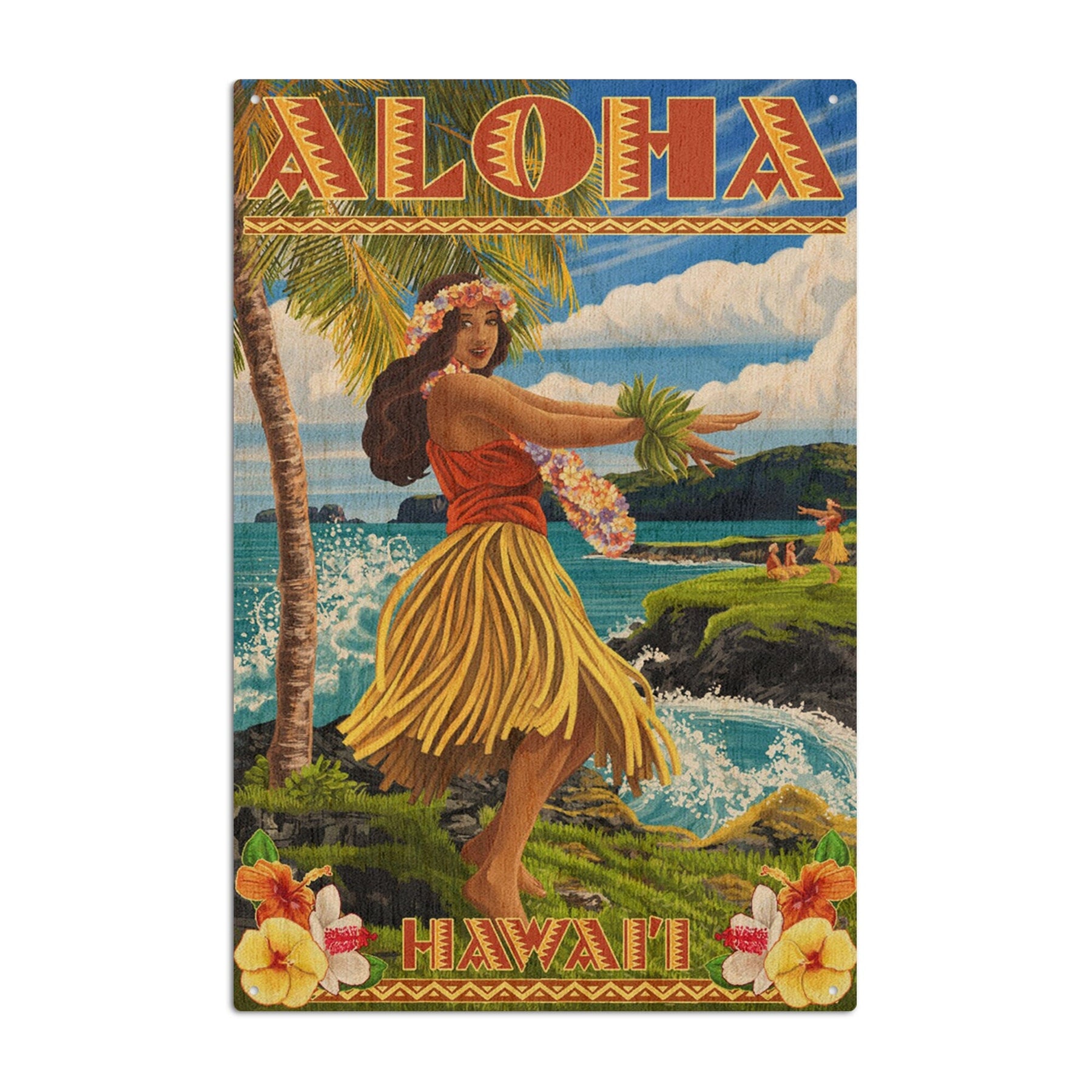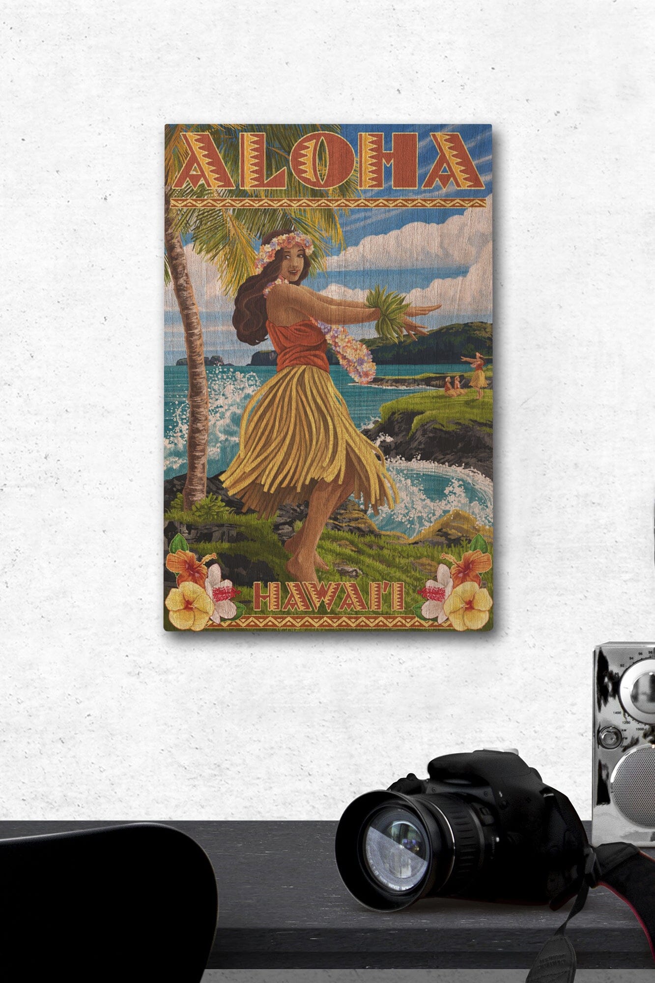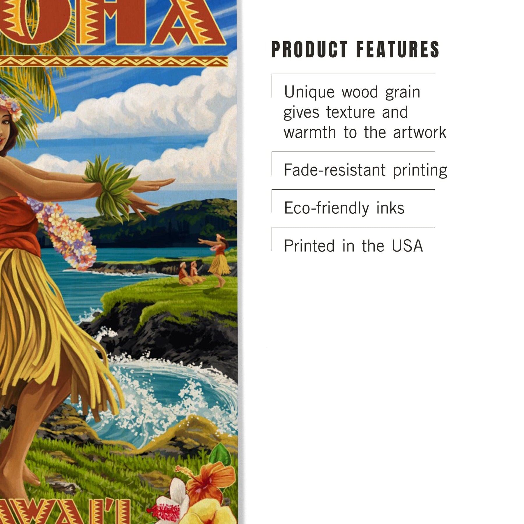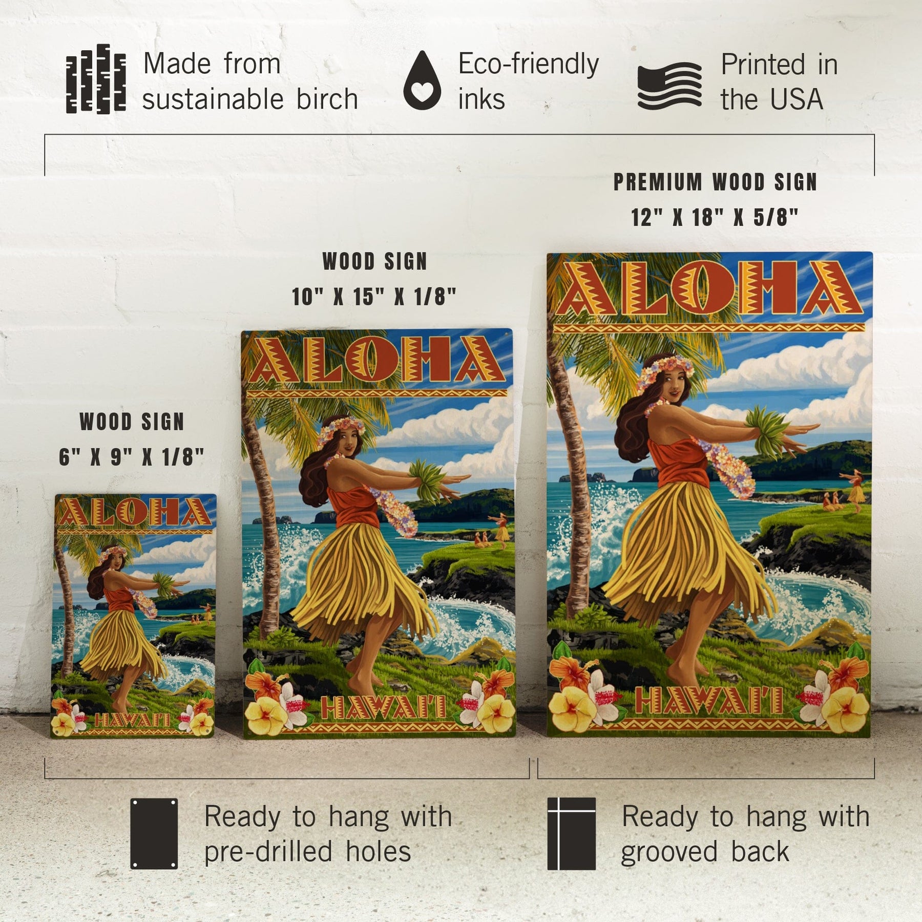 Hawaii, Aloha, Hula Girl on Coast (Flower Border), Lantern Press Artwork, Wood Signs and Postcards
