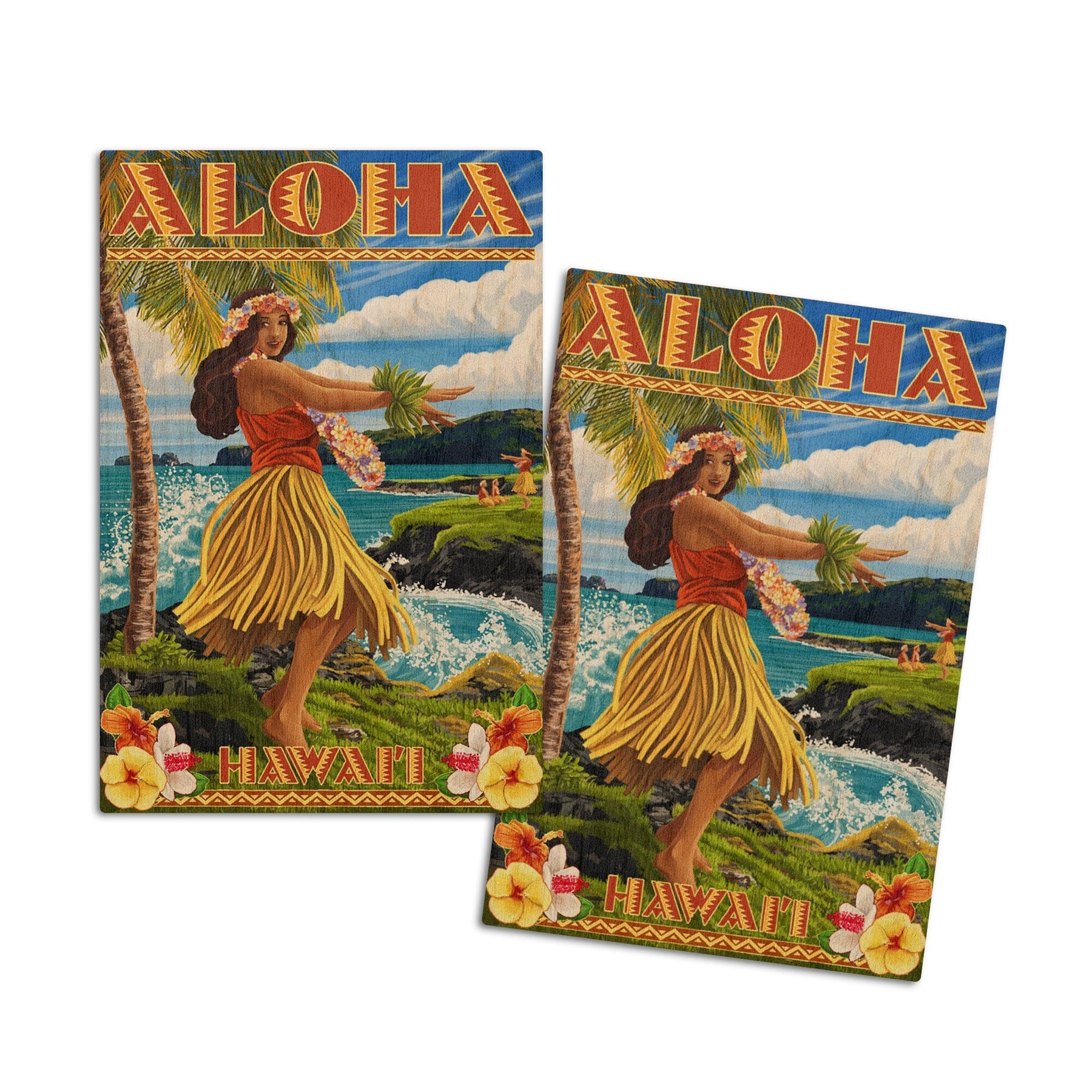Hawaii, Aloha, Hula Girl on Coast (Flower Border), Lantern Press Artwork, Wood Signs and Postcards - Lantern Press