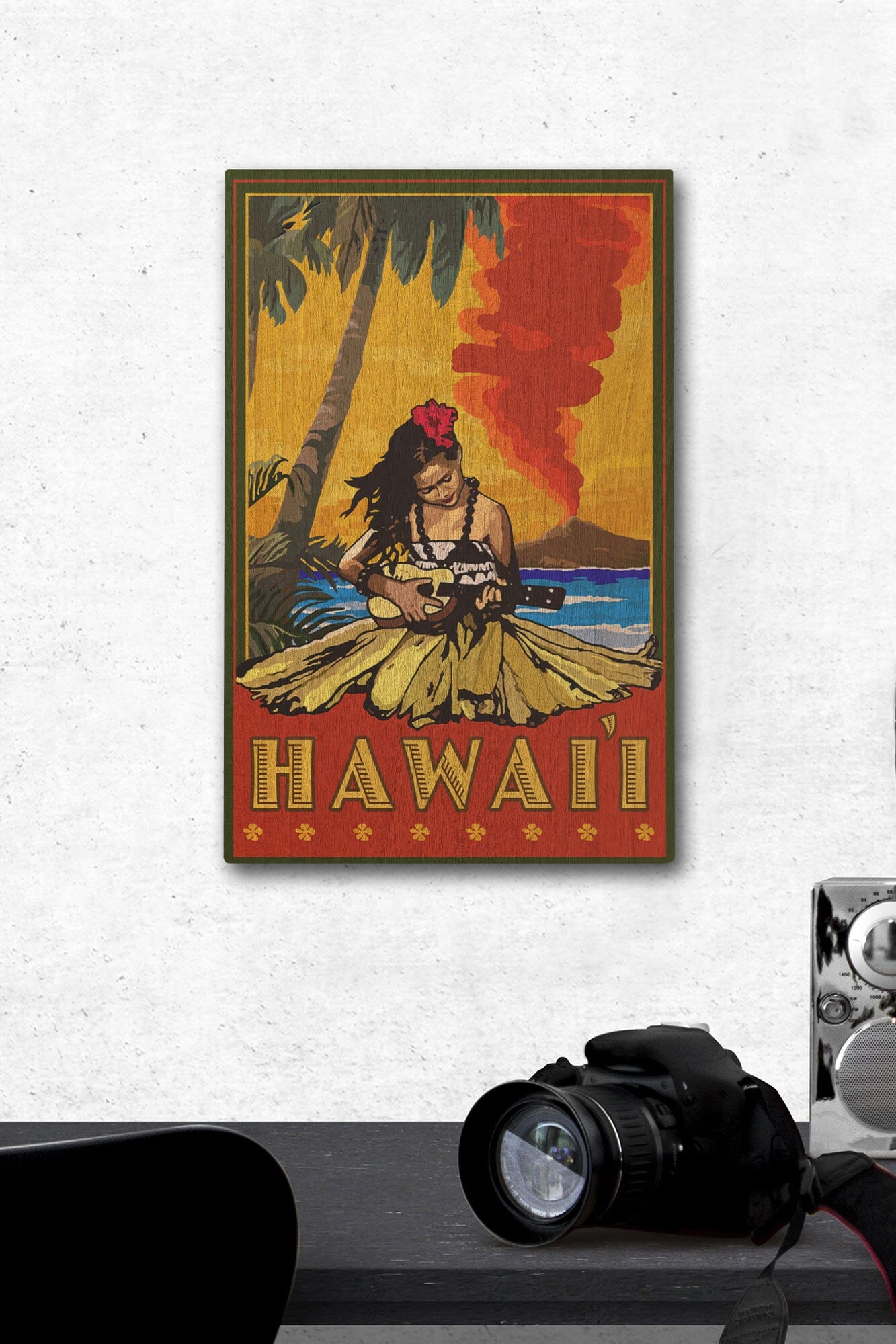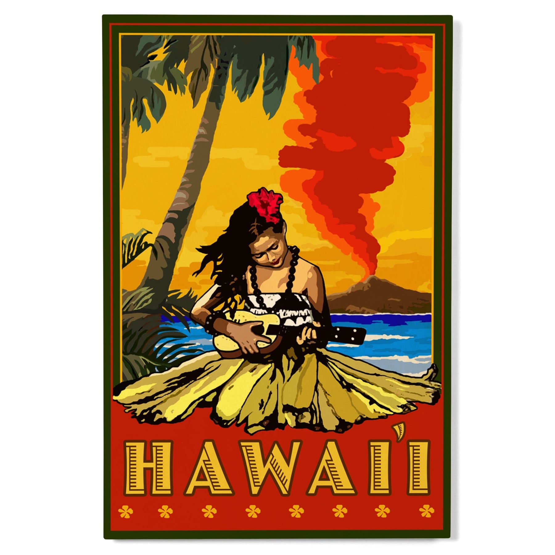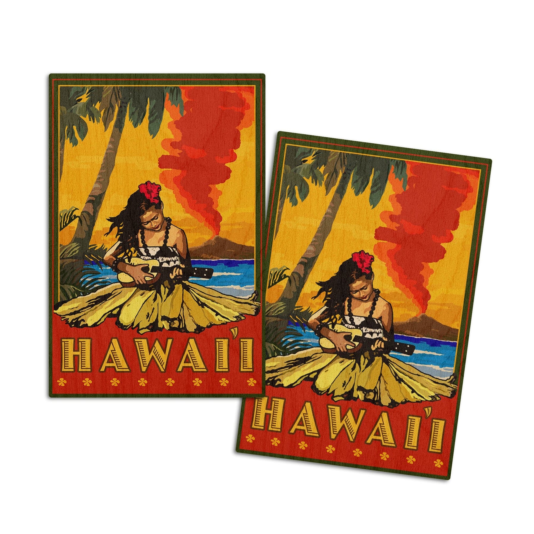 Hawaii, Hula Girl & Ukulele, Lantern Press Artwork, Wood Signs and Postcards