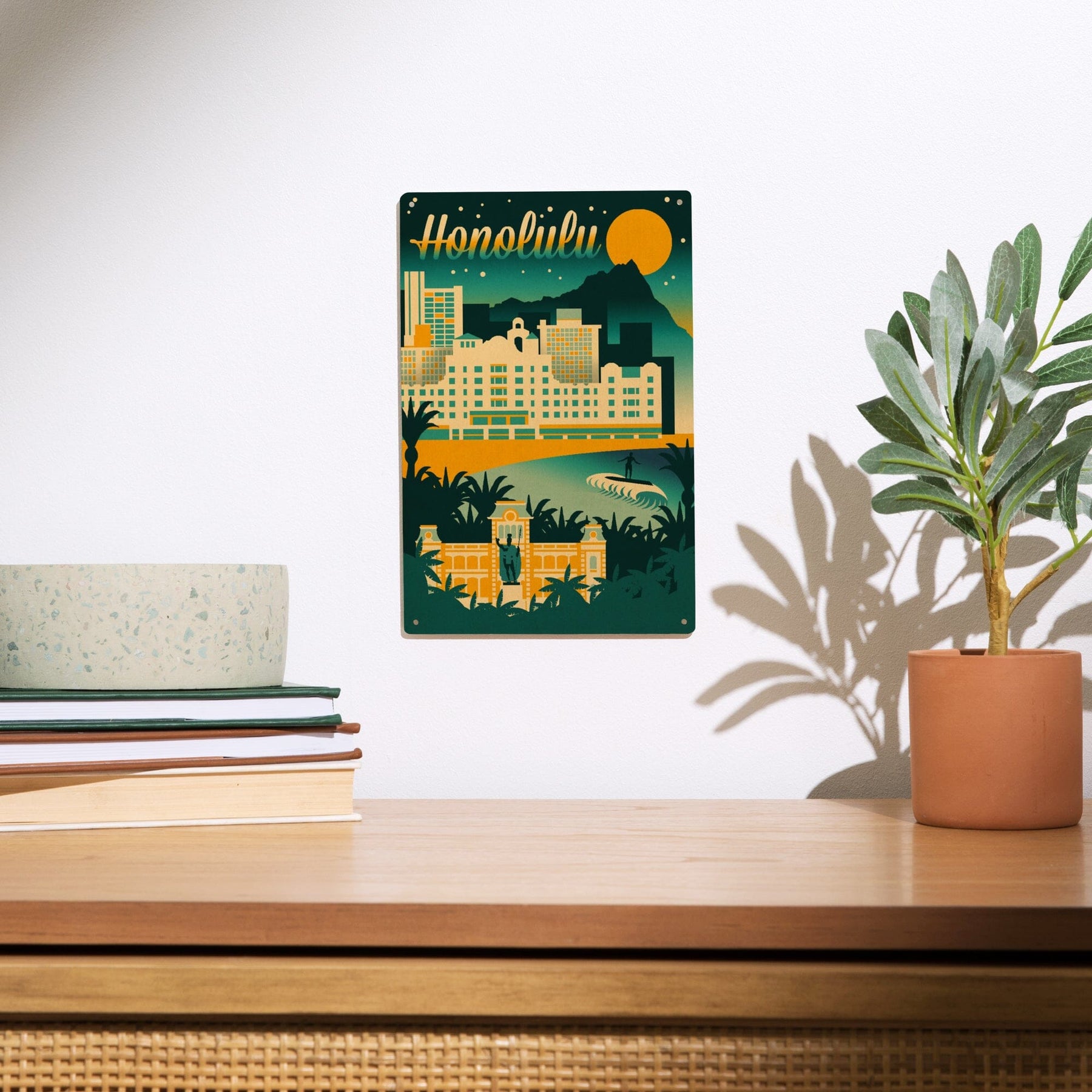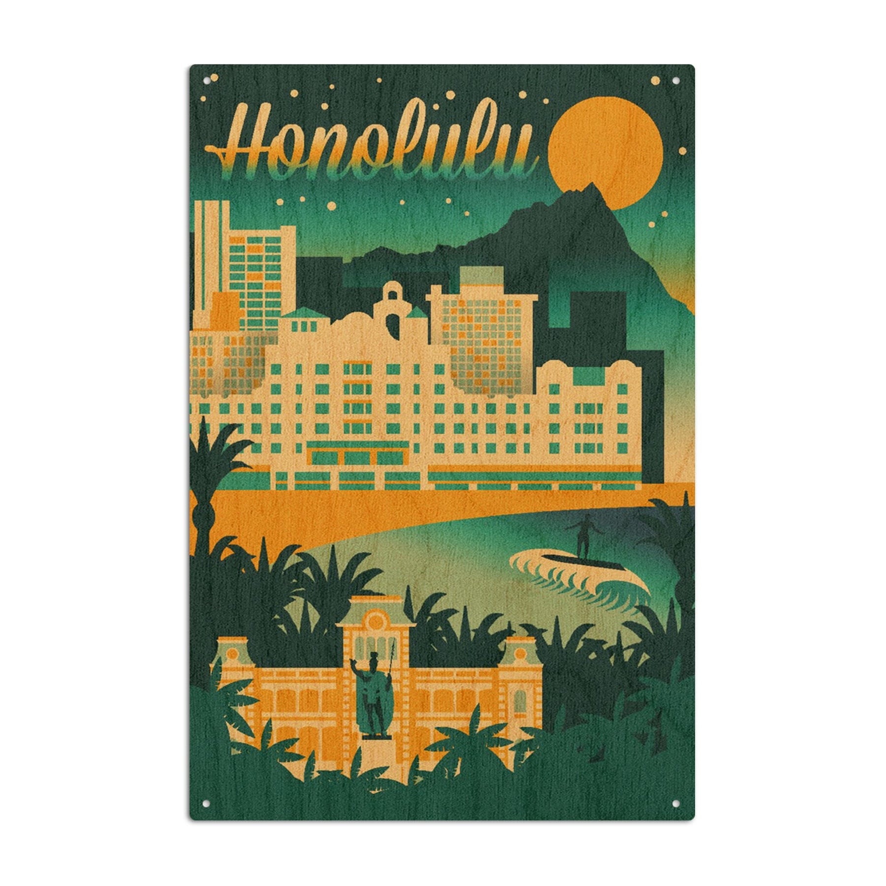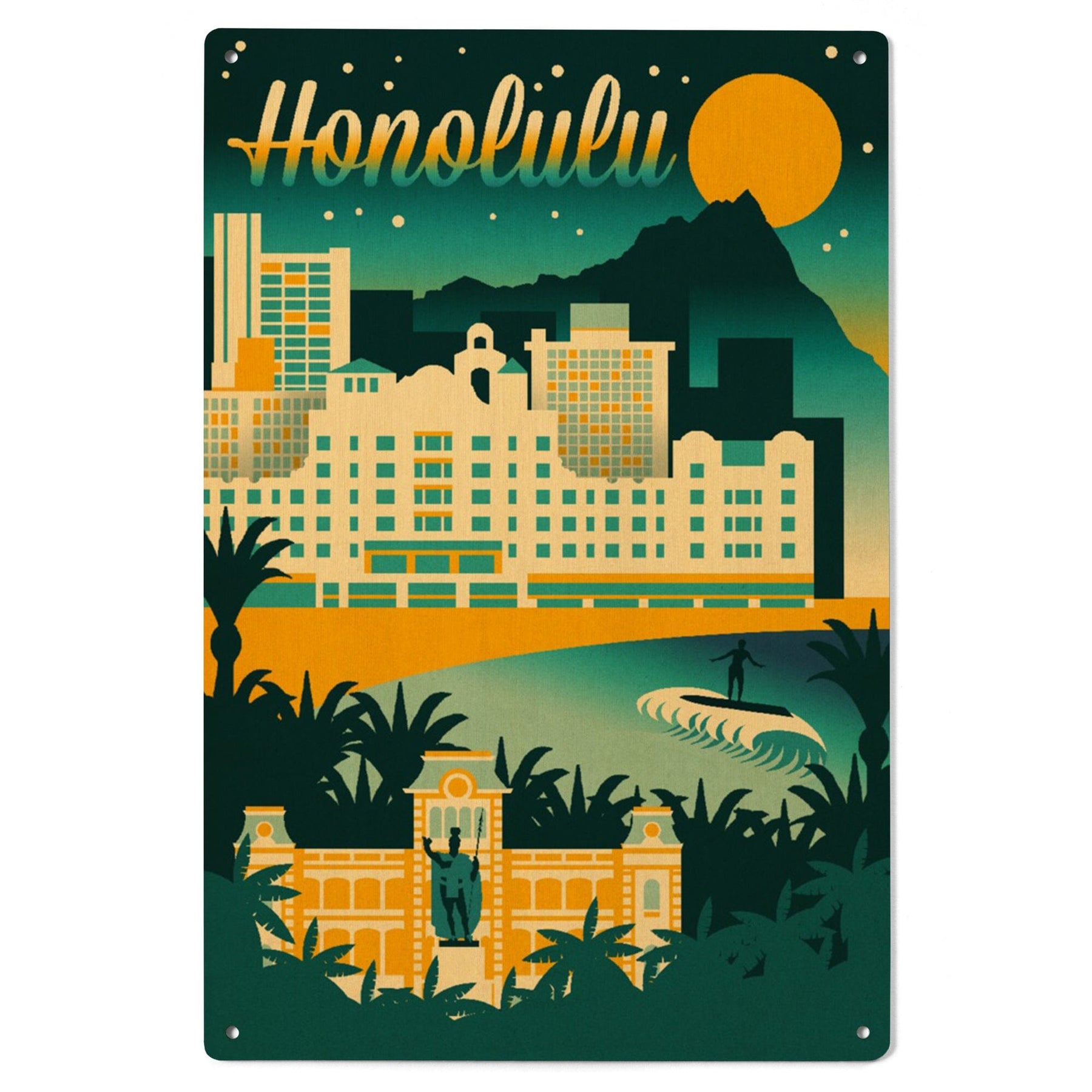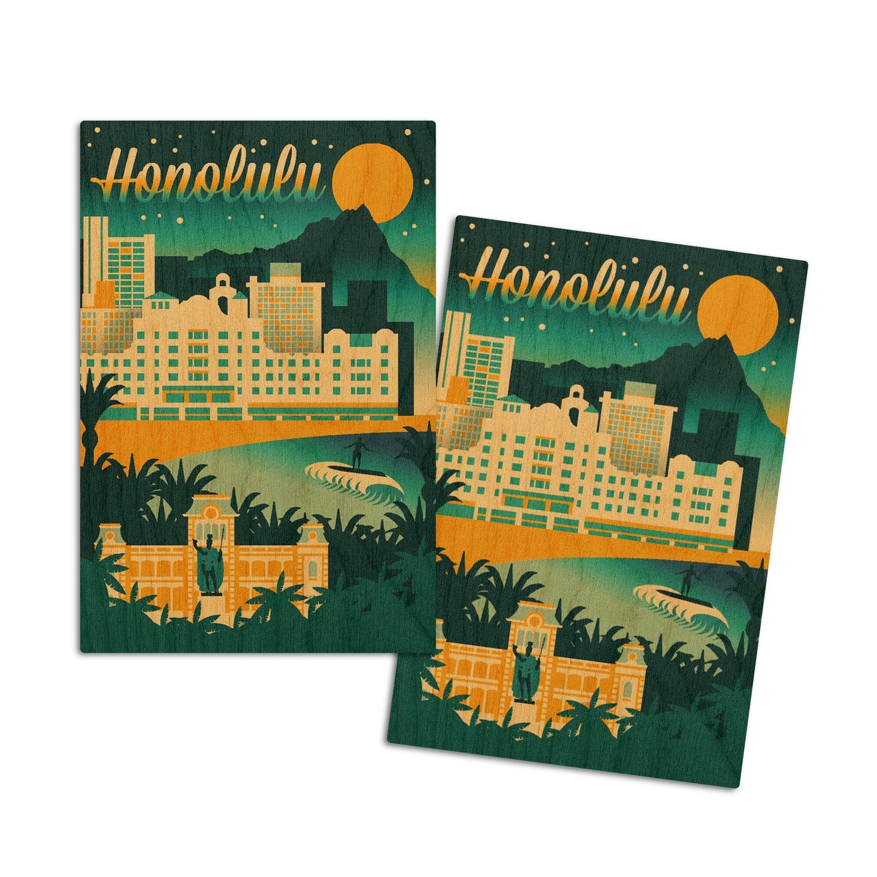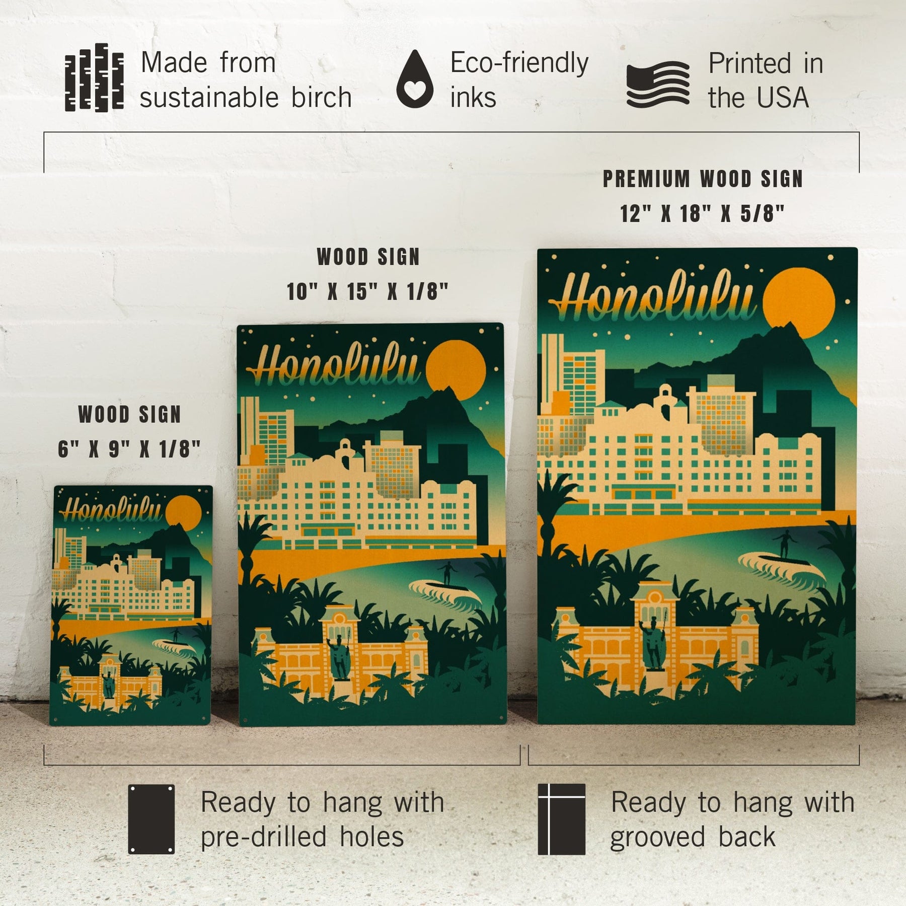 Honolulu, Hawaii, Retro Skyline Chromatic Series, Lantern Press Artwork, Wood Signs and Postcards