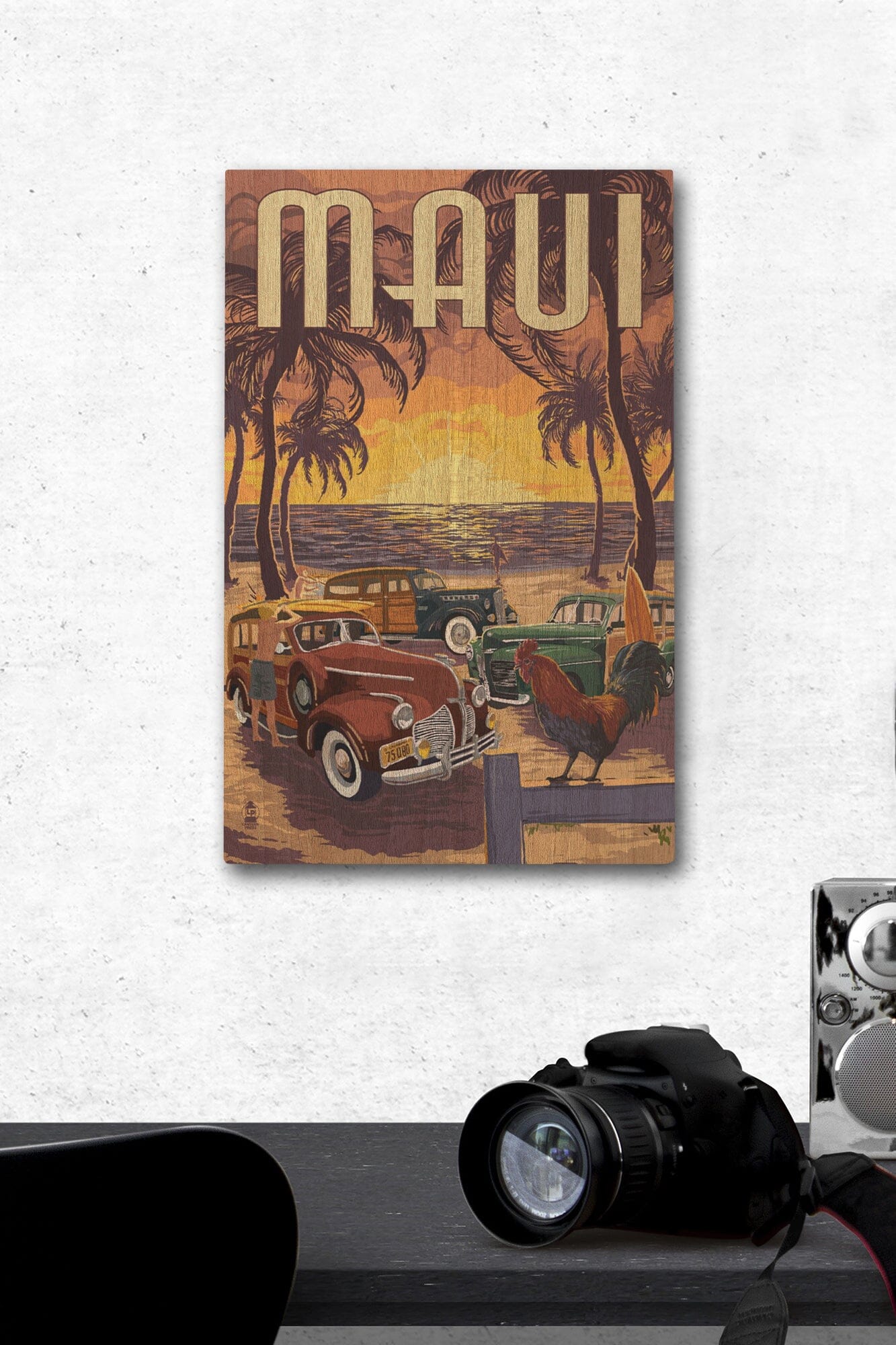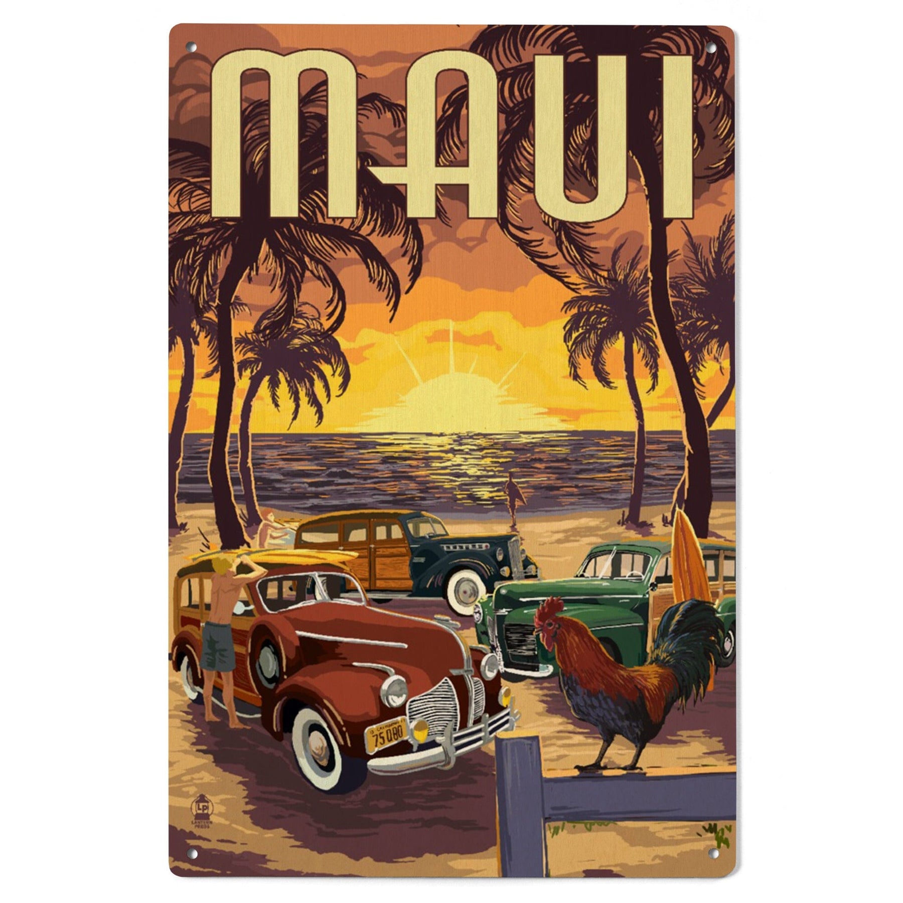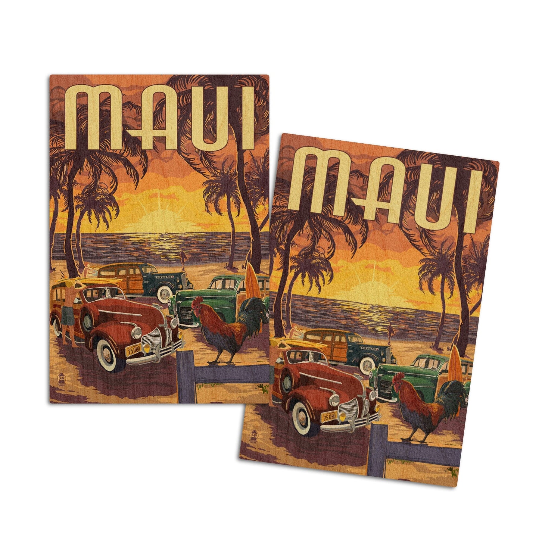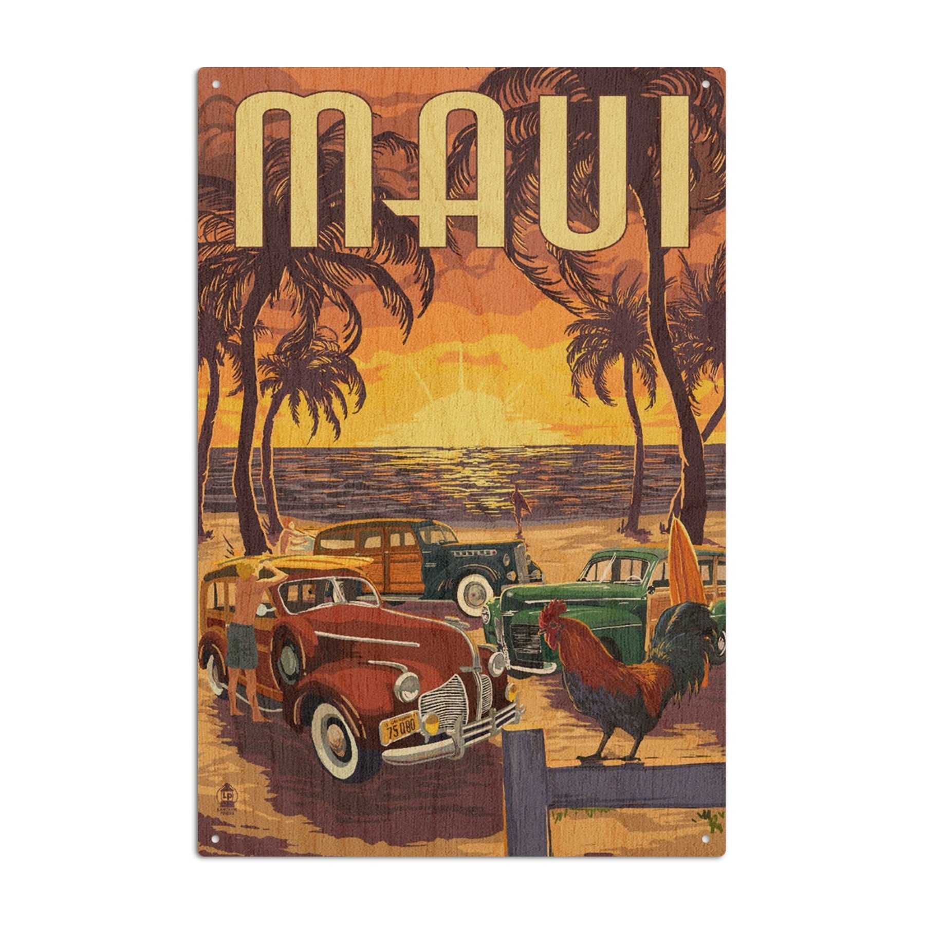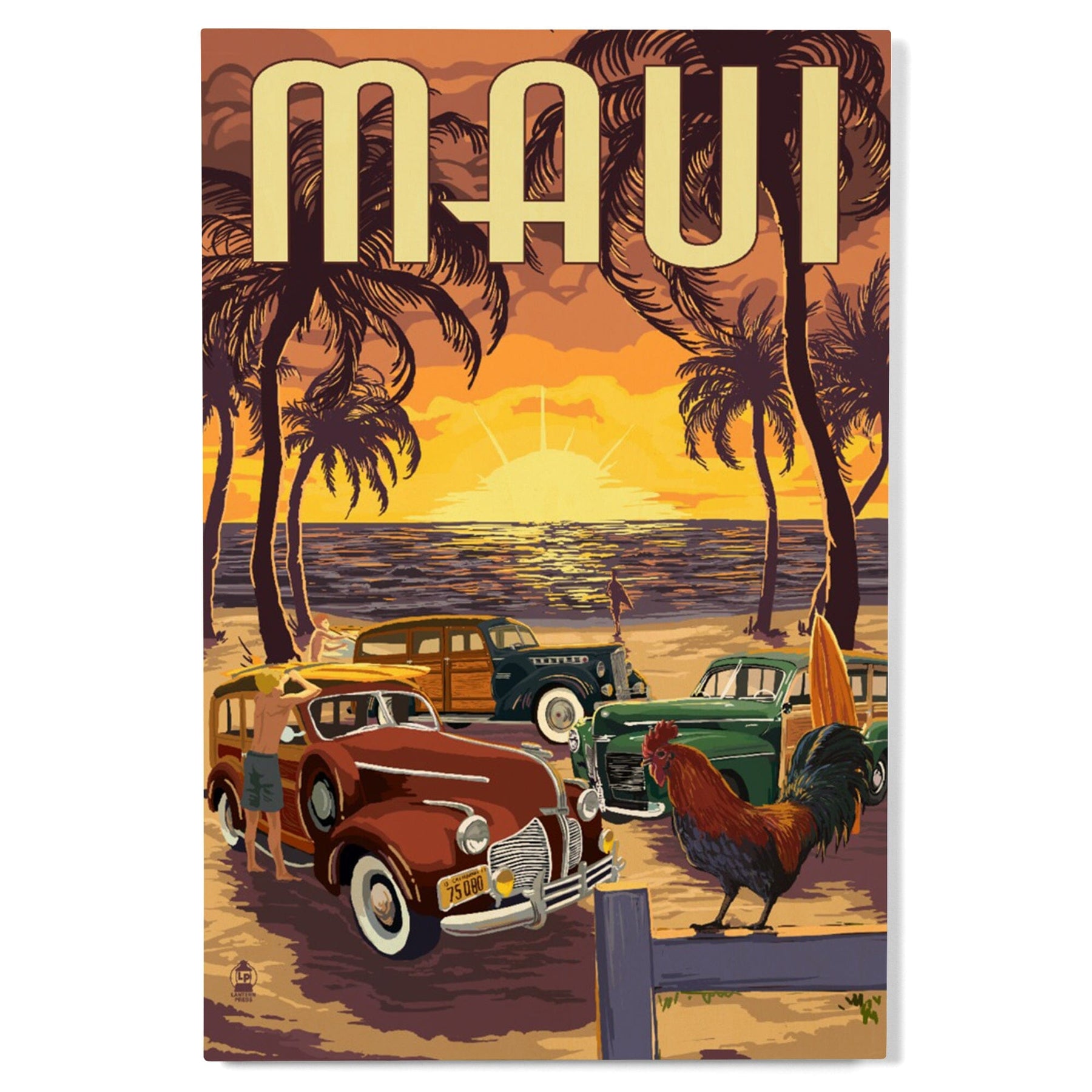 Maui, Hawaii, Woodies on the Beach with Rooster, Lantern Press Artwork, Wood Signs and Postcards