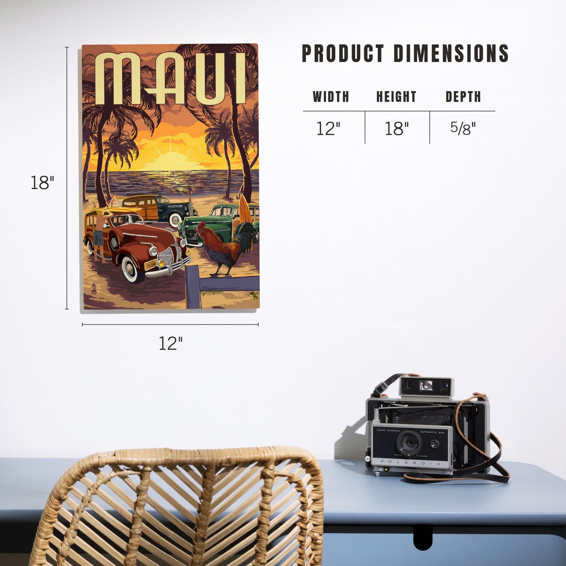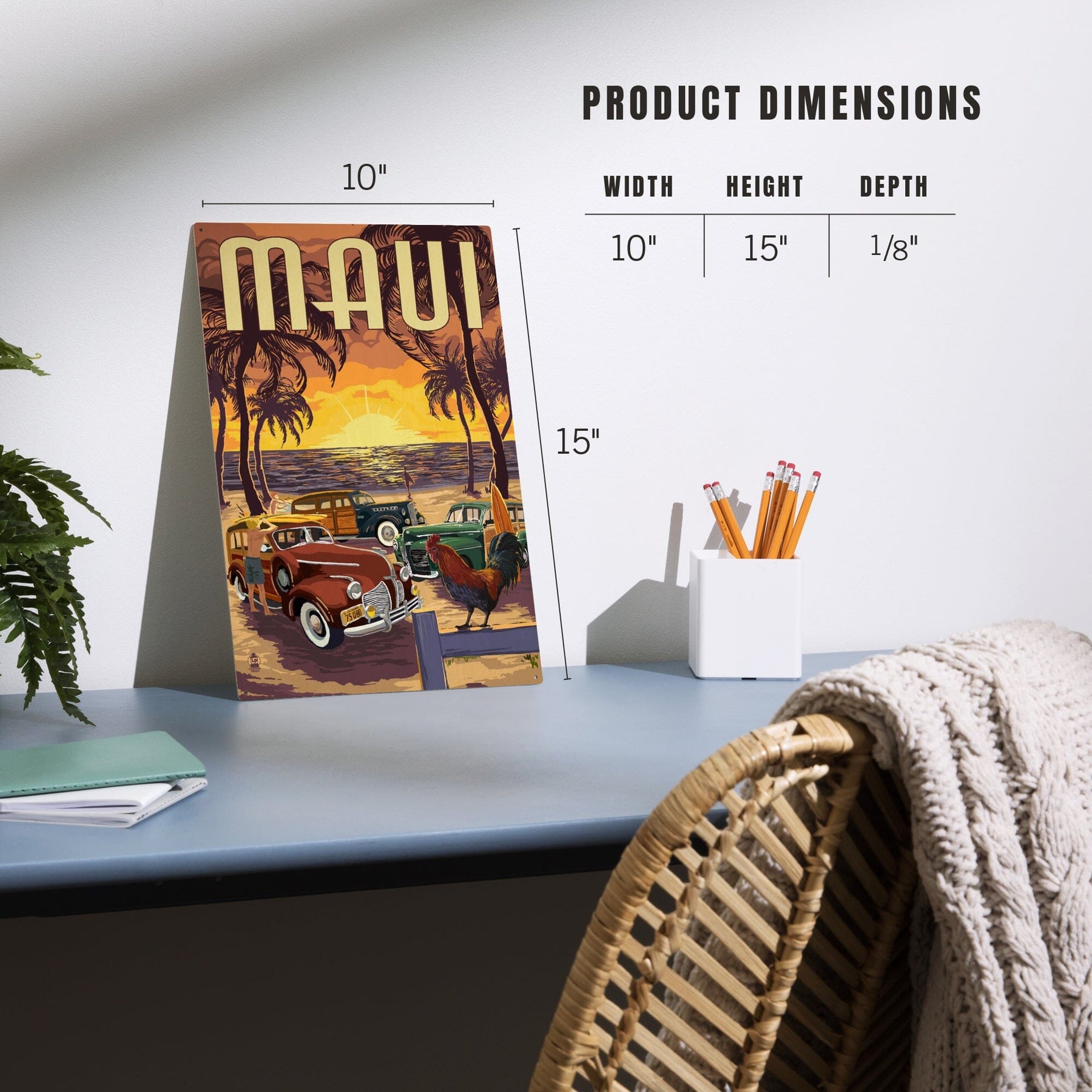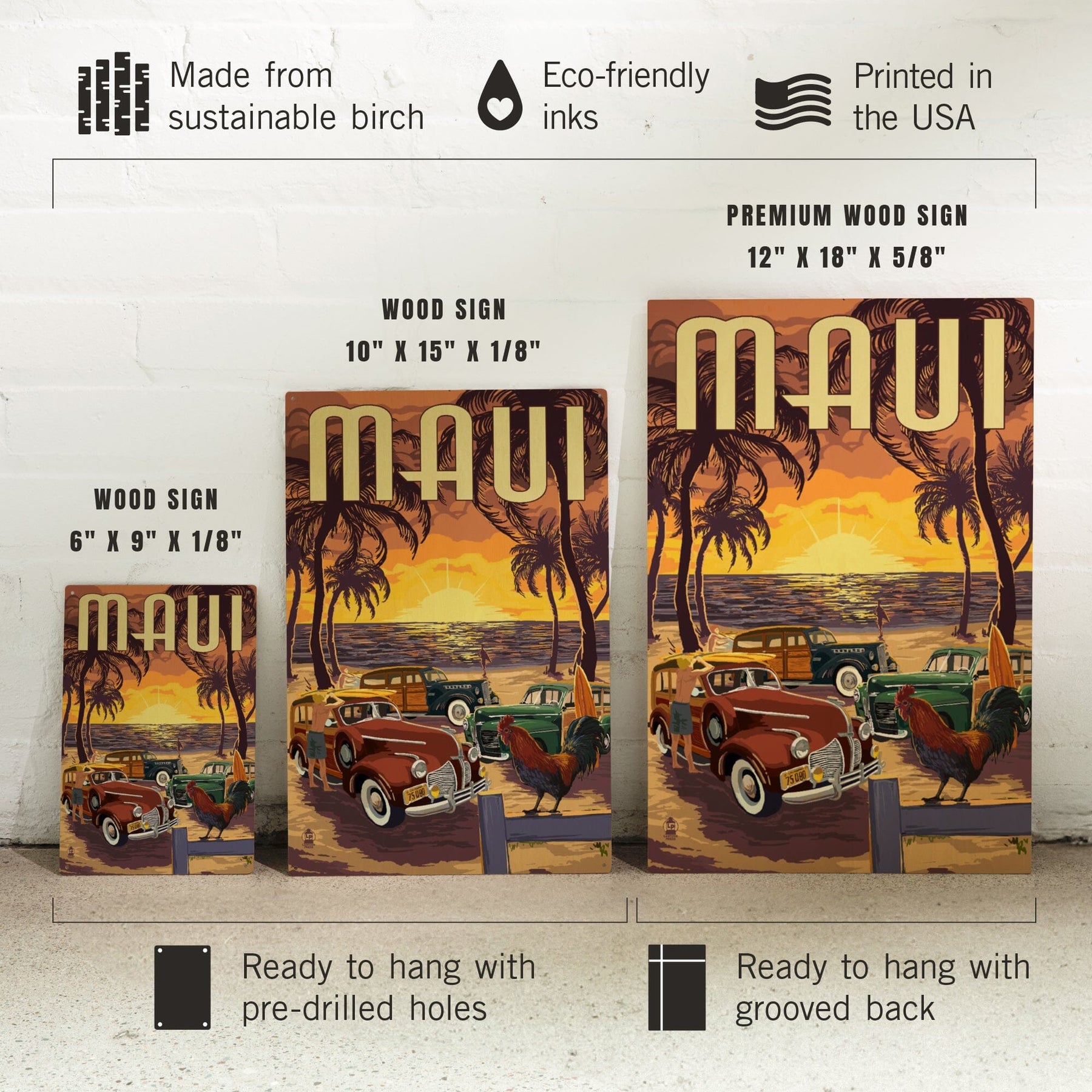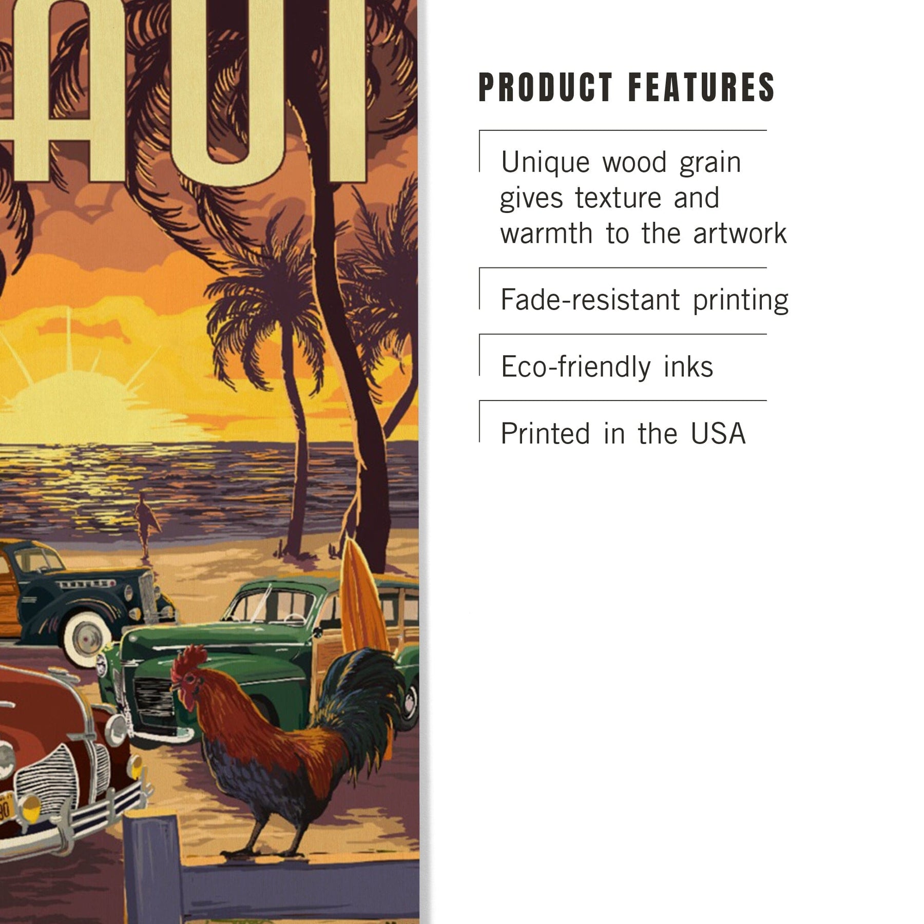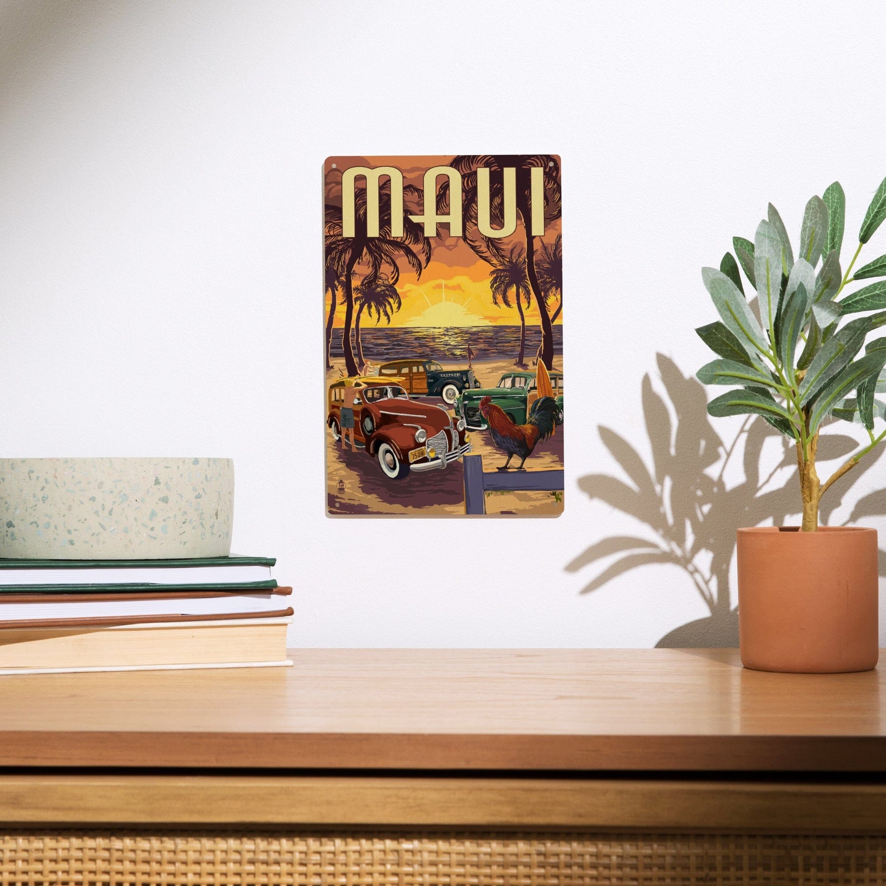 Maui, Hawaii, Woodies on the Beach with Rooster, Lantern Press Artwork, Wood Signs and Postcards