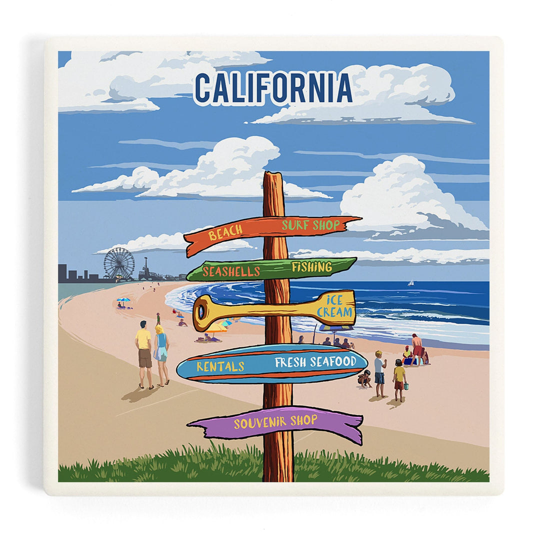 California, Signpost, Coast Beach with Pier, Coasters Coasters Lantern Press