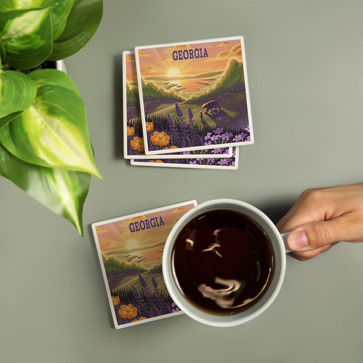 Georgia, Lithograph, Bear and Spring Flowers, Lake, Coasters Coasters Lantern Press