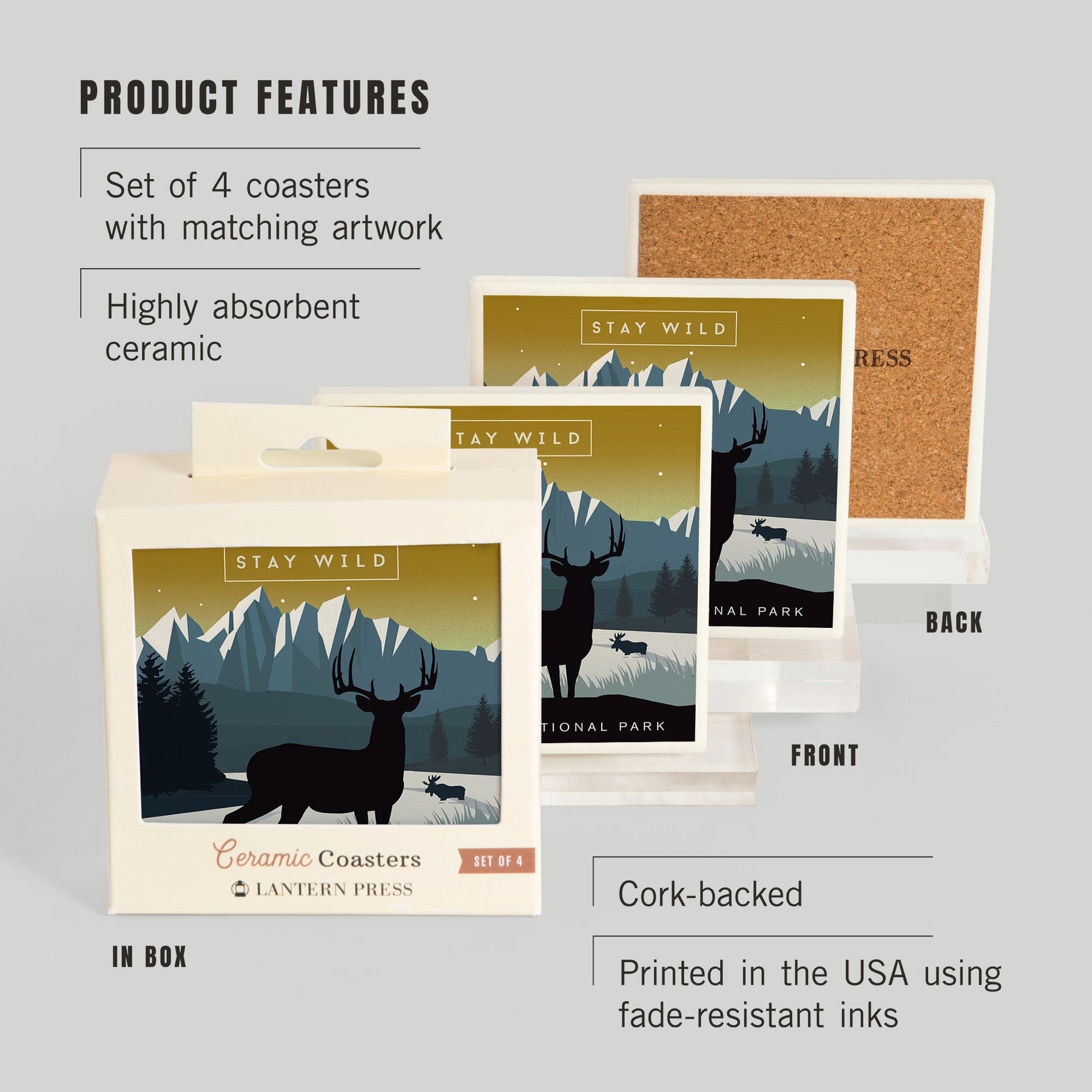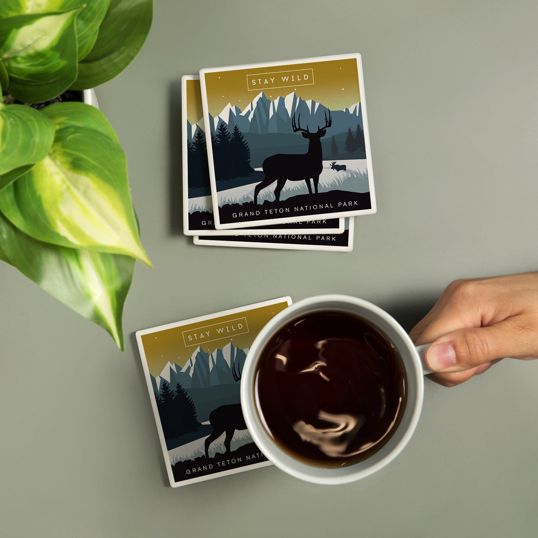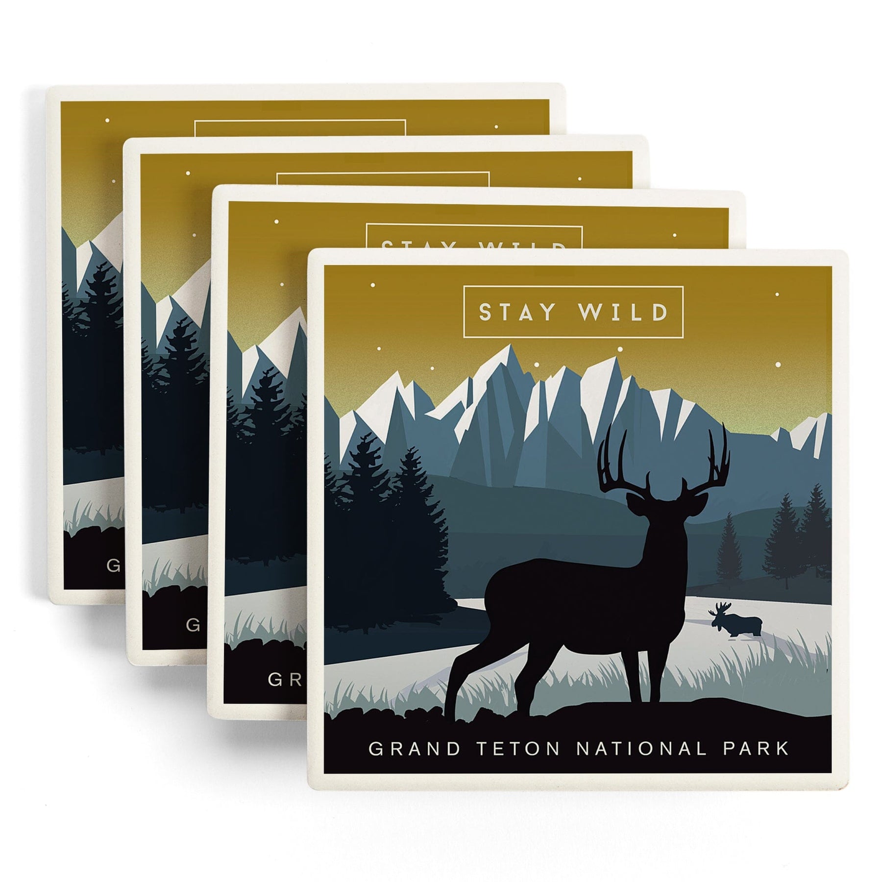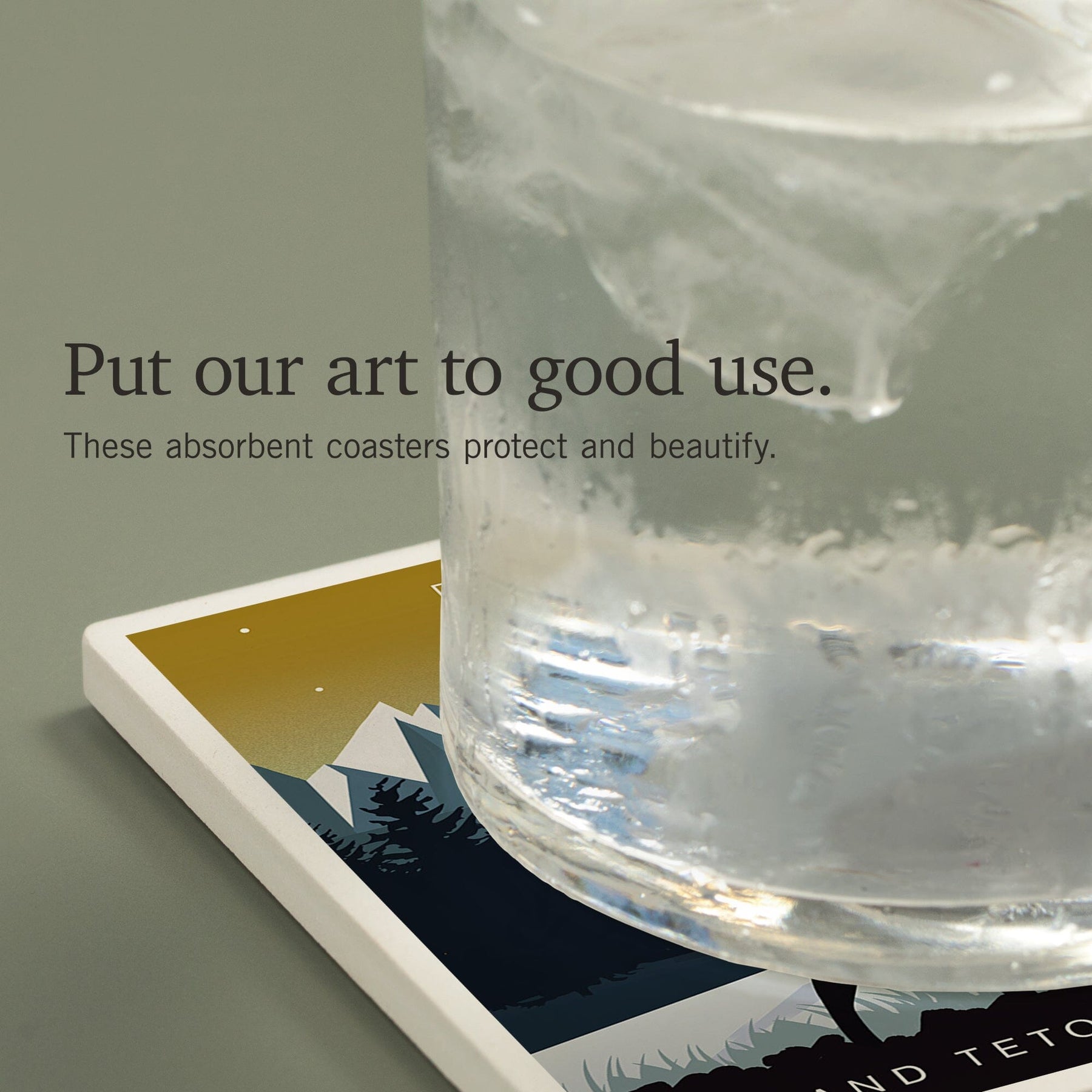 Grand Teton National Park, Wyoming, Animal Silhouettes, Yellow and Blue, Coasters