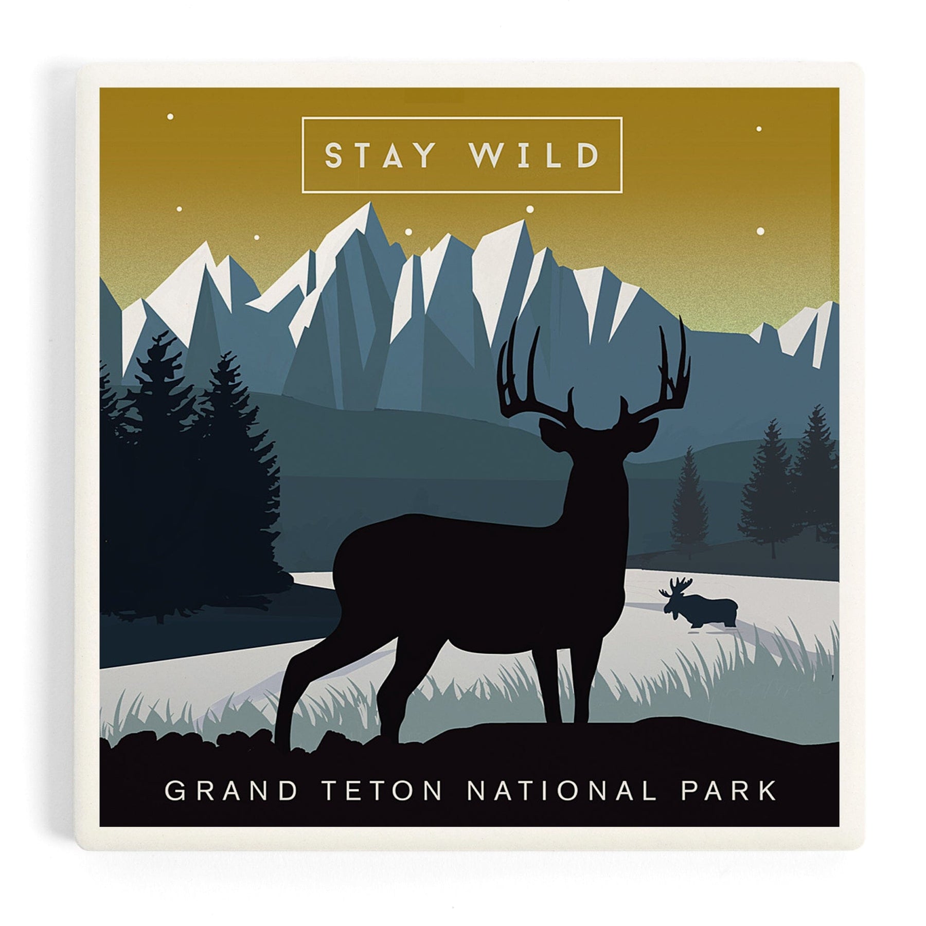 Grand Teton National Park, Wyoming, Animal Silhouettes, Yellow and Blue, Coasters Coasters Lantern Press