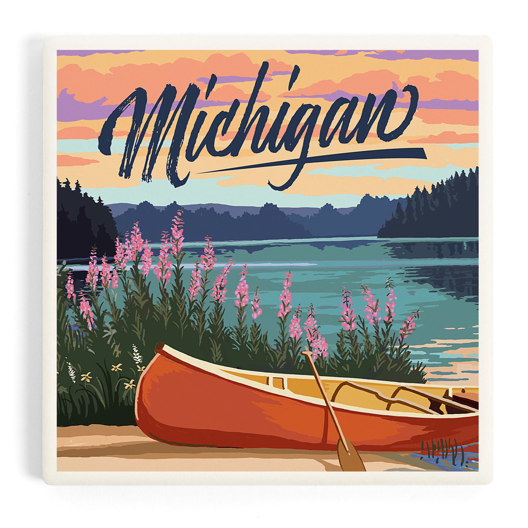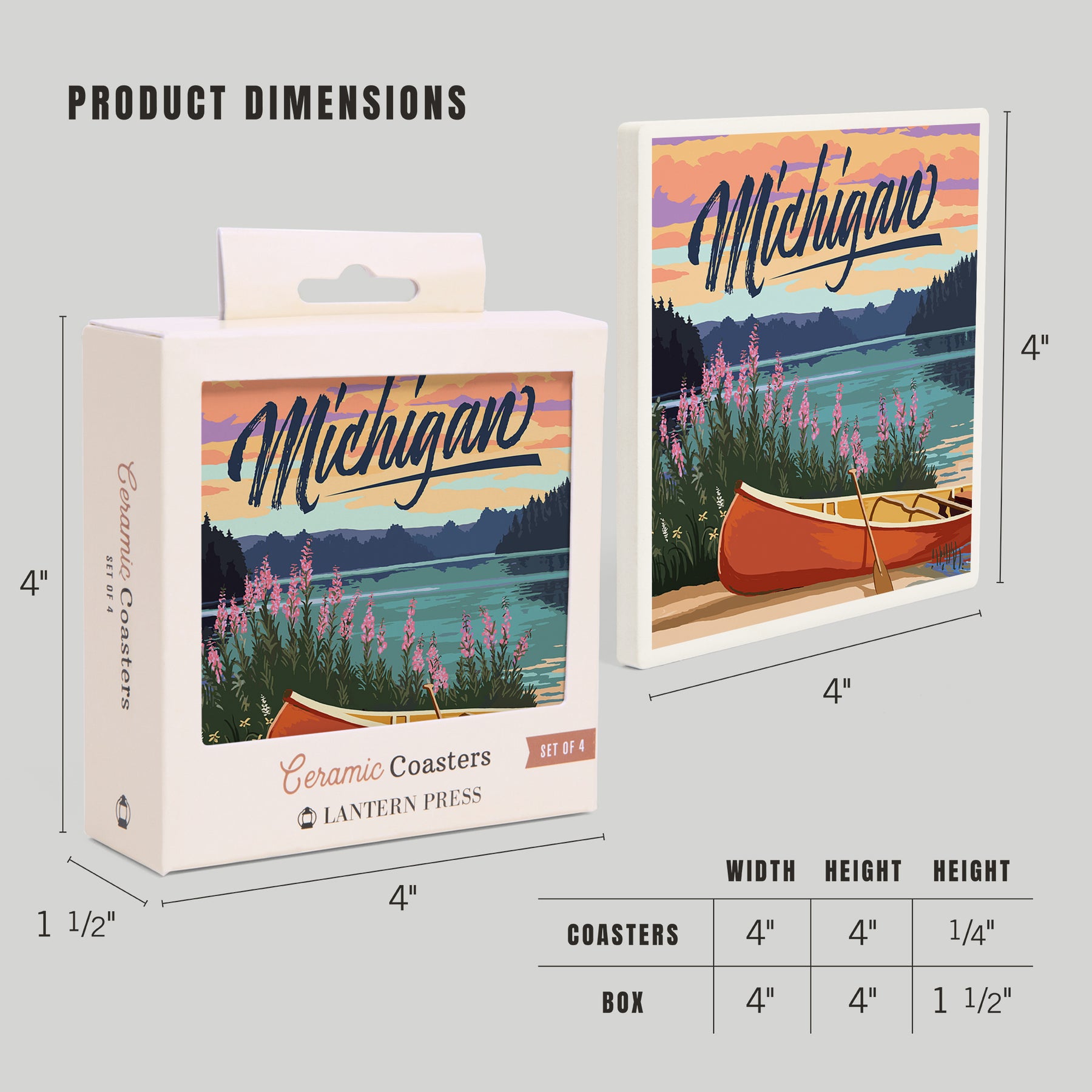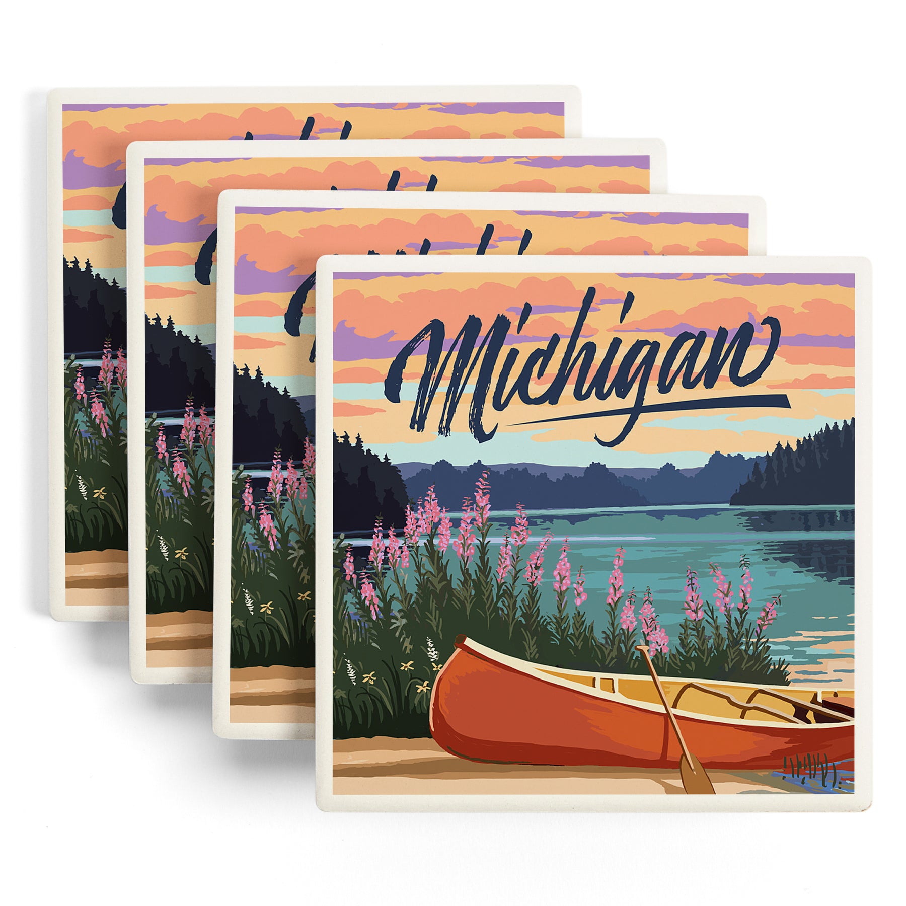 Michigan, Canoe and Lake Scene, Coasters Coasters Lantern Press
