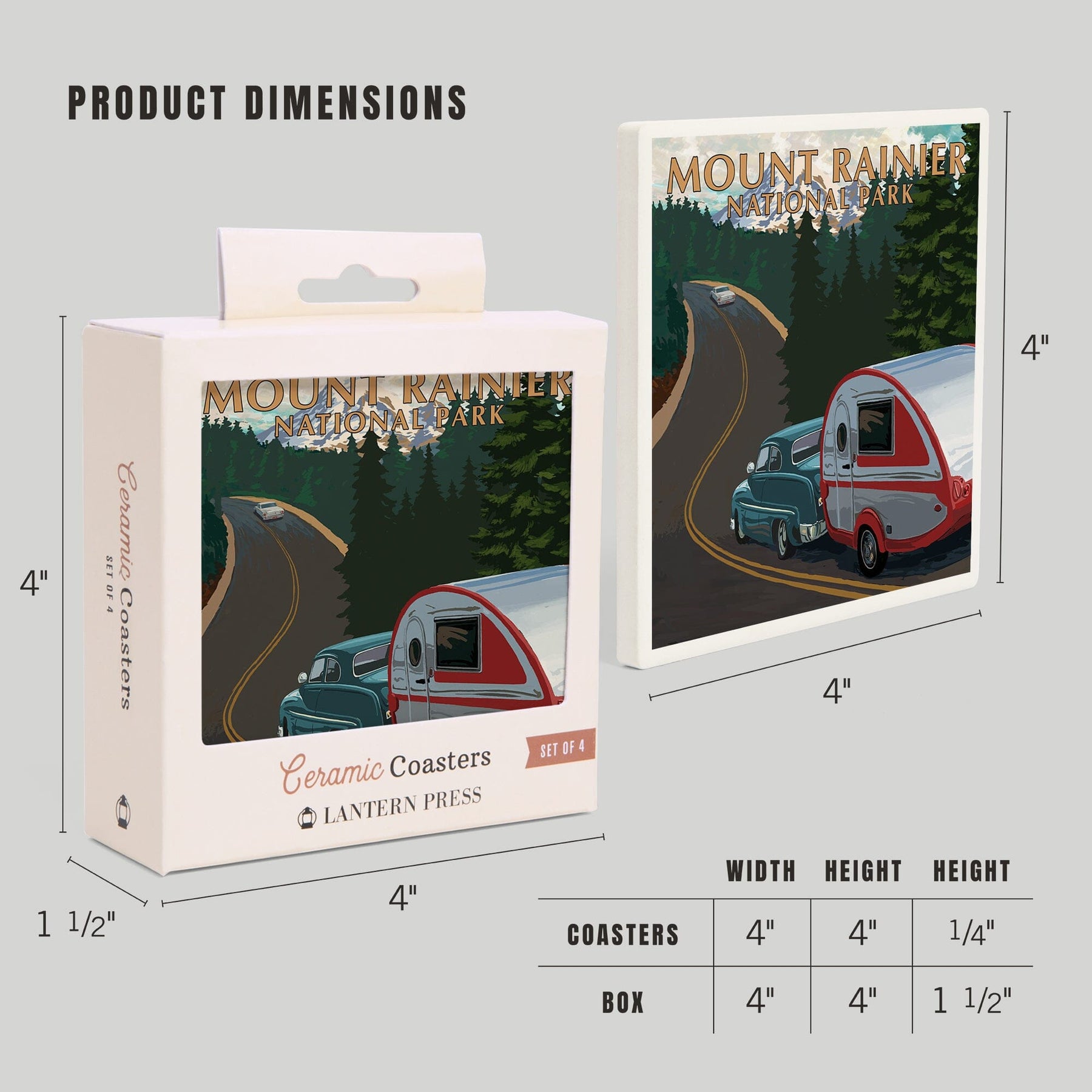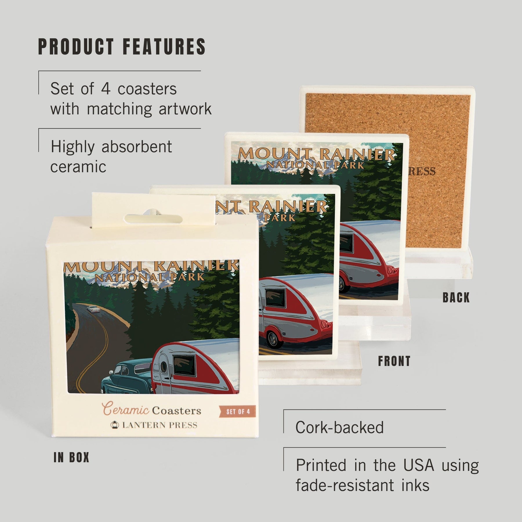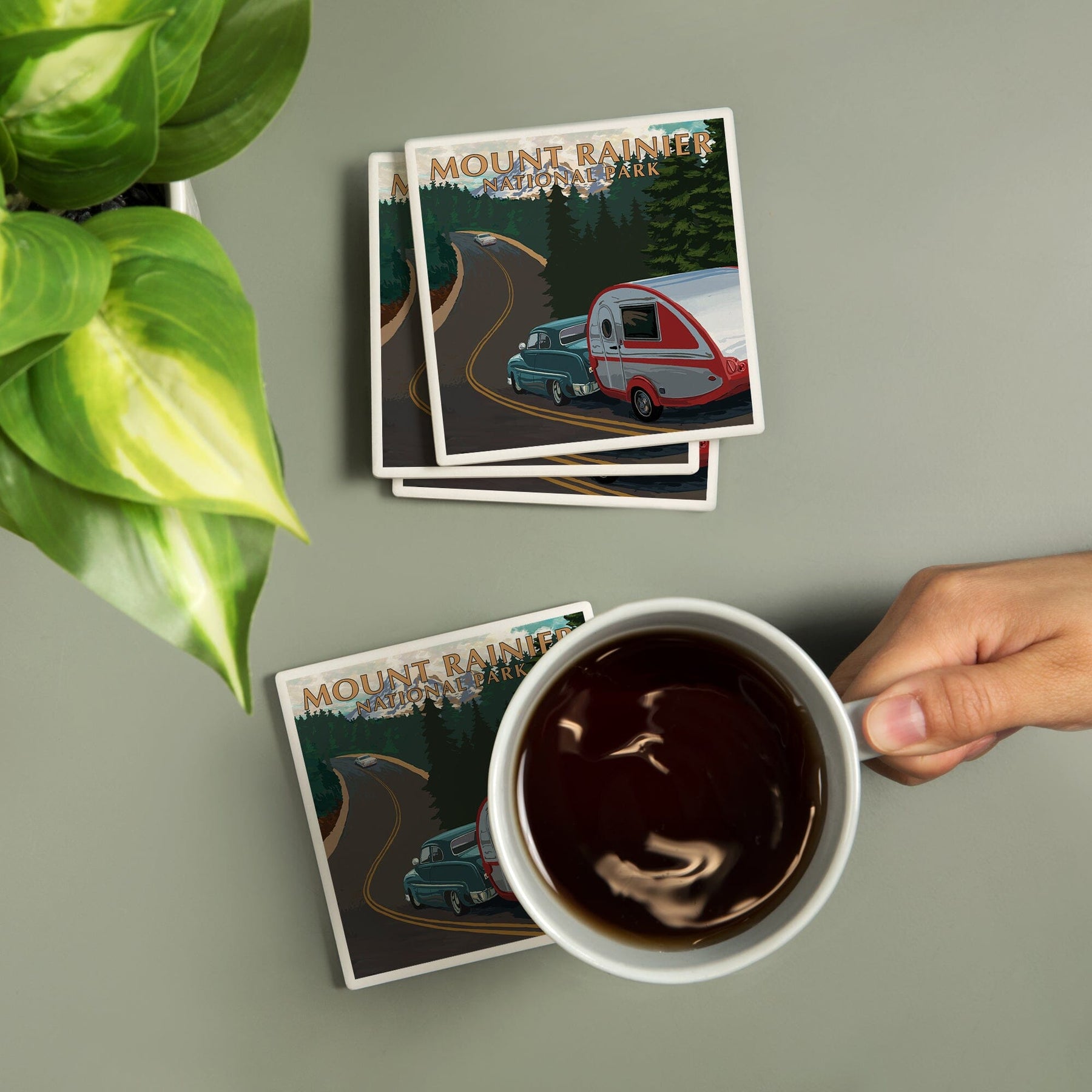Mount Rainier National Park, Washington, Retro Camper on Road, Coasters