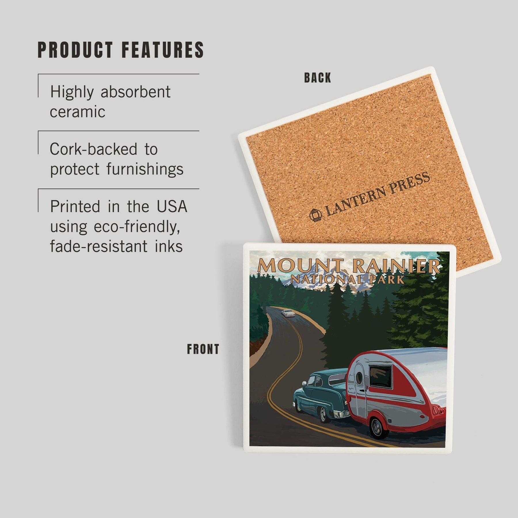 Mount Rainier National Park, Washington, Retro Camper on Road, Coasters Coasters Lantern Press