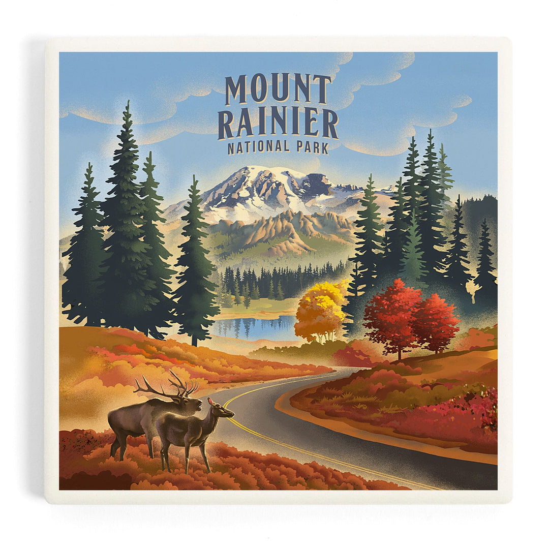 Mt Rainier National Park, Washington, Lithograph, Paradise Road with Elk, Coasters Coasters Lantern Press