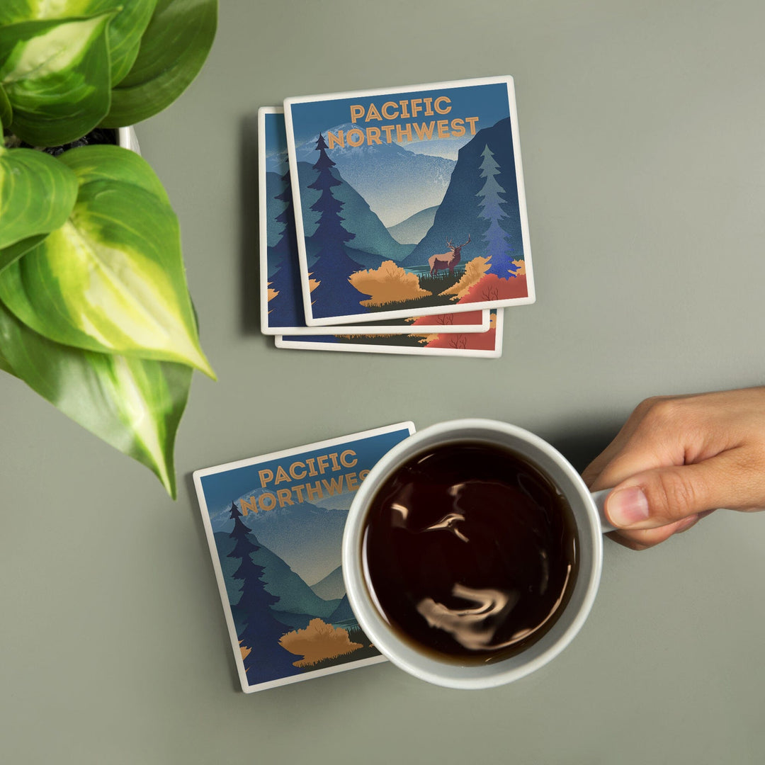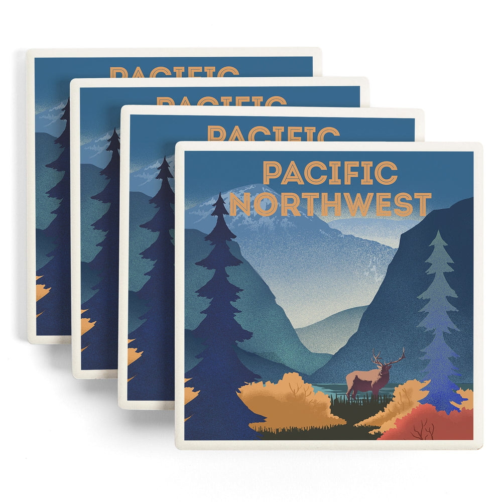 Pacific Northwest, Lithograph, Elk and Mountains Scene, Coasters