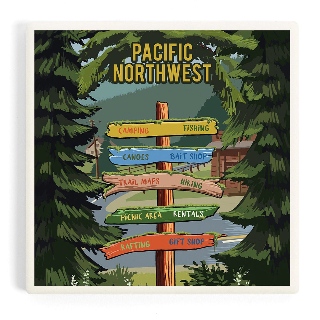 Pacific Northwest, Signpost, Forest and Camp, Coasters Coasters Lantern Press