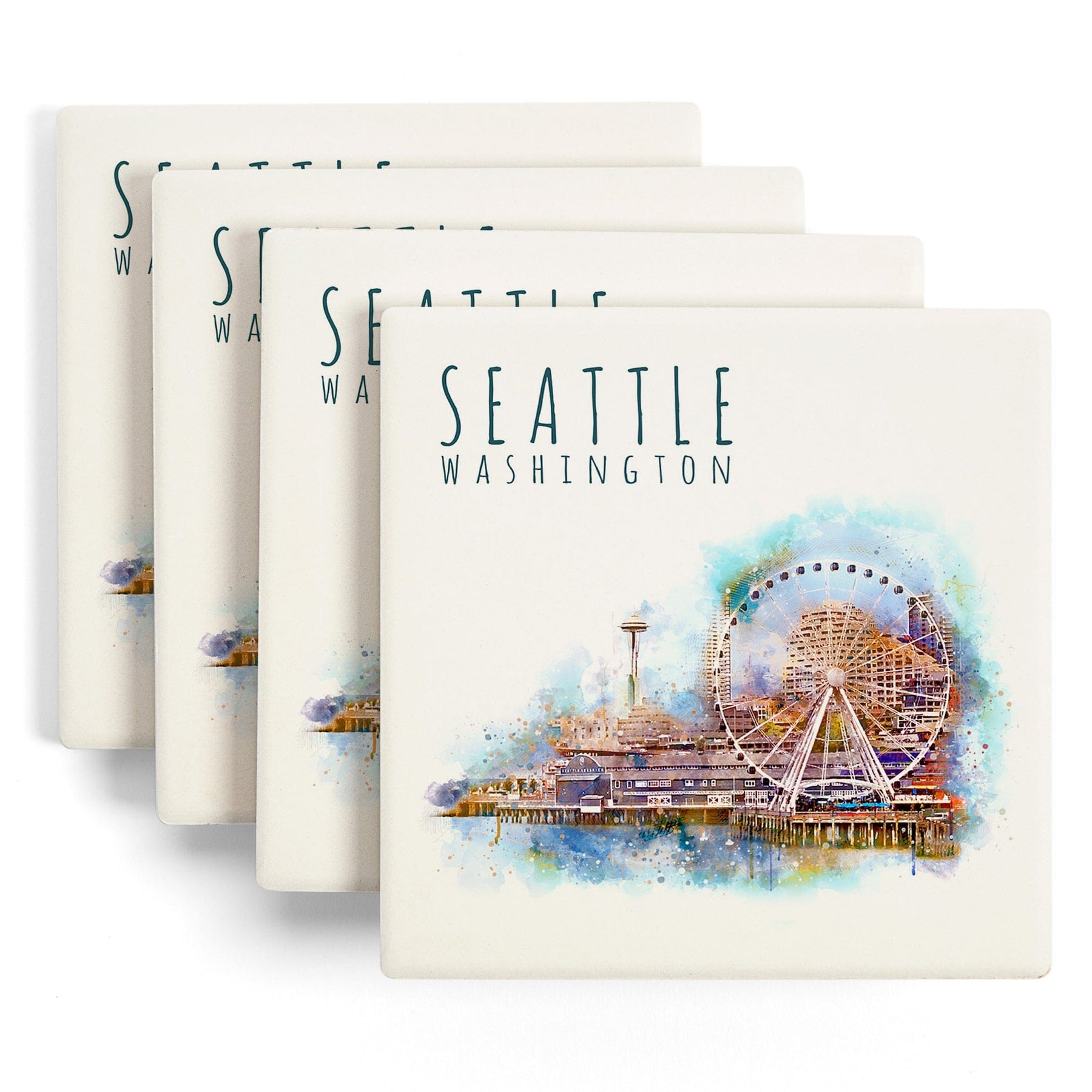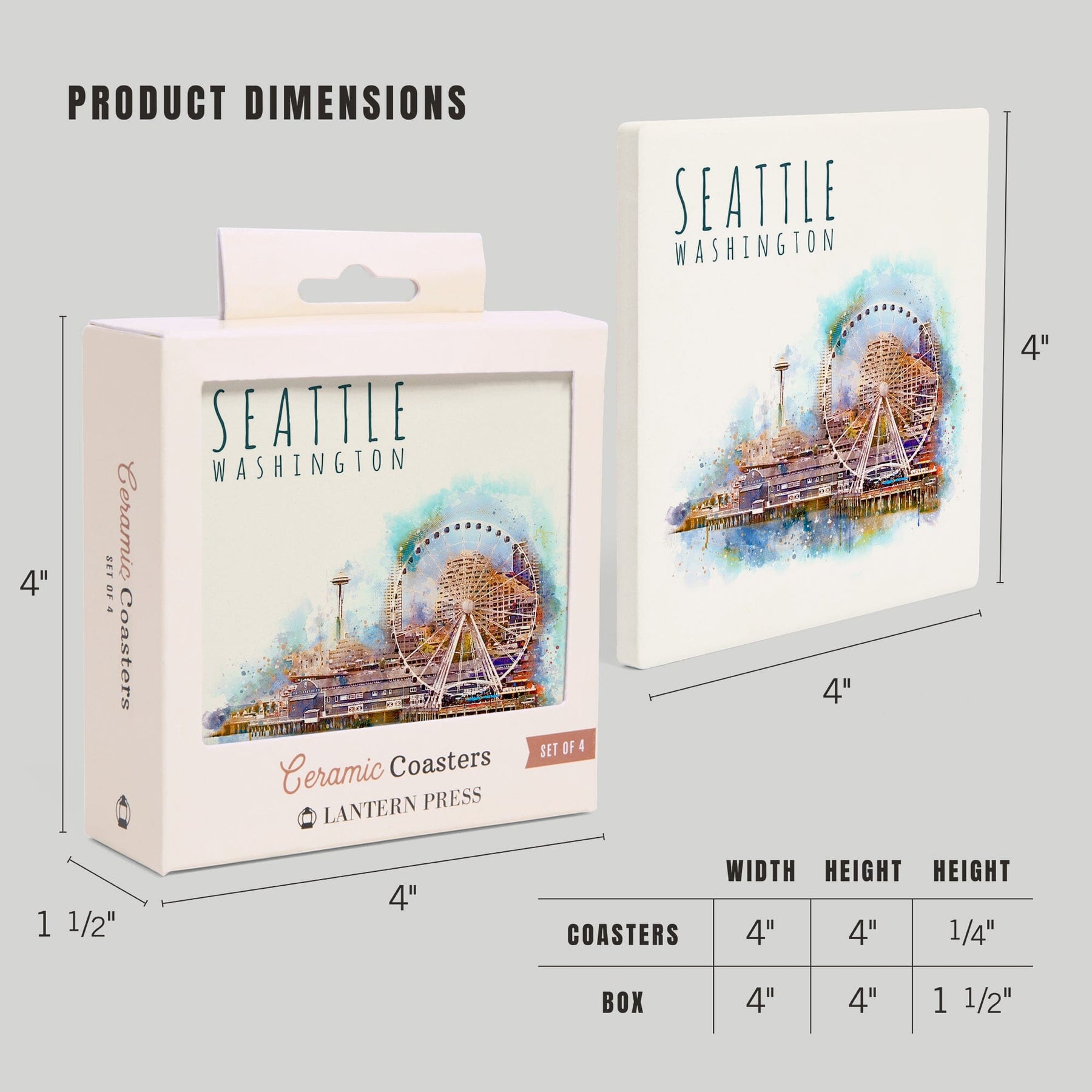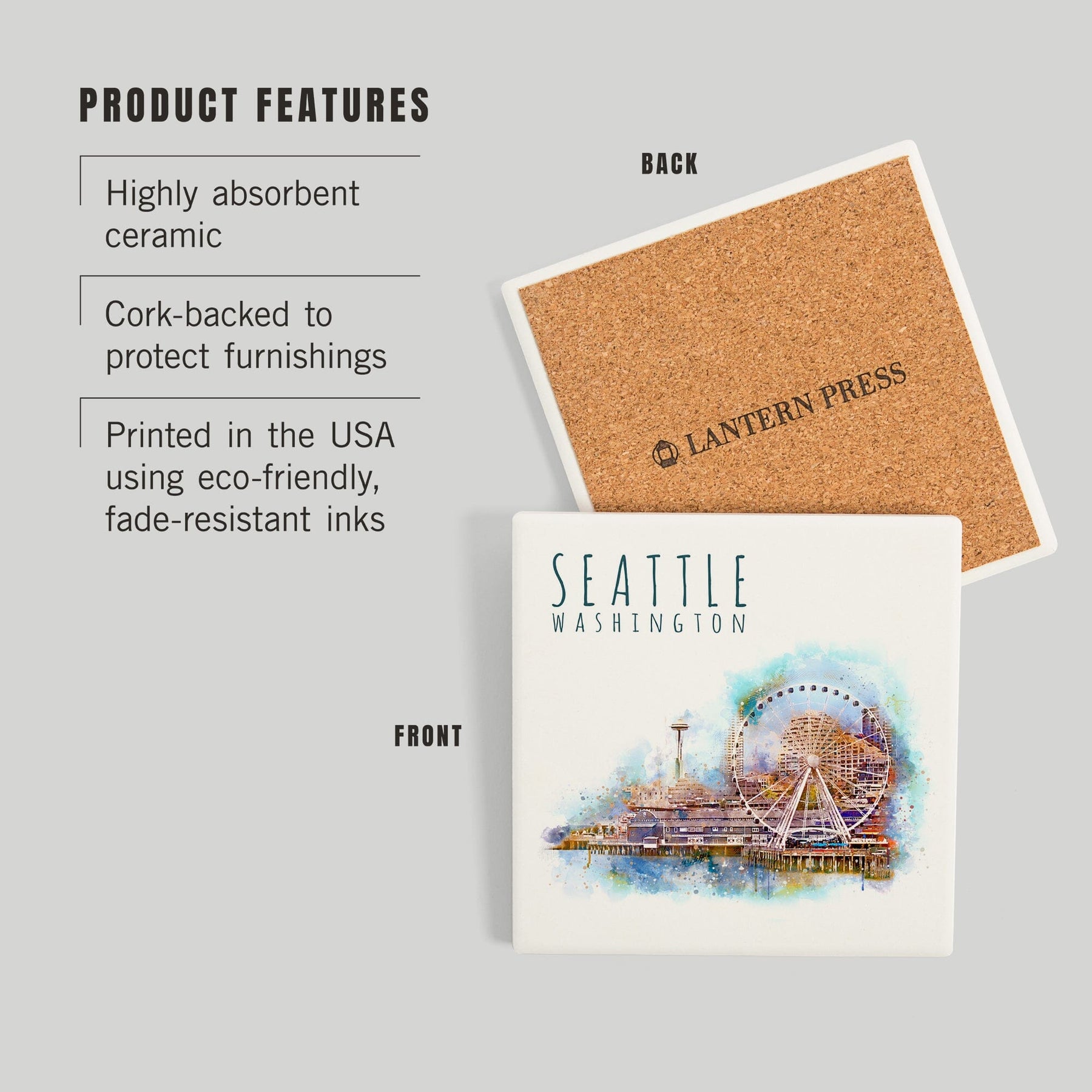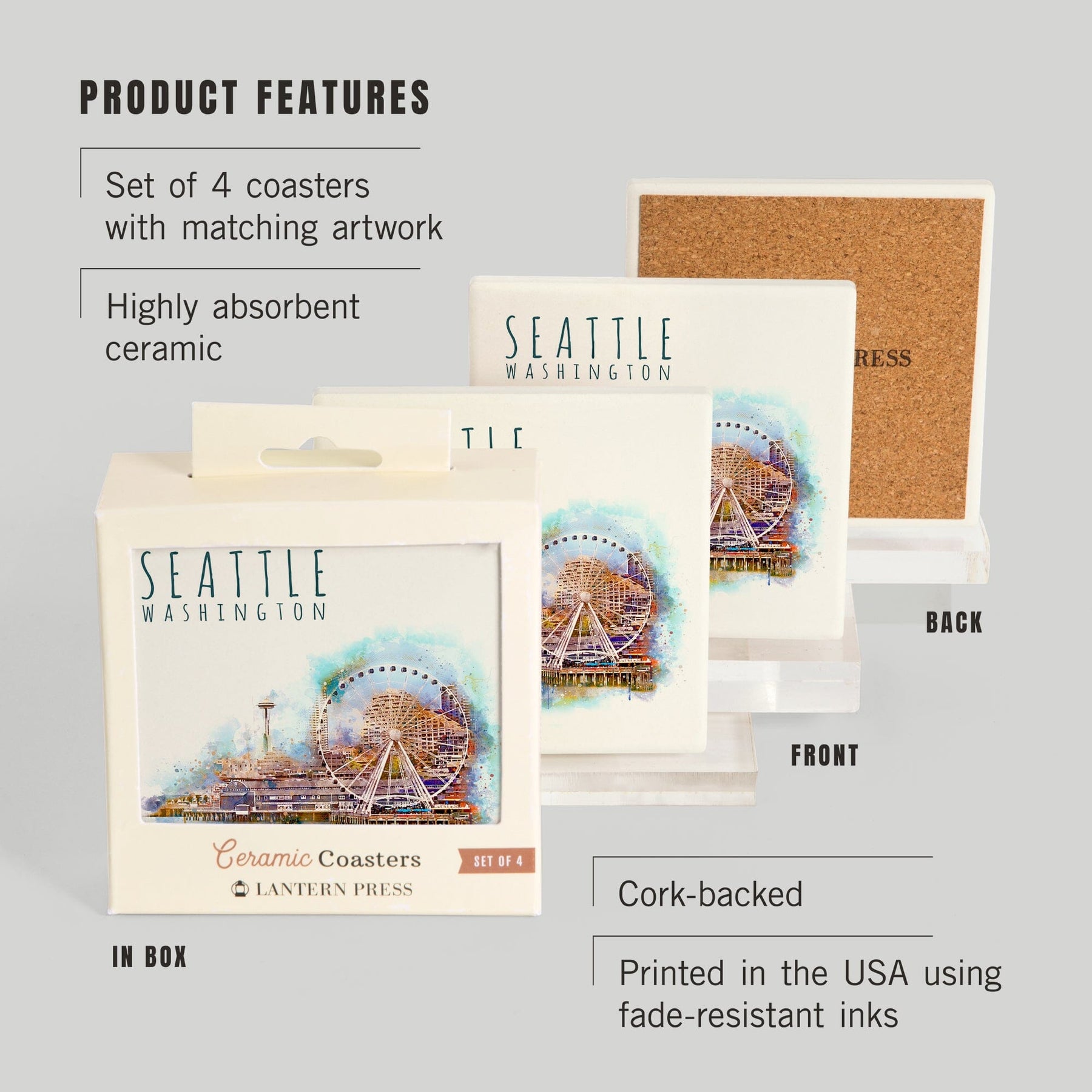 Seattle Skyline, Ferris Wheel, Watercolor, Coasters Coasters Lantern Press