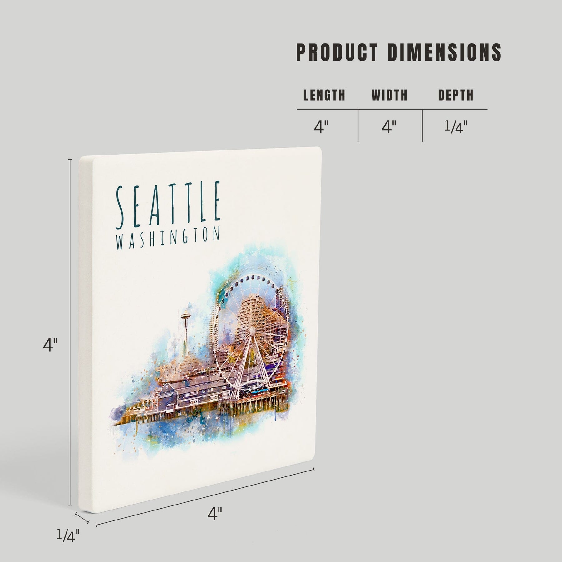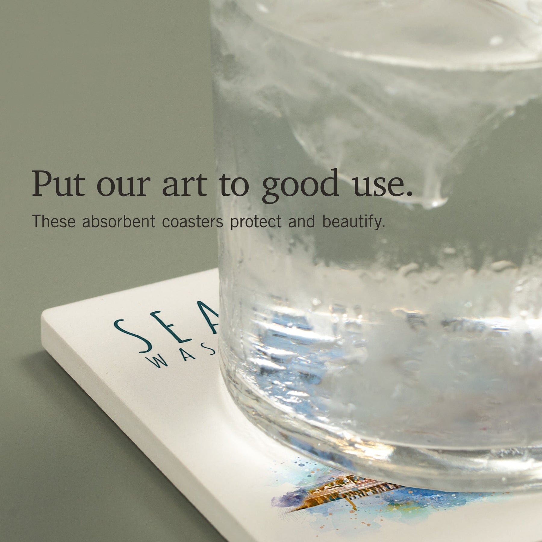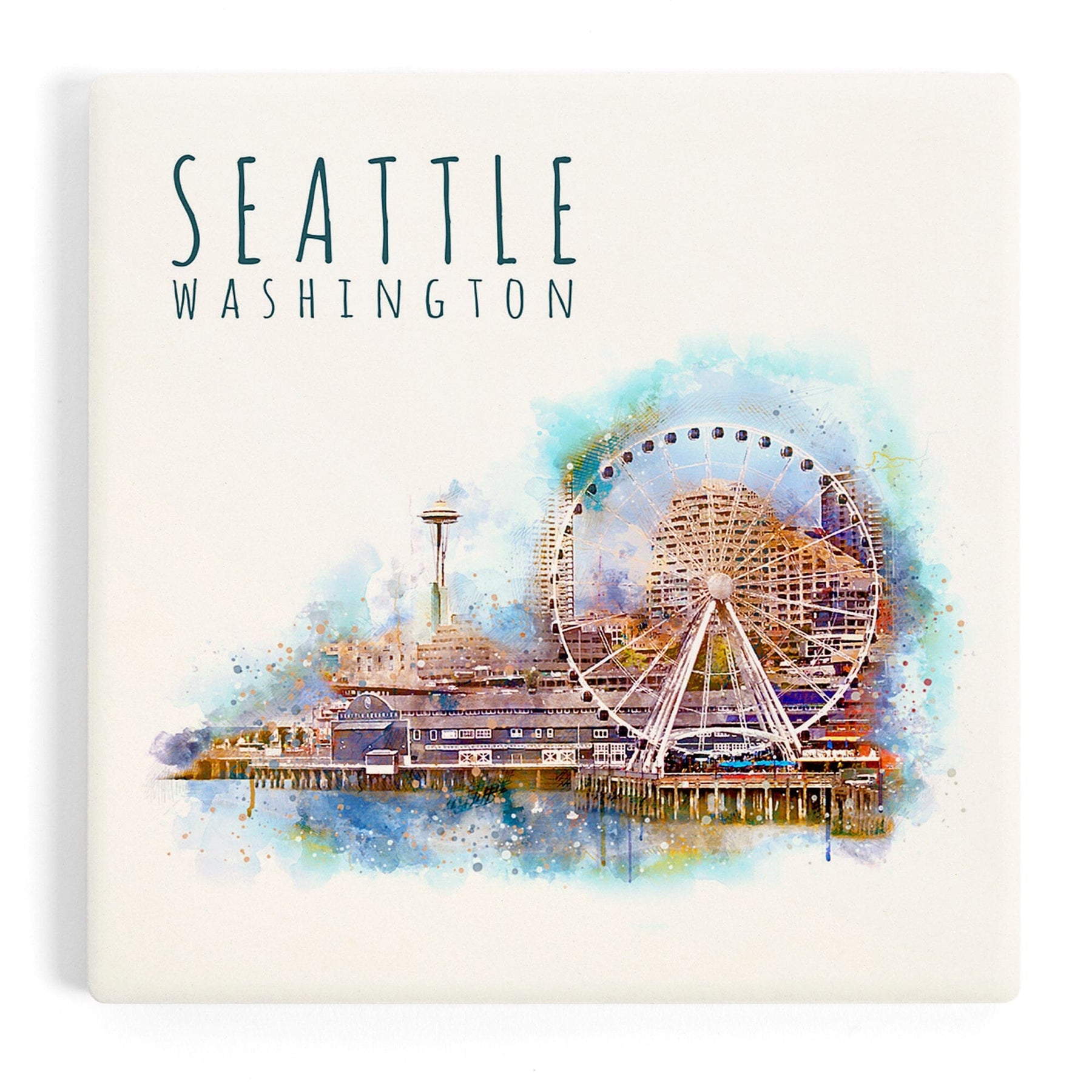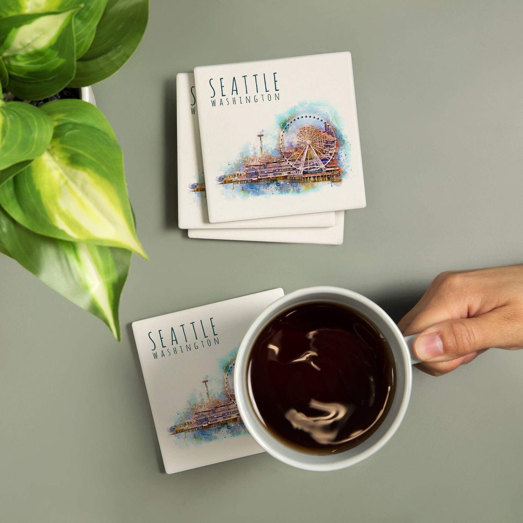 Seattle Skyline, Ferris Wheel, Watercolor, Coasters Coasters Lantern Press