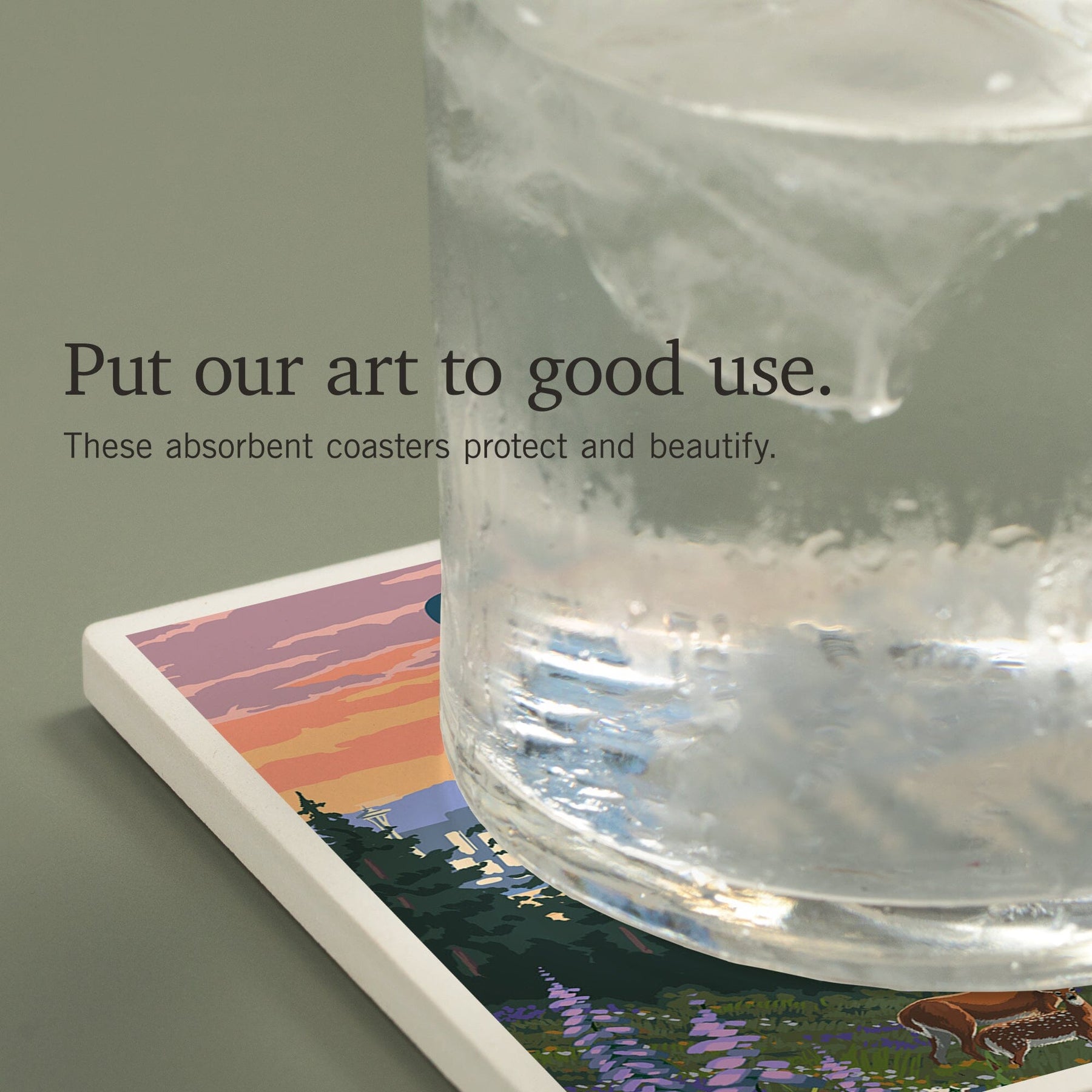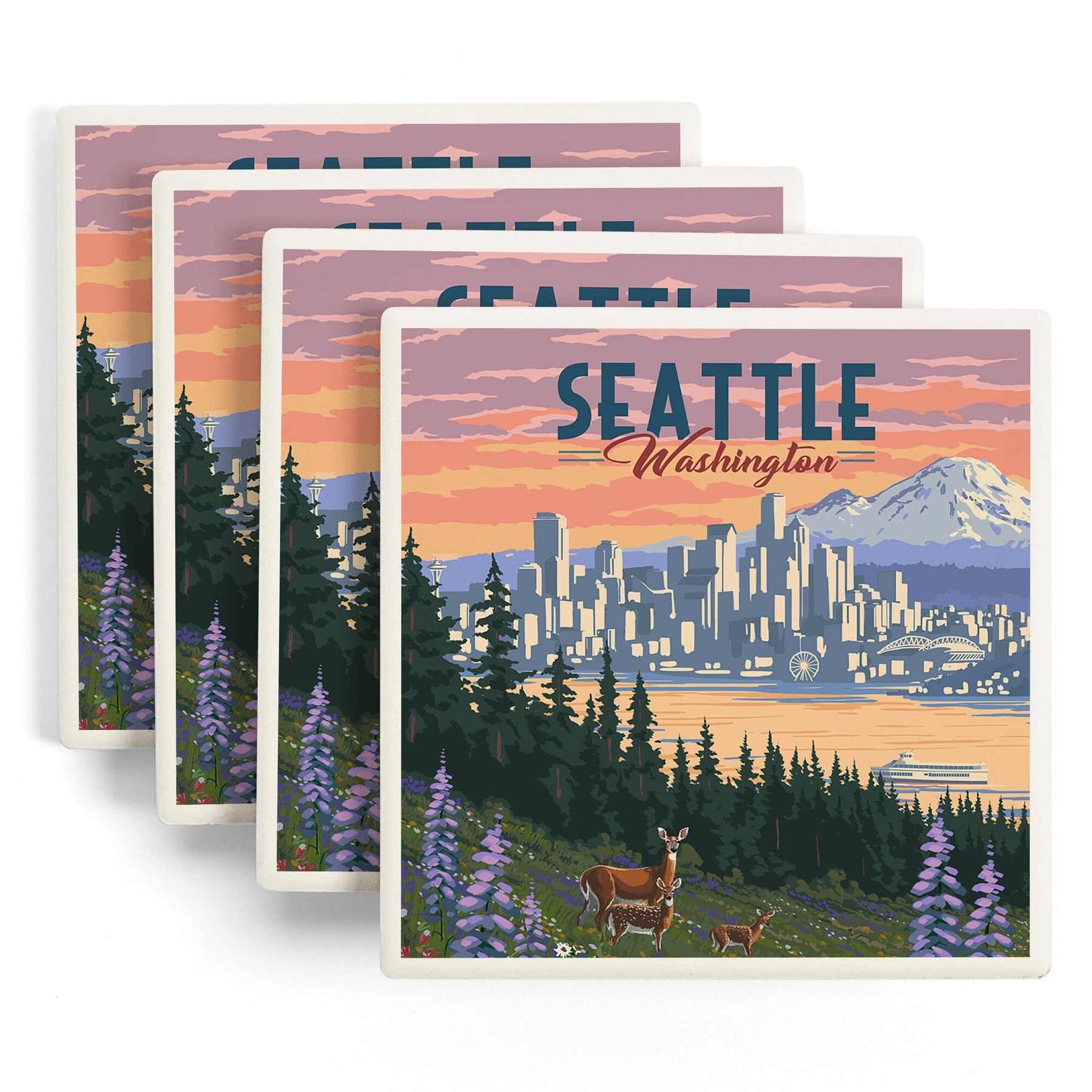 Seattle, Washington, Deer and Spring Flowers, Coasters Coasters Lantern Press