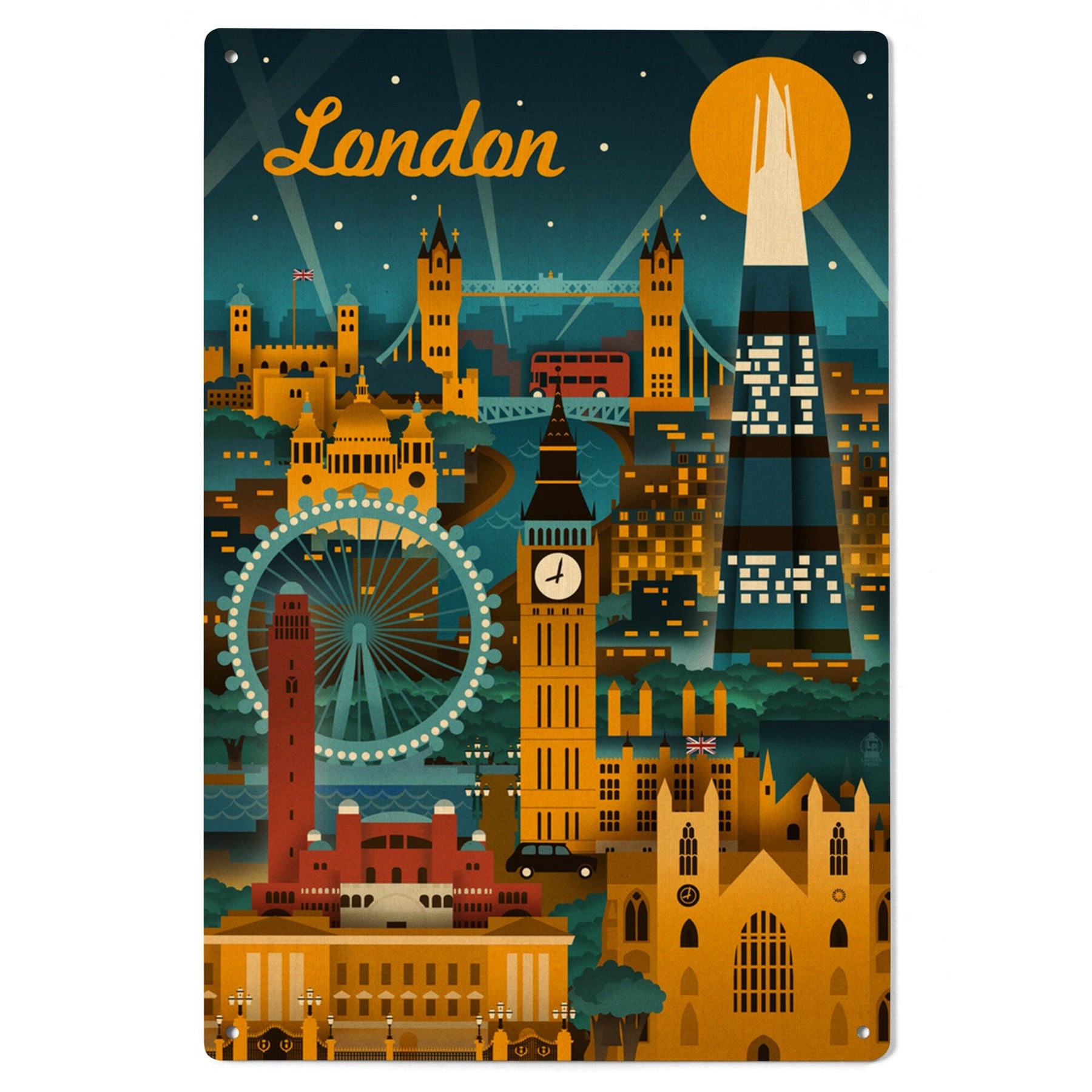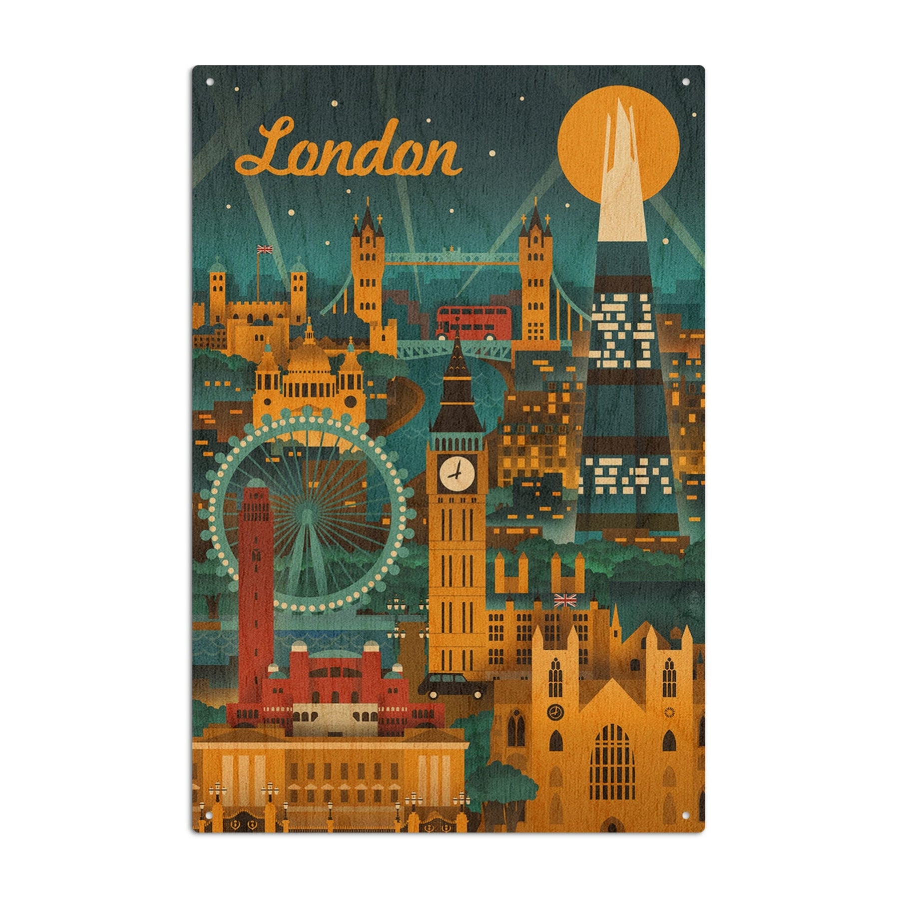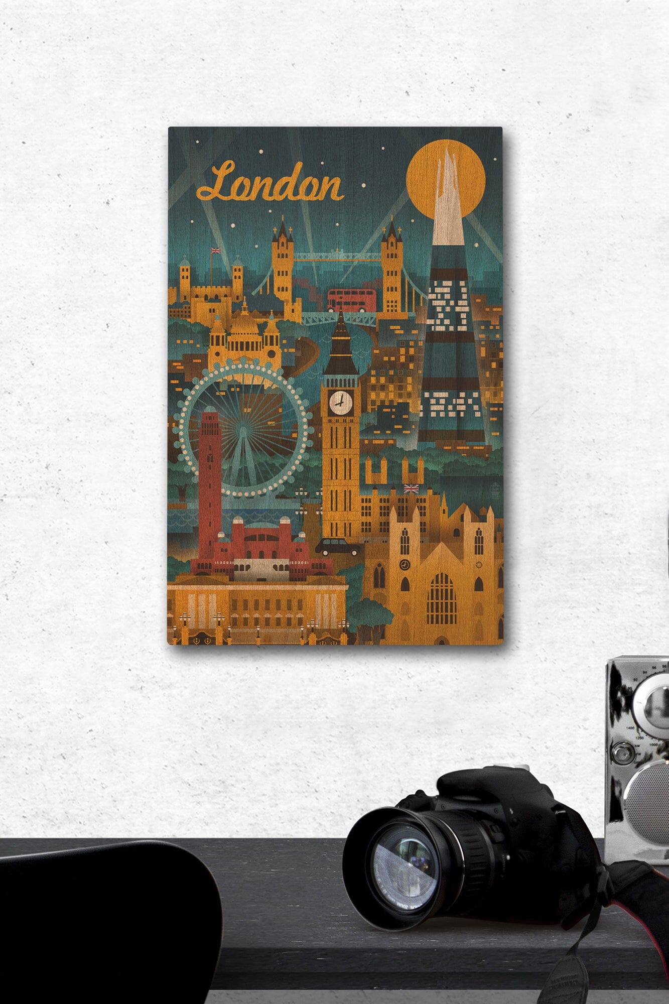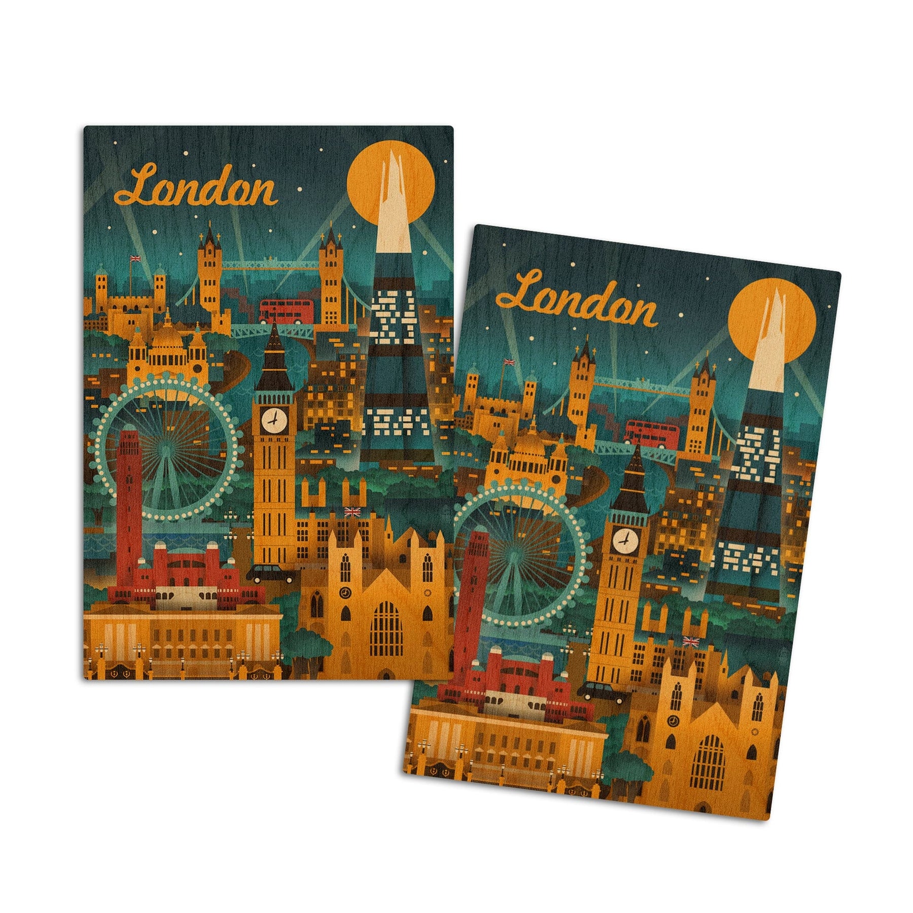 London, England, Retro Skyline, Lantern Press Artwork, Wood Signs and Postcards