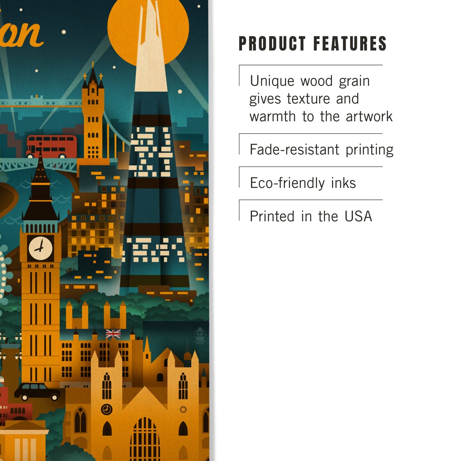 London, England, Retro Skyline, Lantern Press Artwork, Wood Signs and Postcards - Lantern Press