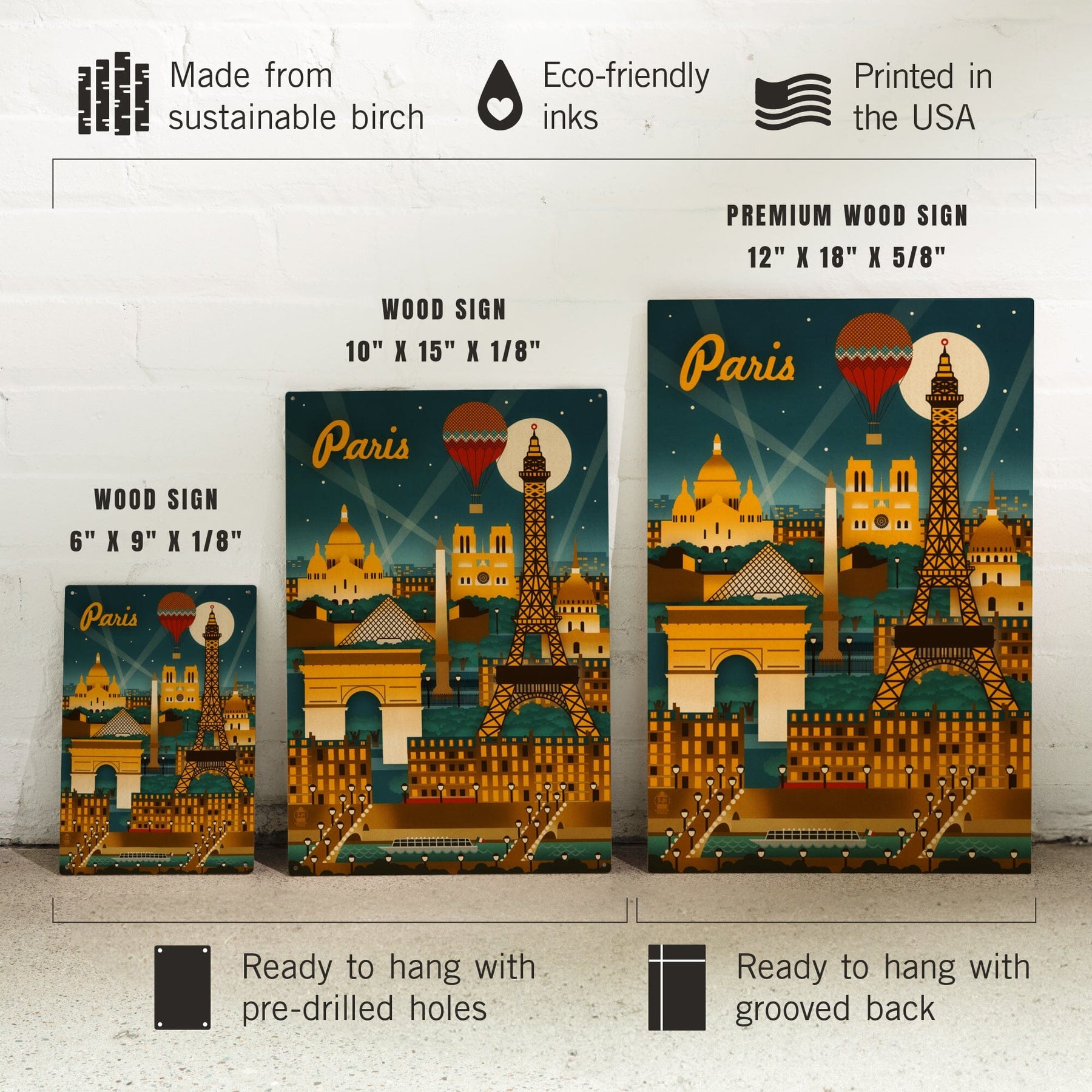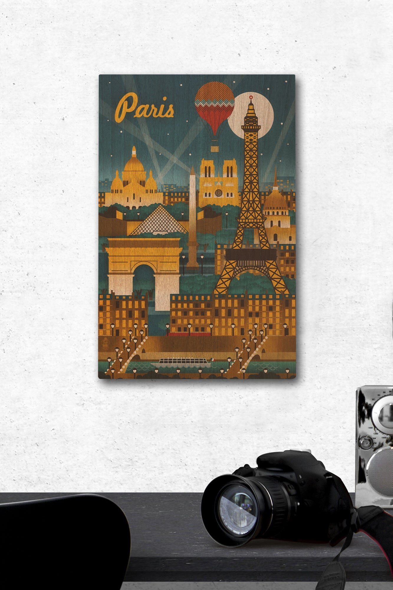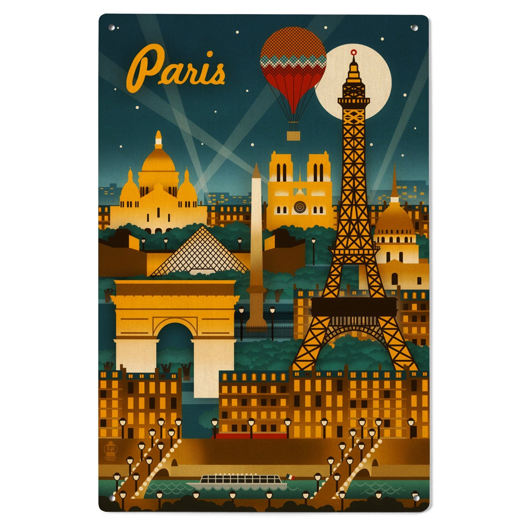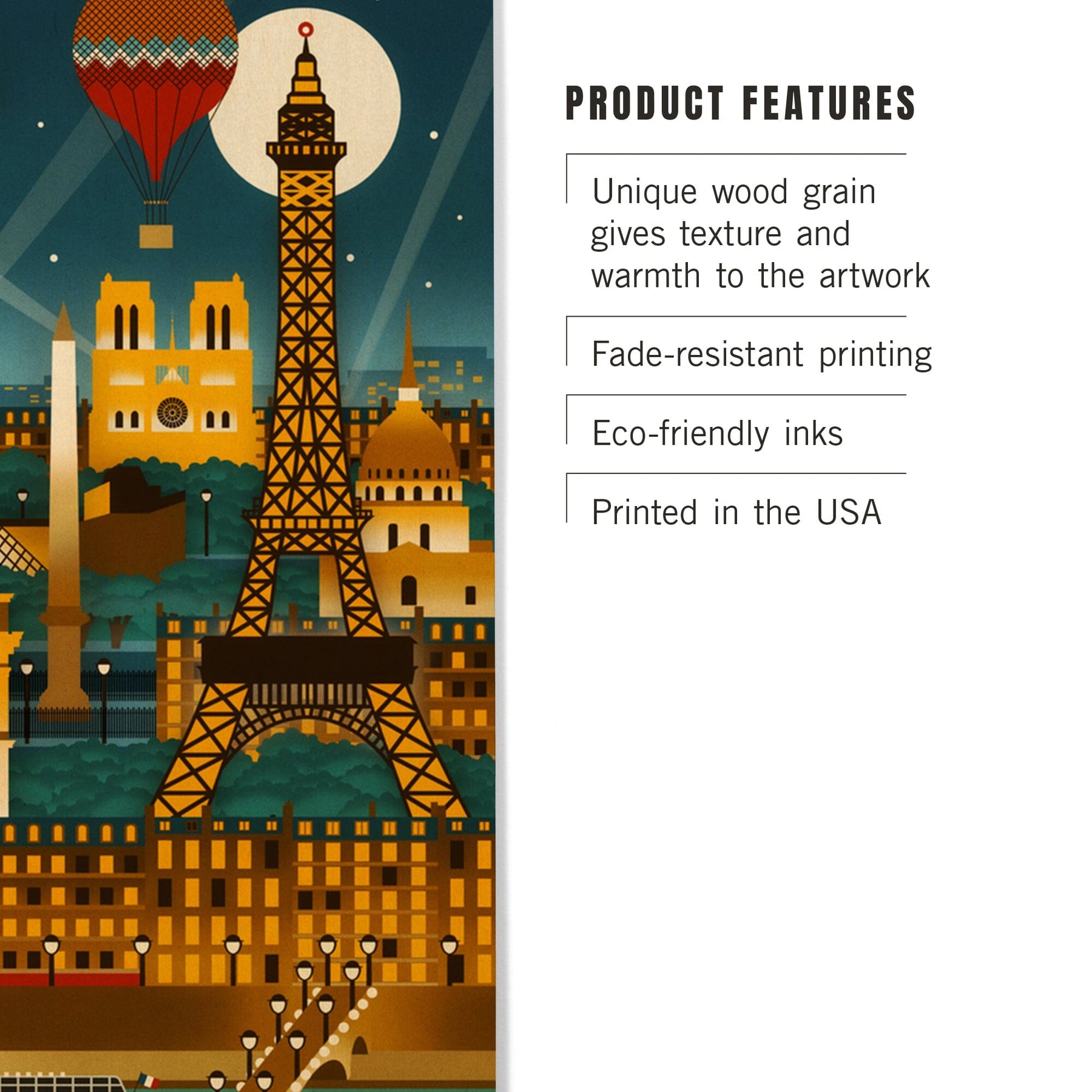 Paris, France, Retro Skyline, Lantern Press Artwork, Wood Signs and Postcards Wood Lantern Press