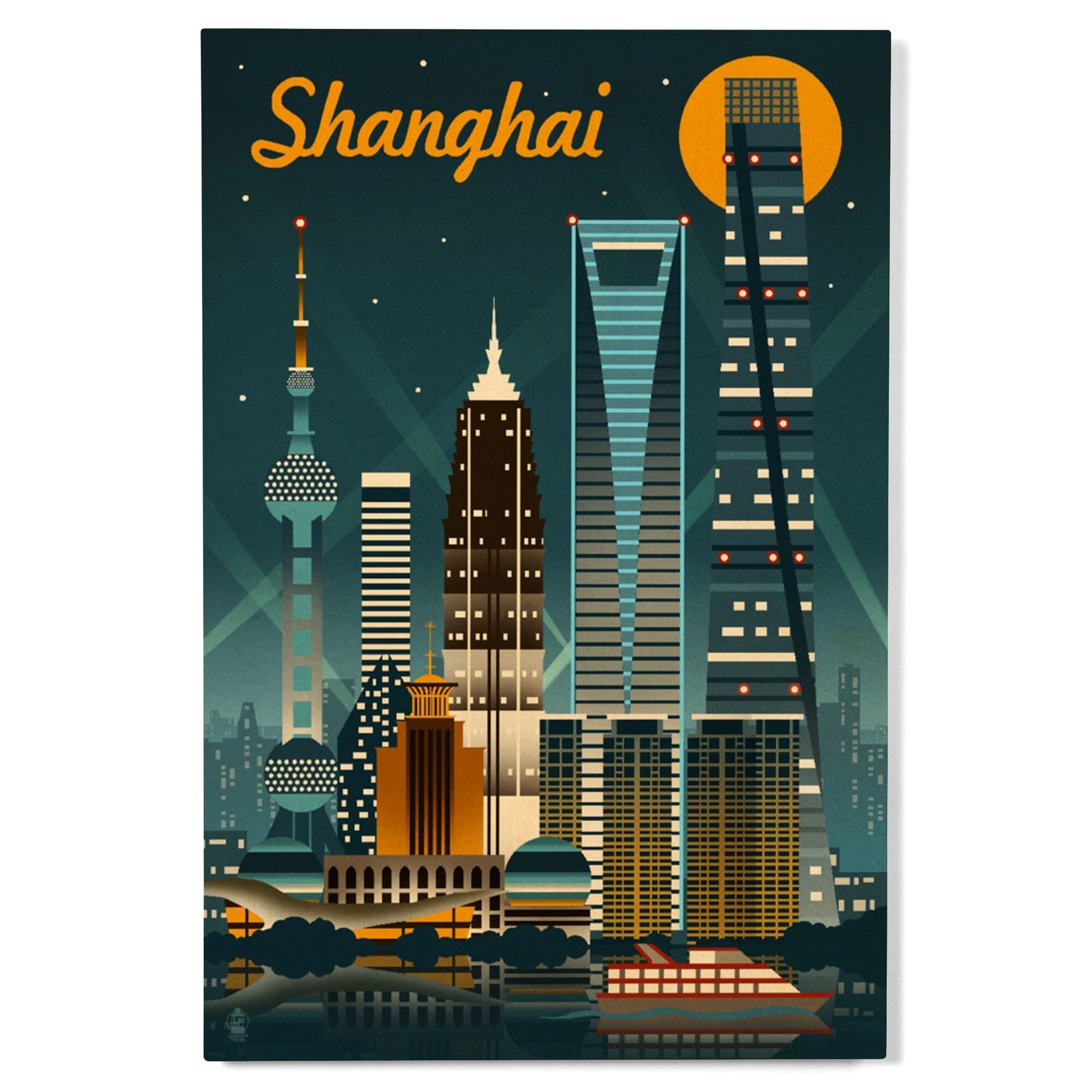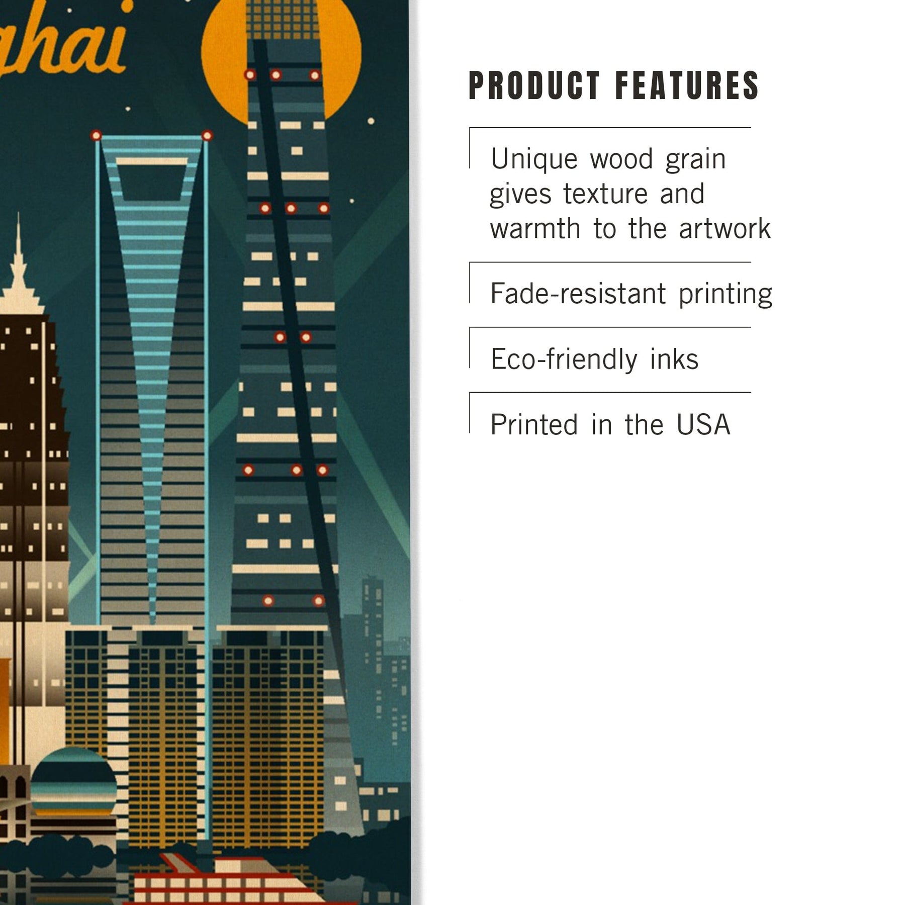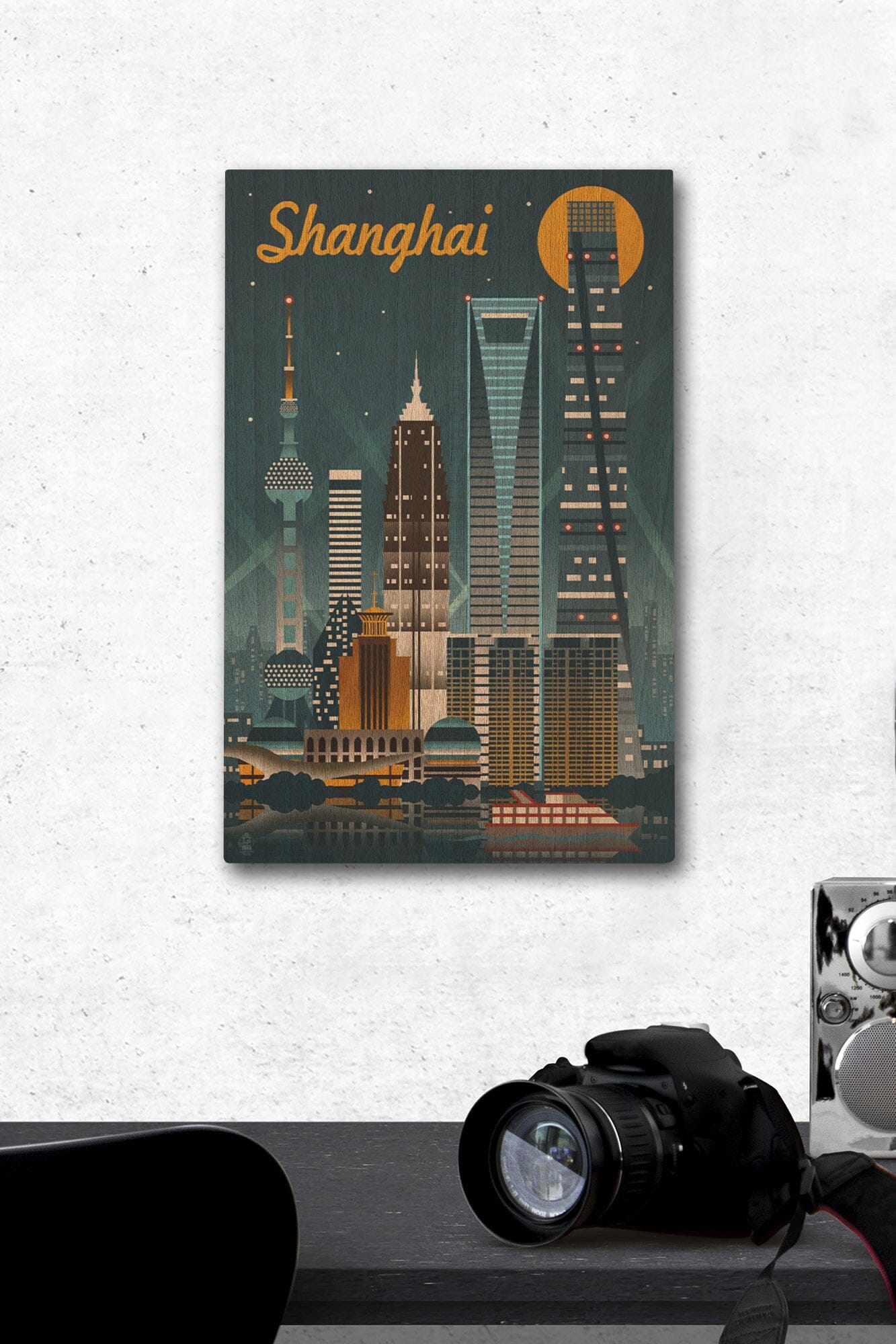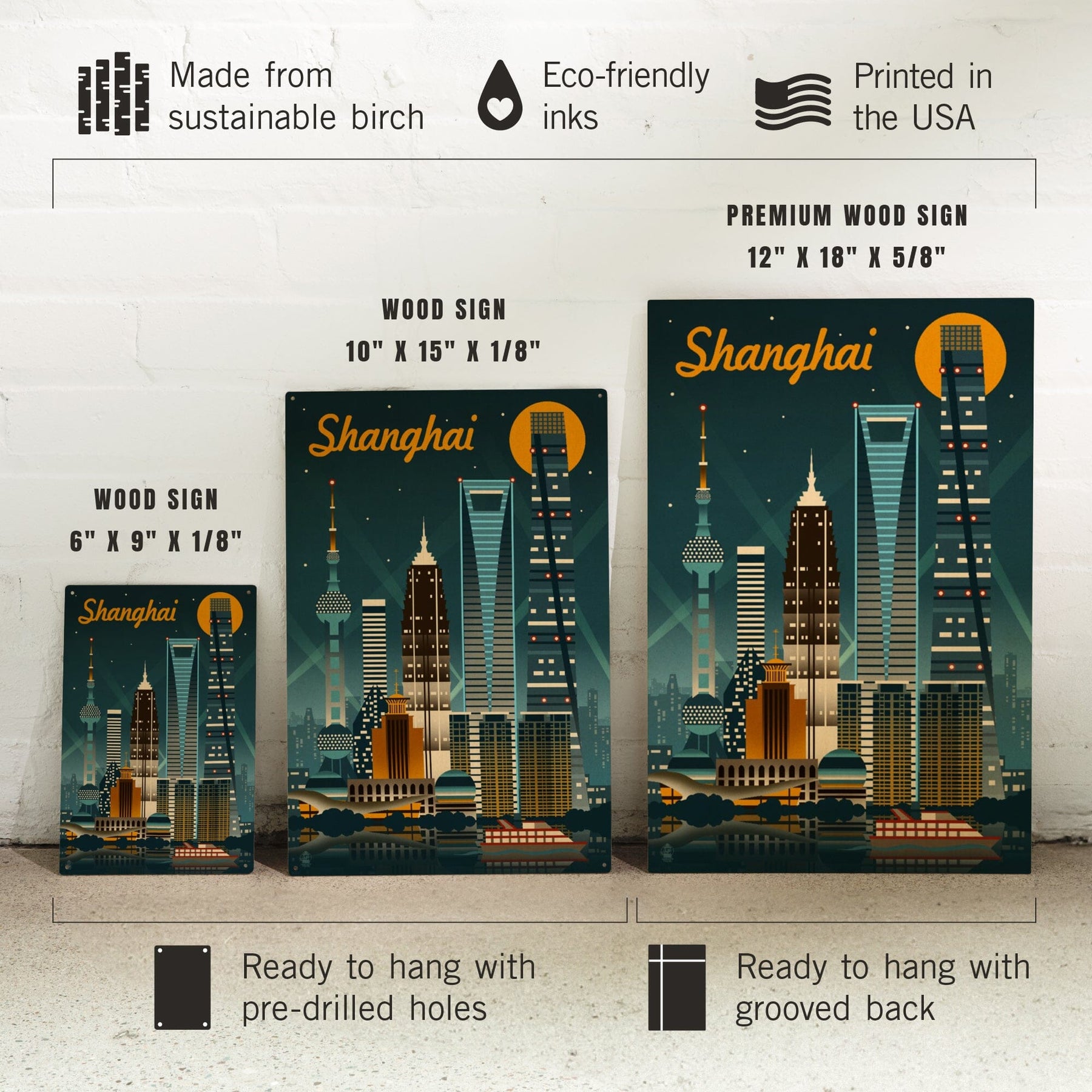 Shanghai, China, Retro Skyline, Lantern Press Artwork, Wood Signs and Postcards Wood Lantern Press