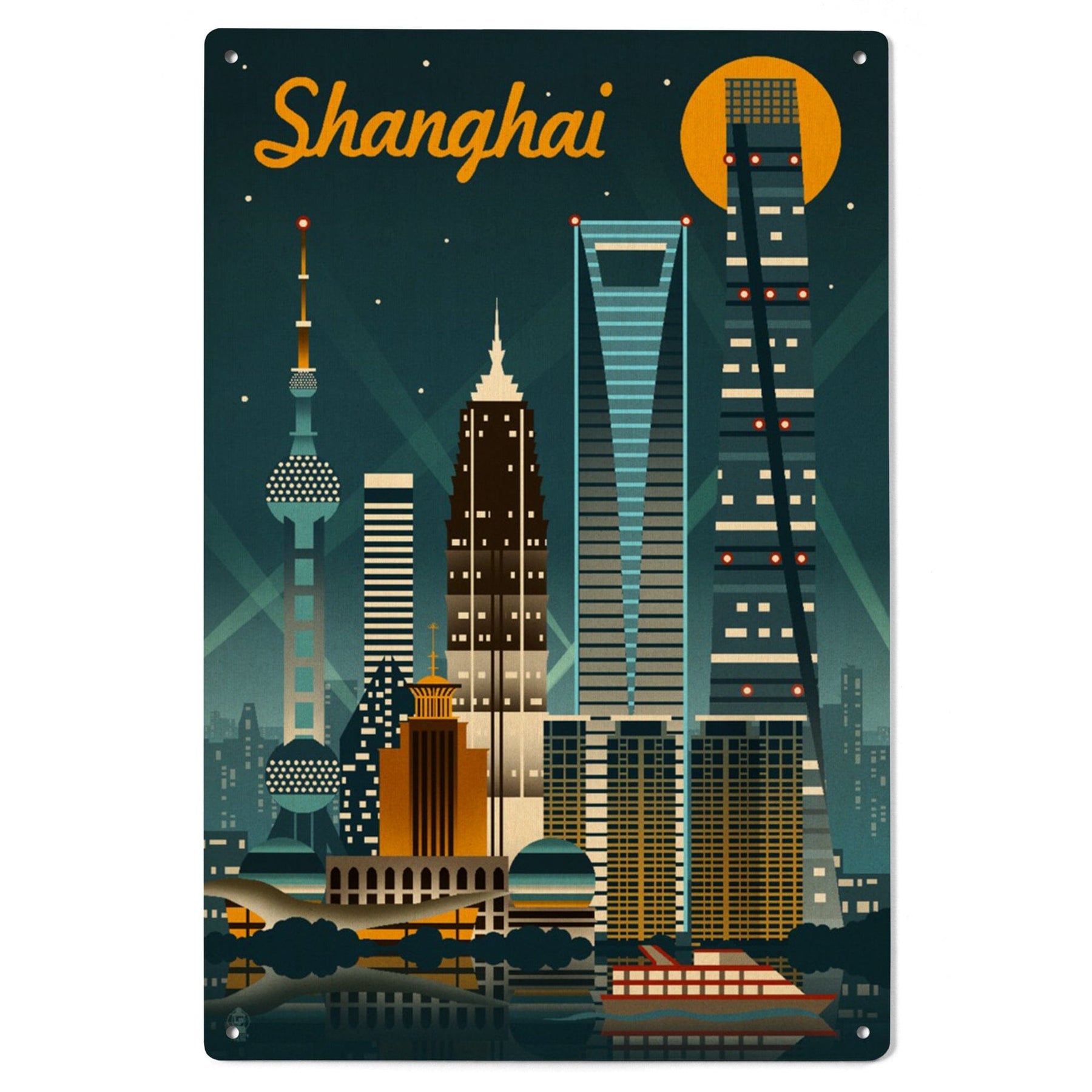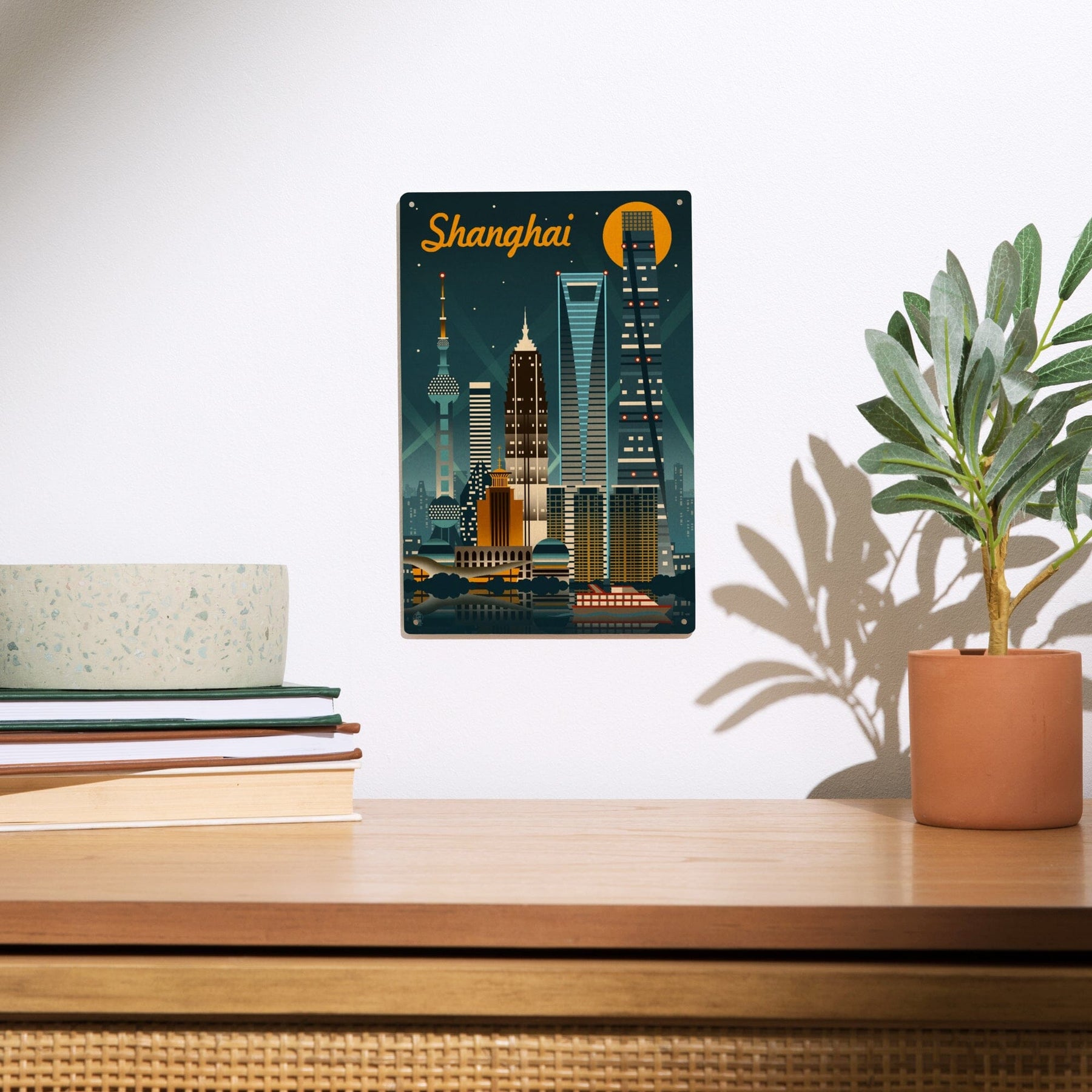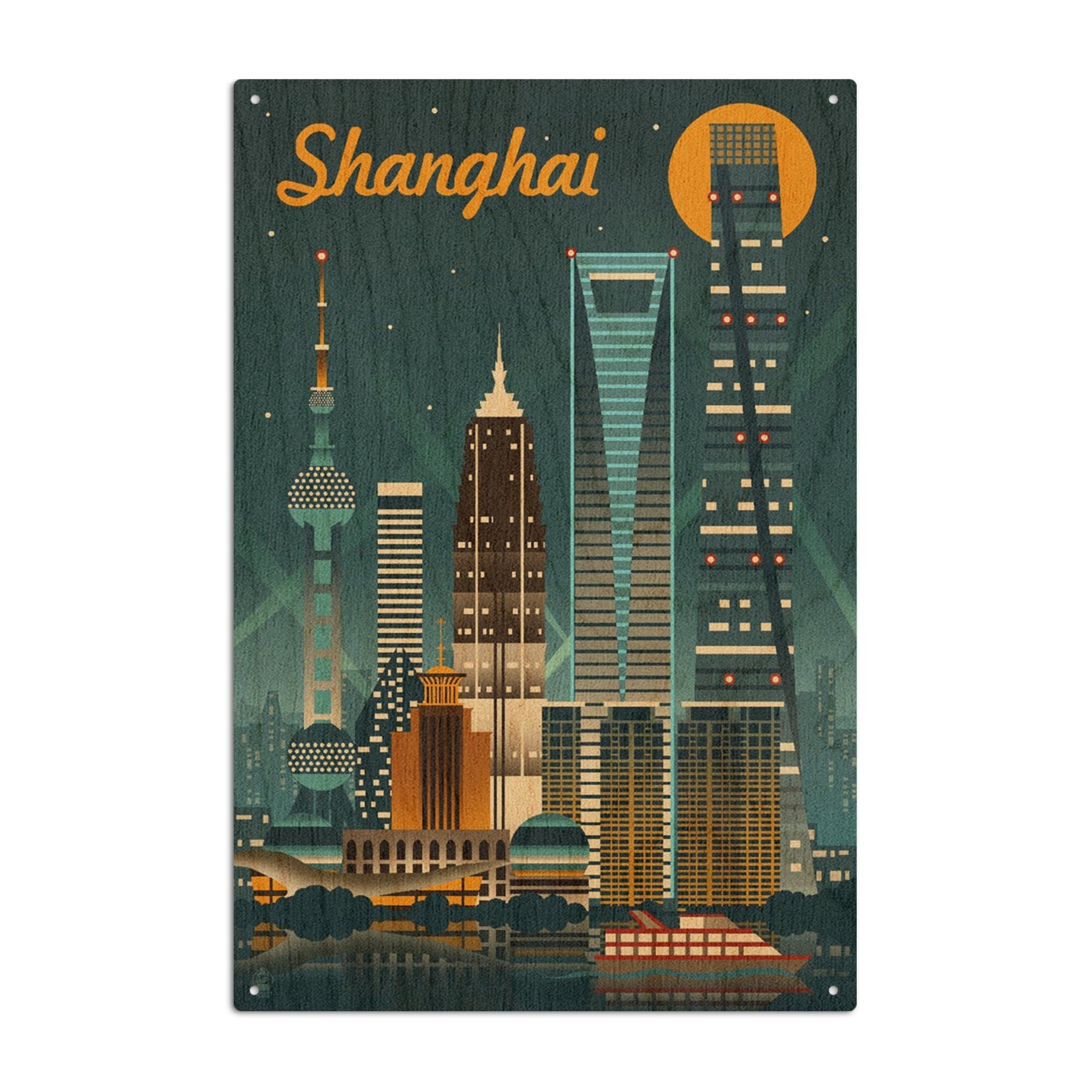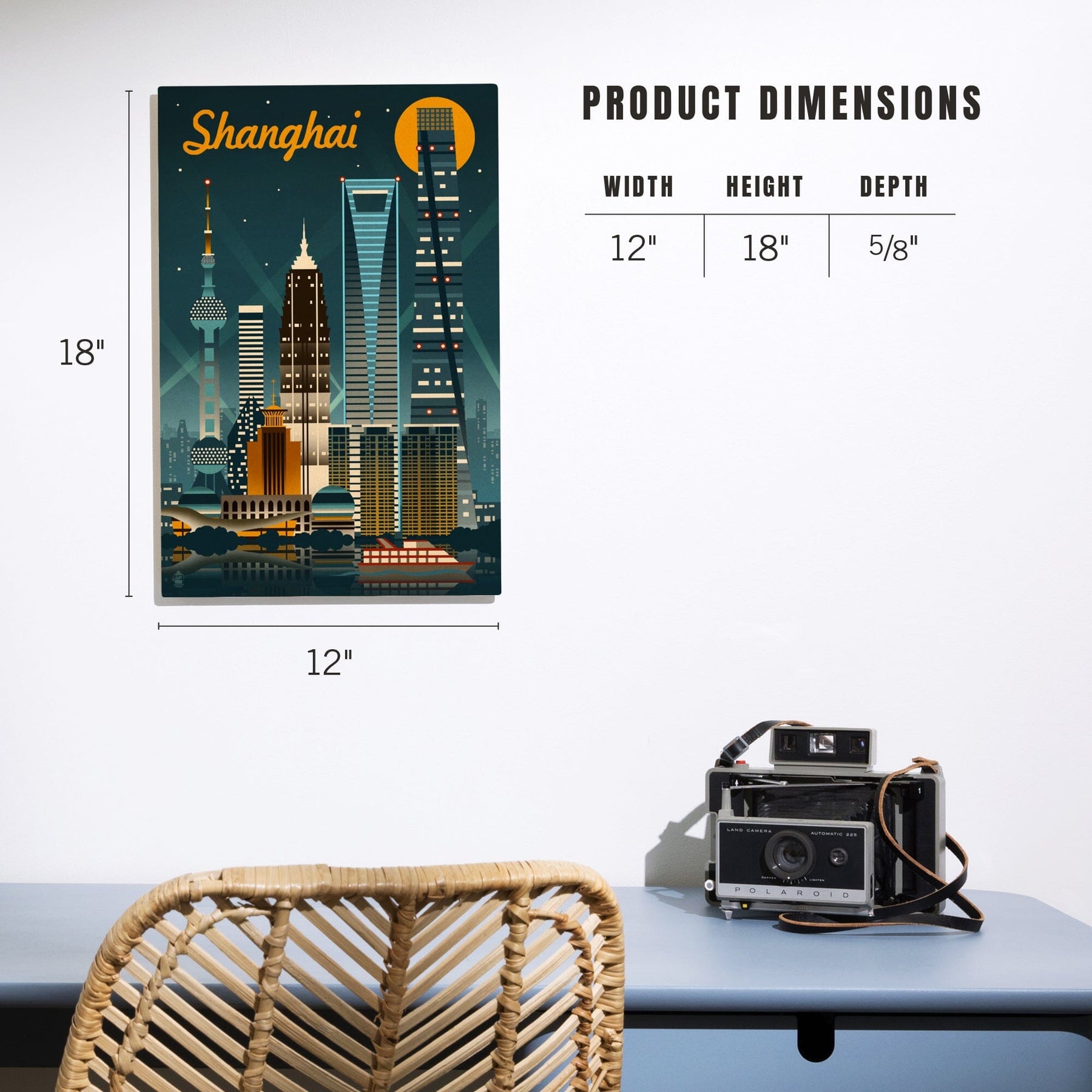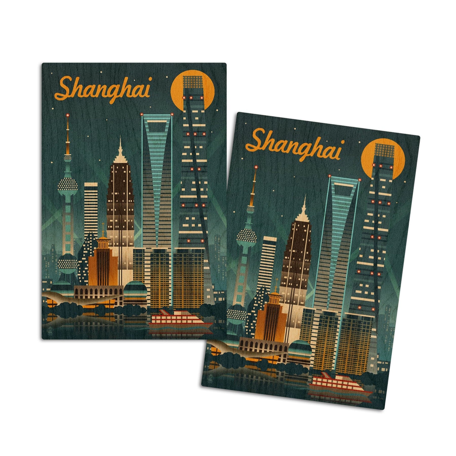 Shanghai, China, Retro Skyline, Lantern Press Artwork, Wood Signs and Postcards Wood Lantern Press