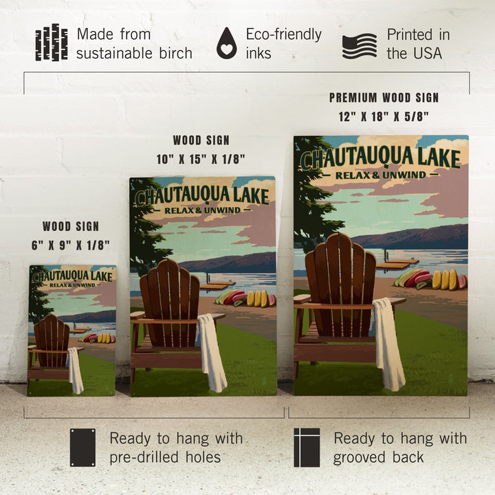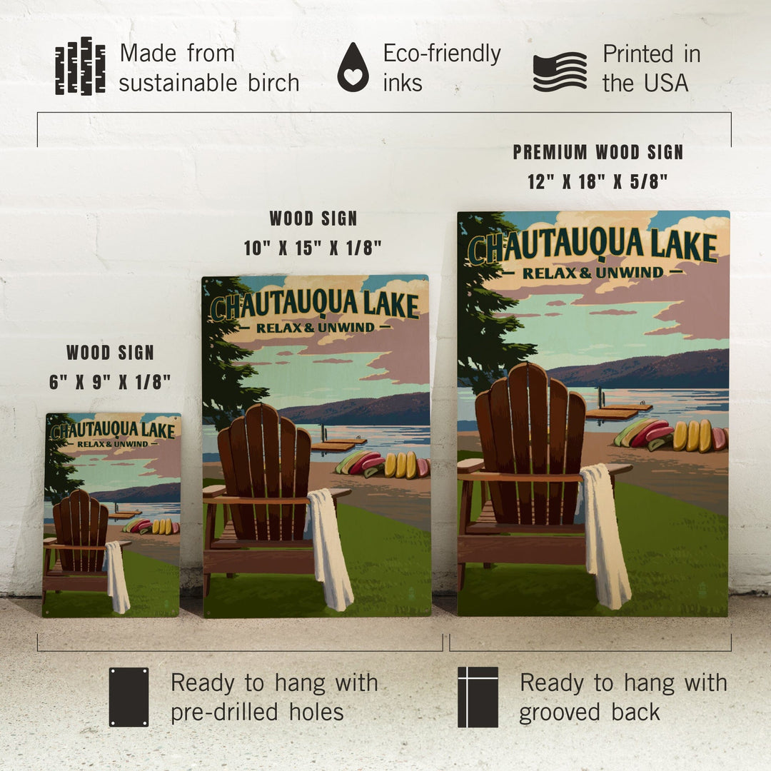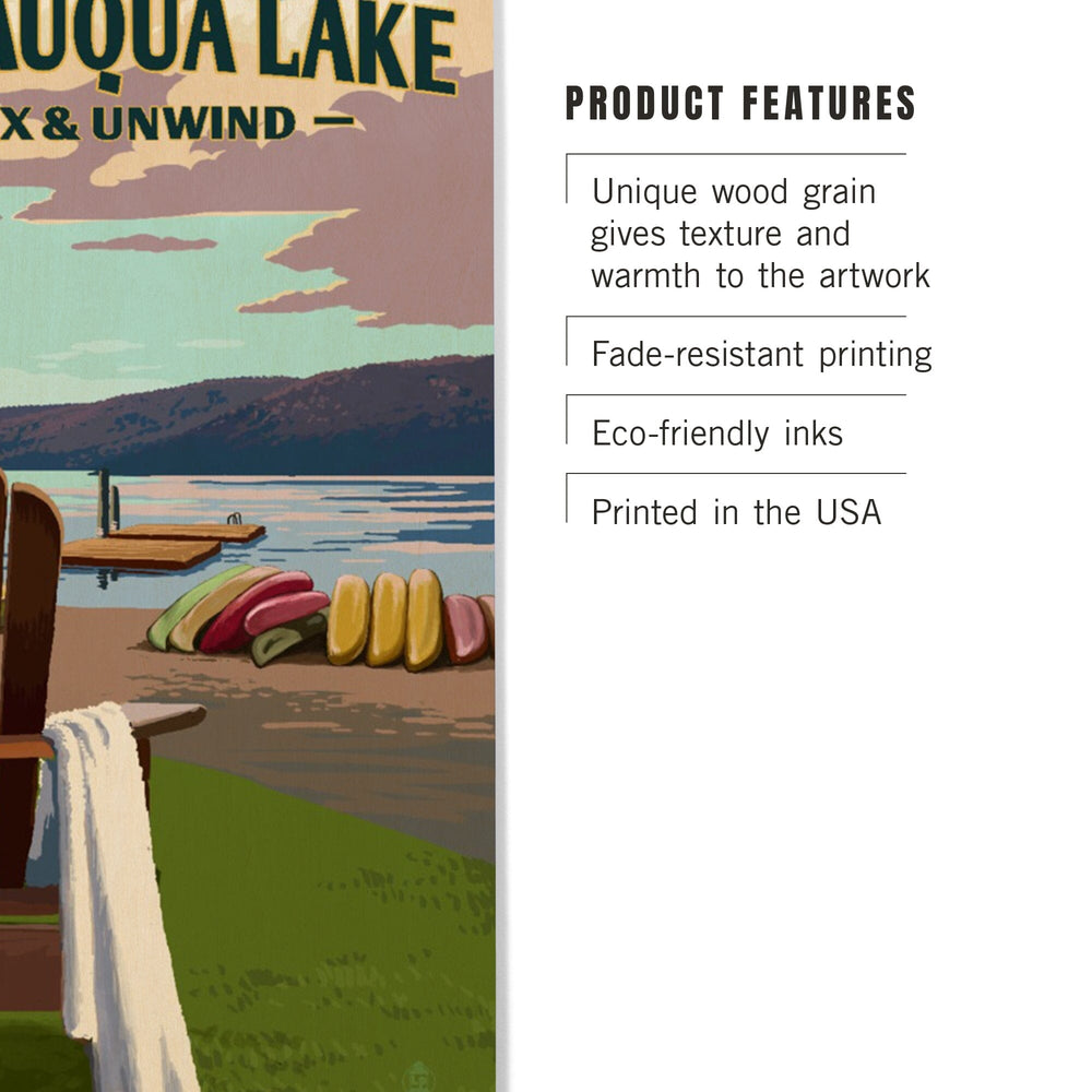 Chautauqua Lake, New York, Lake & Adirondack Chair, Lantern Press Artwork, Wood Signs and Postcards