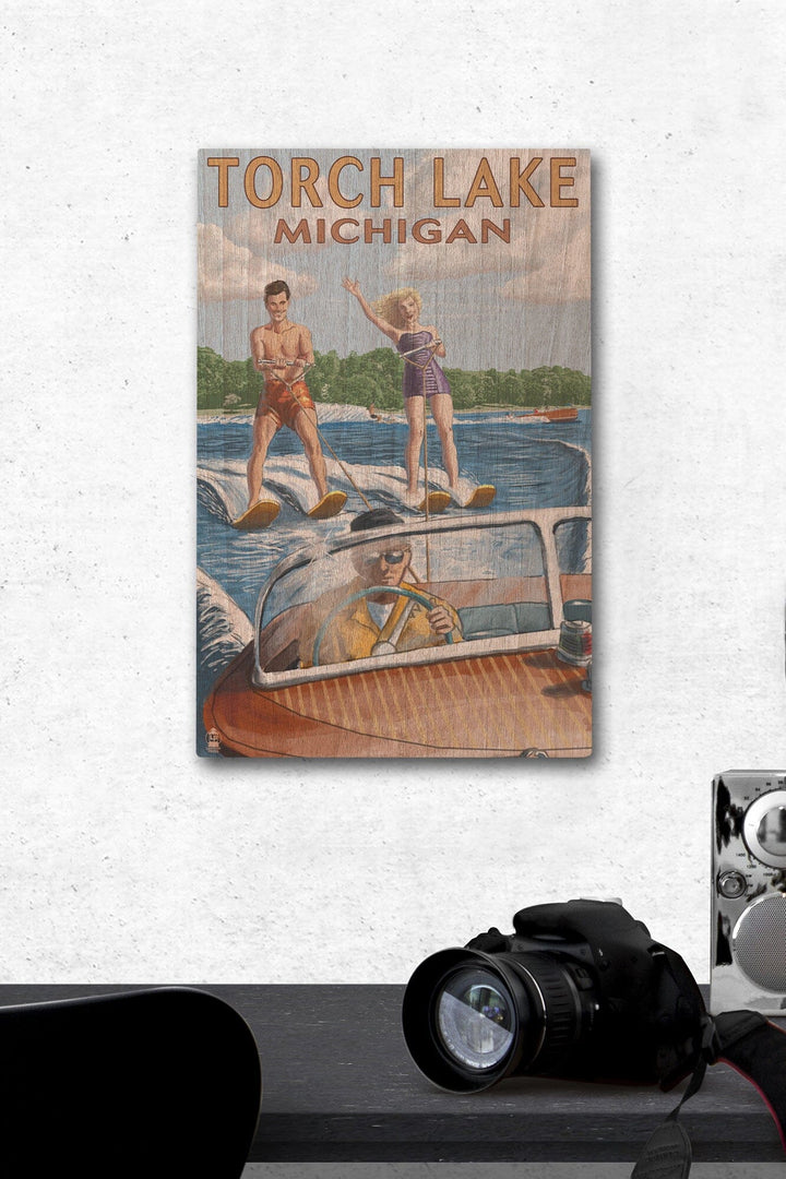 Torch Lake, Michigan, Water Skiing & Wooden Boat, Lantern Press Artwork, Wood Signs and Postcards Wood Lantern Press