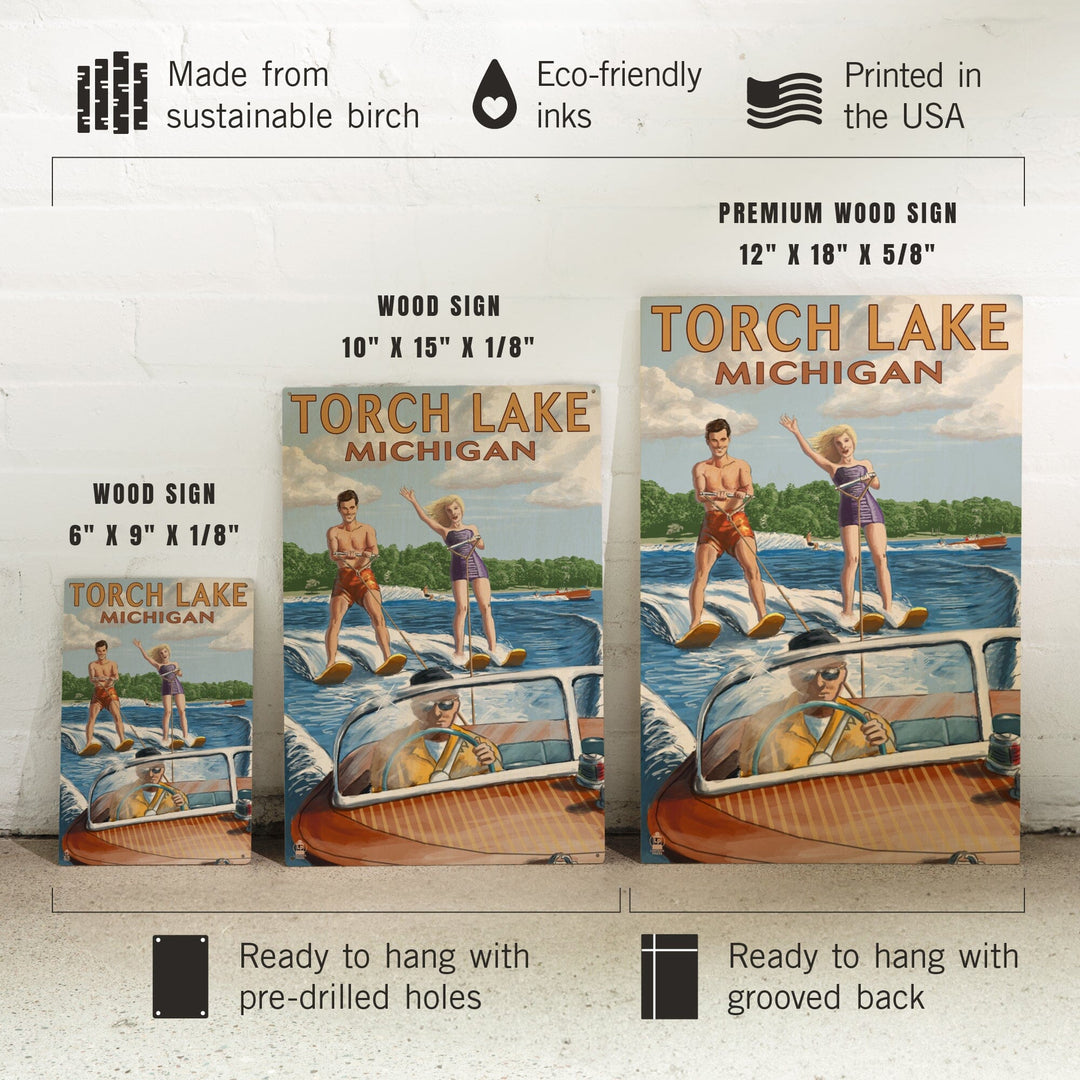 Torch Lake, Michigan, Water Skiing & Wooden Boat, Lantern Press Artwork, Wood Signs and Postcards