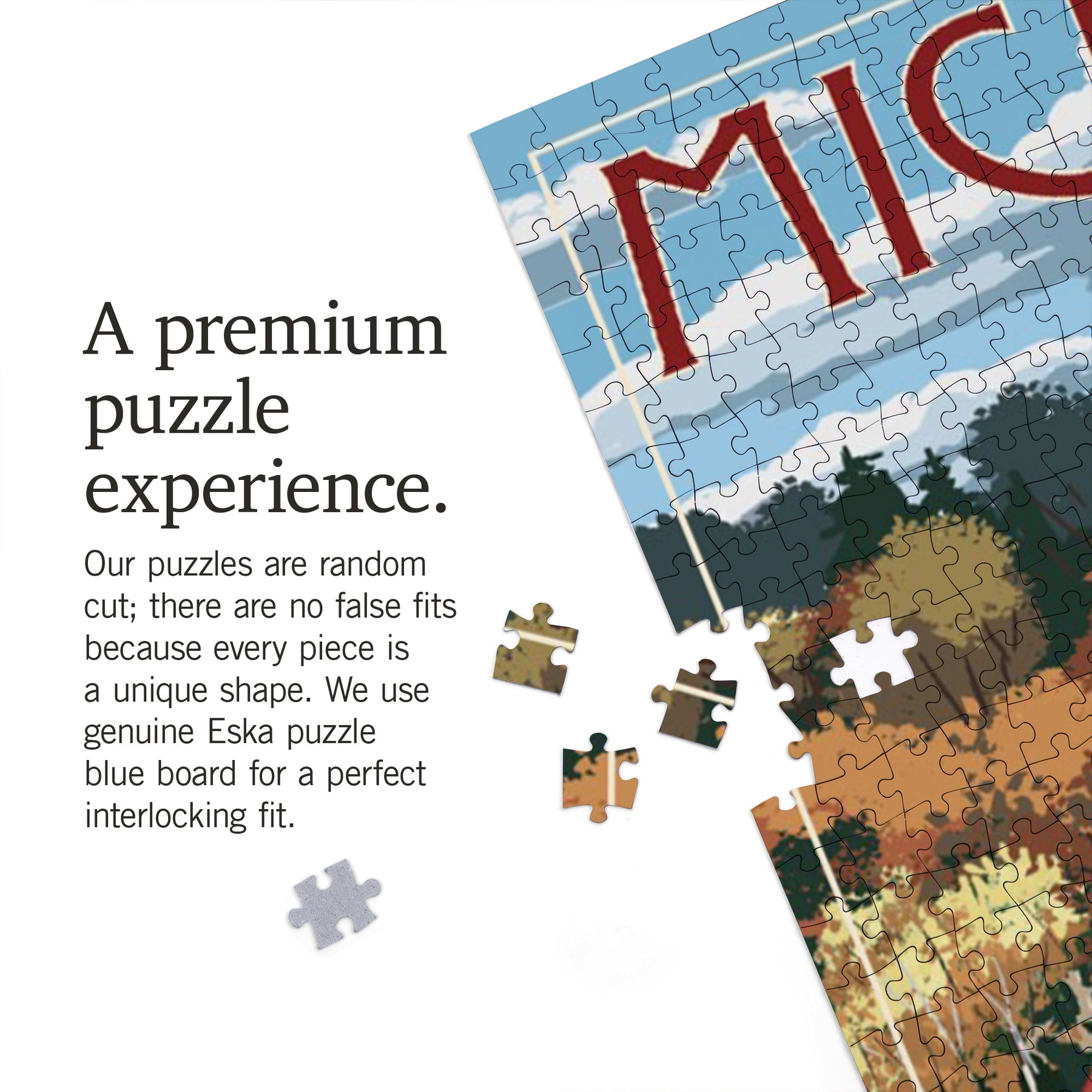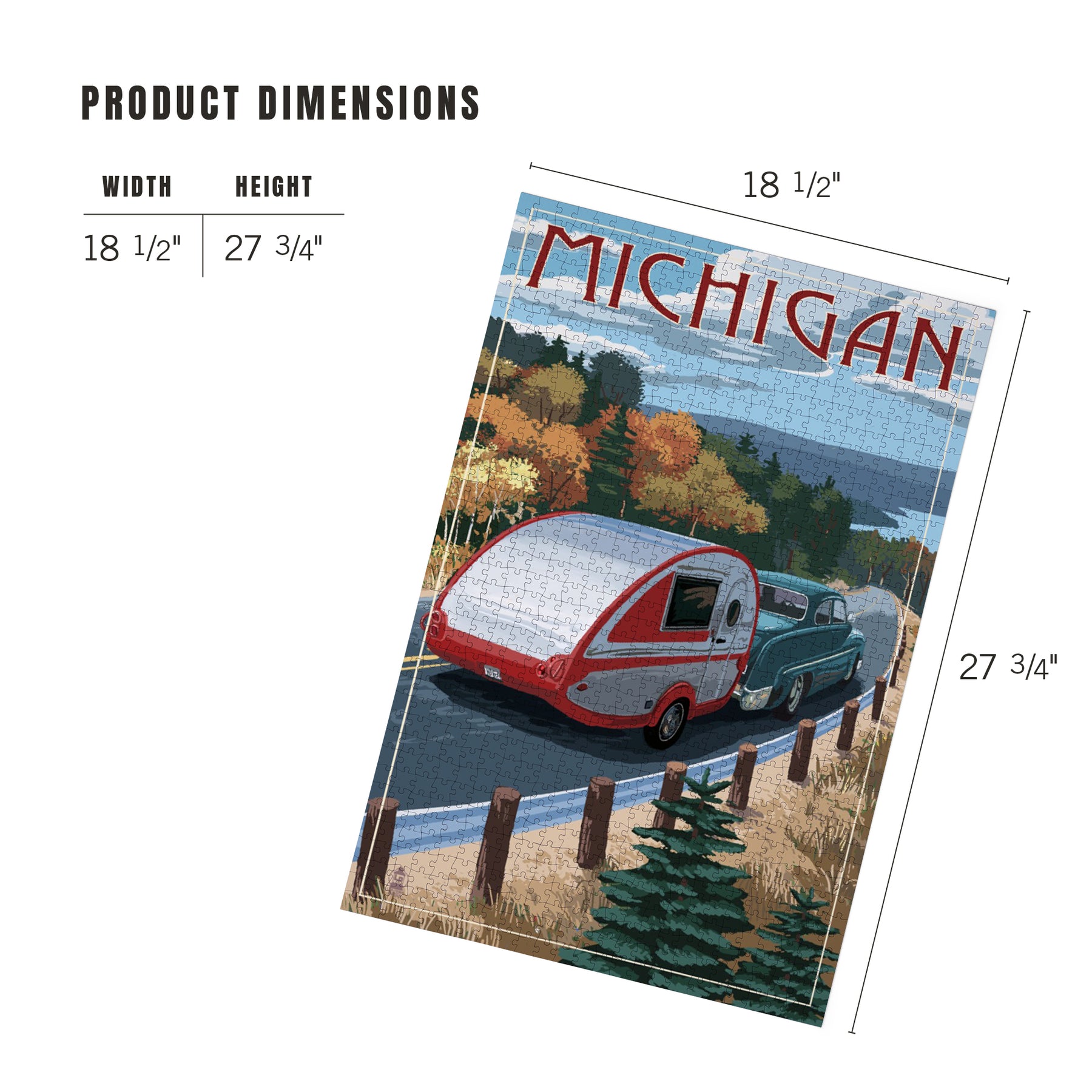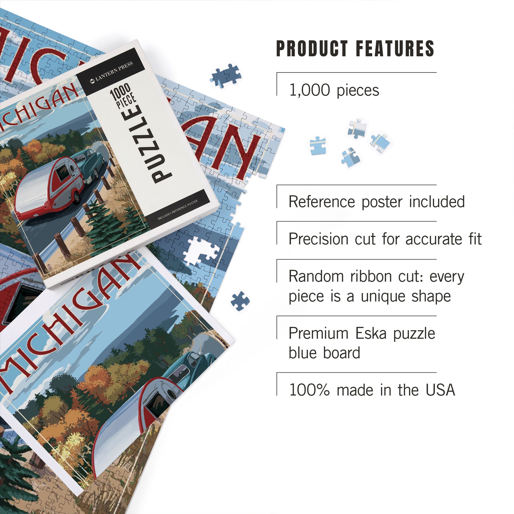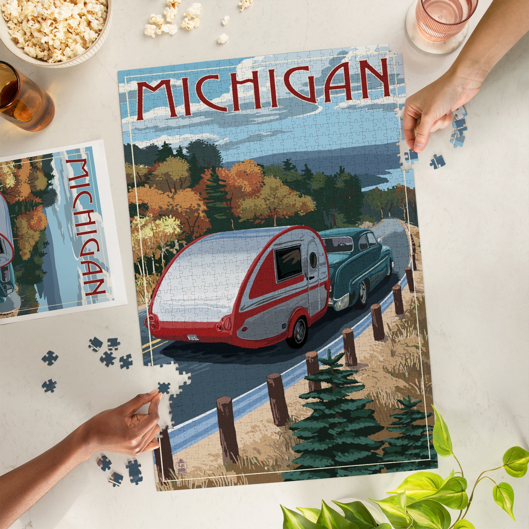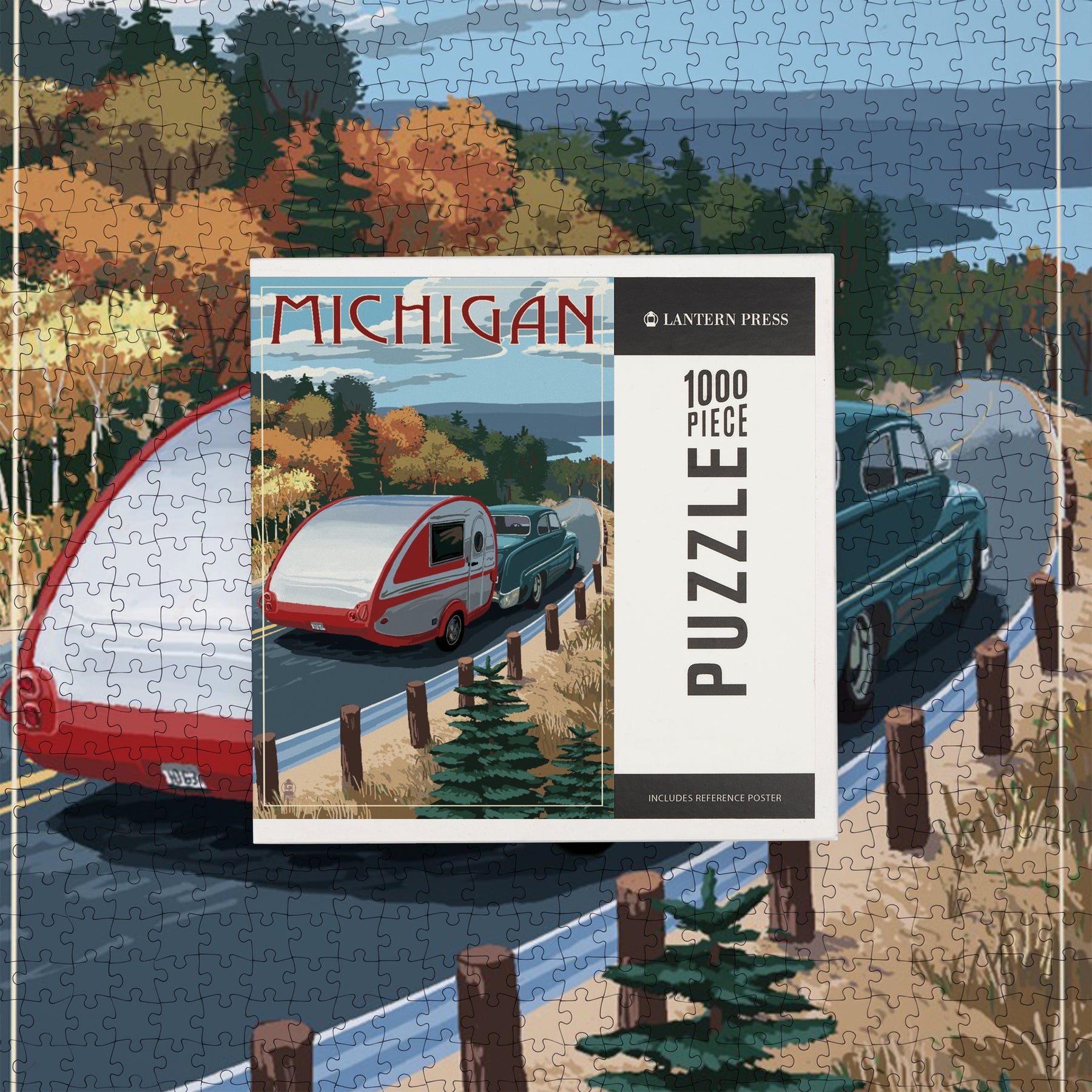 Michigan, Retro Camper on Road, Jigsaw Puzzle Puzzle Lantern Press