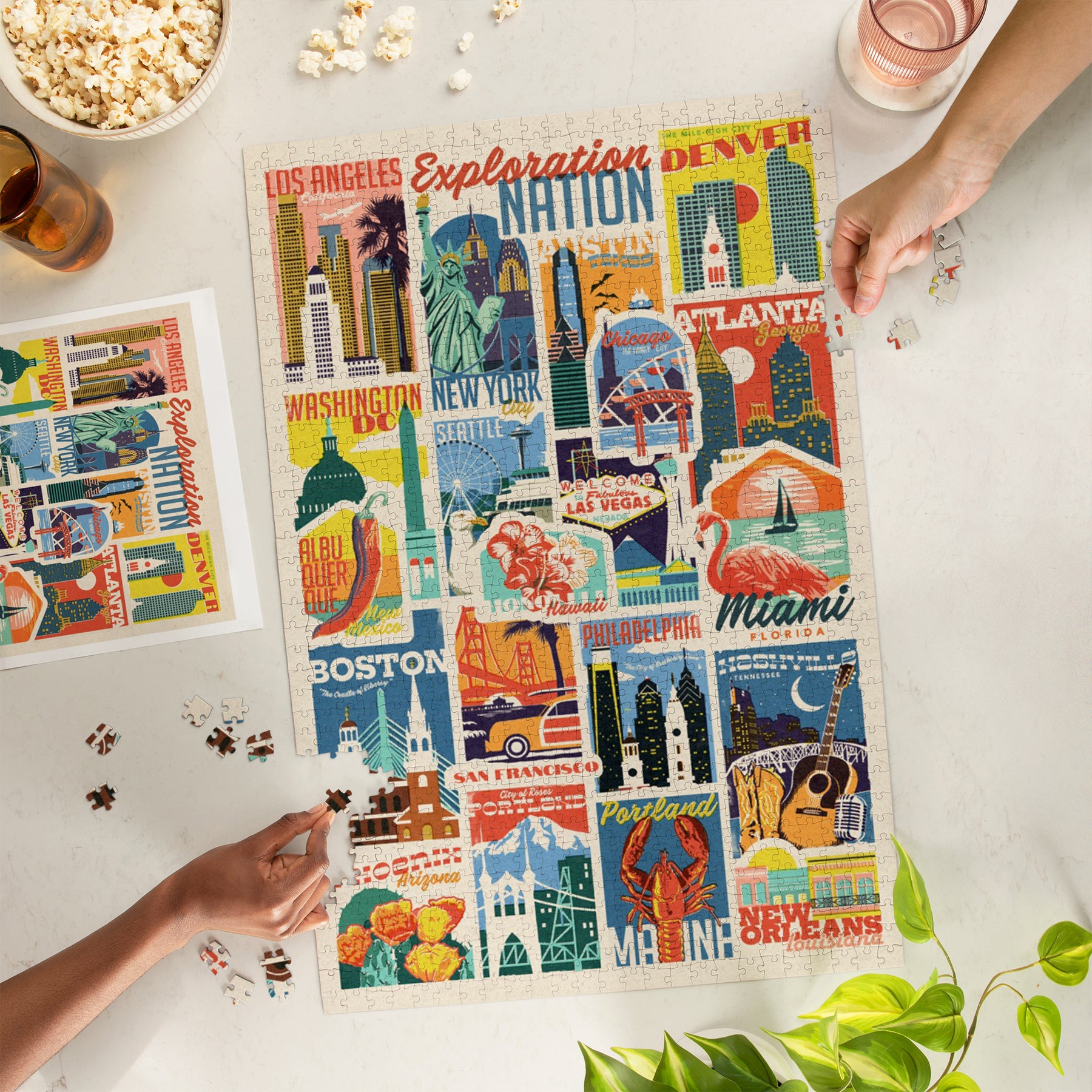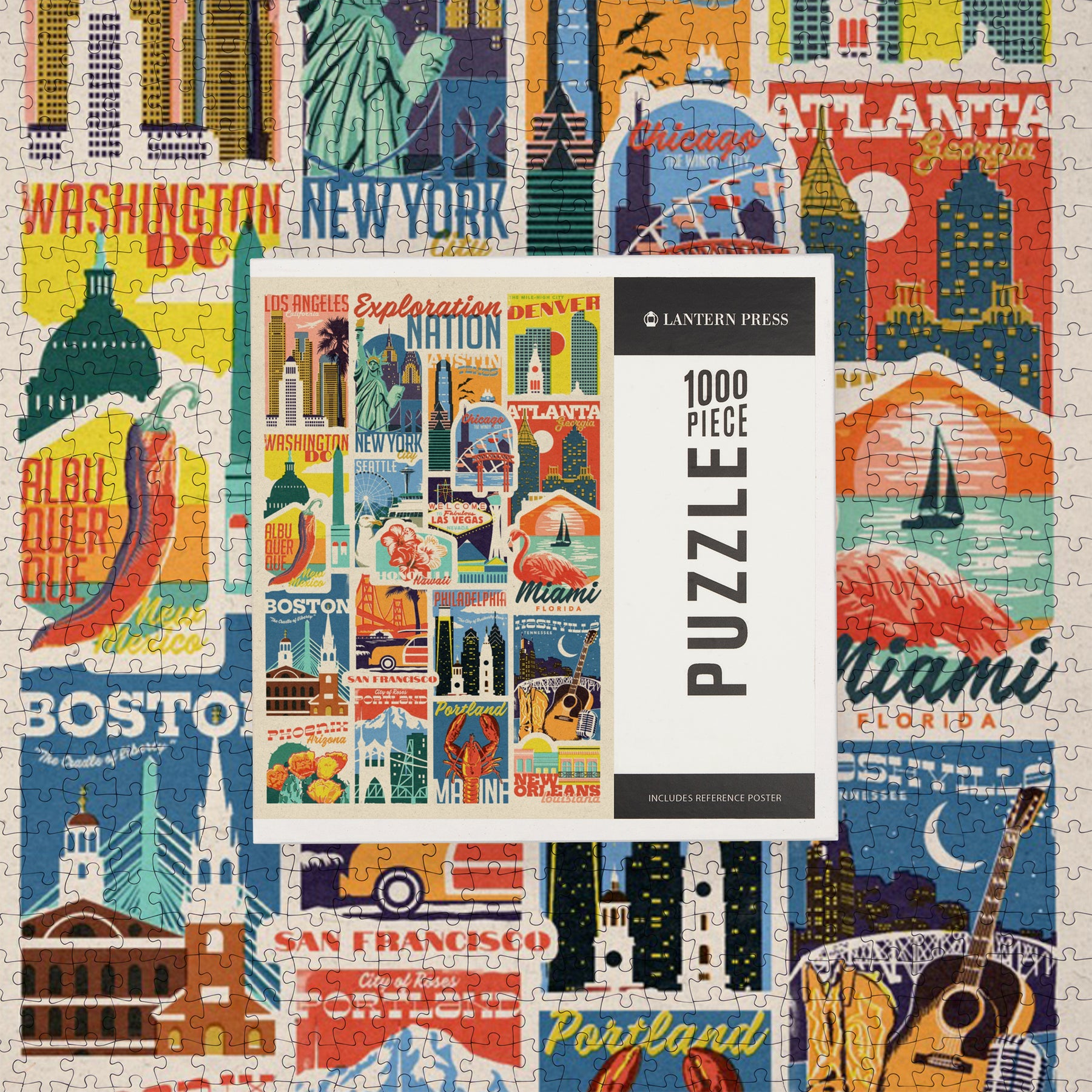 Woodblock Cities Collage, Exploration Nation, Jigsaw Puzzle Puzzle Lantern Press