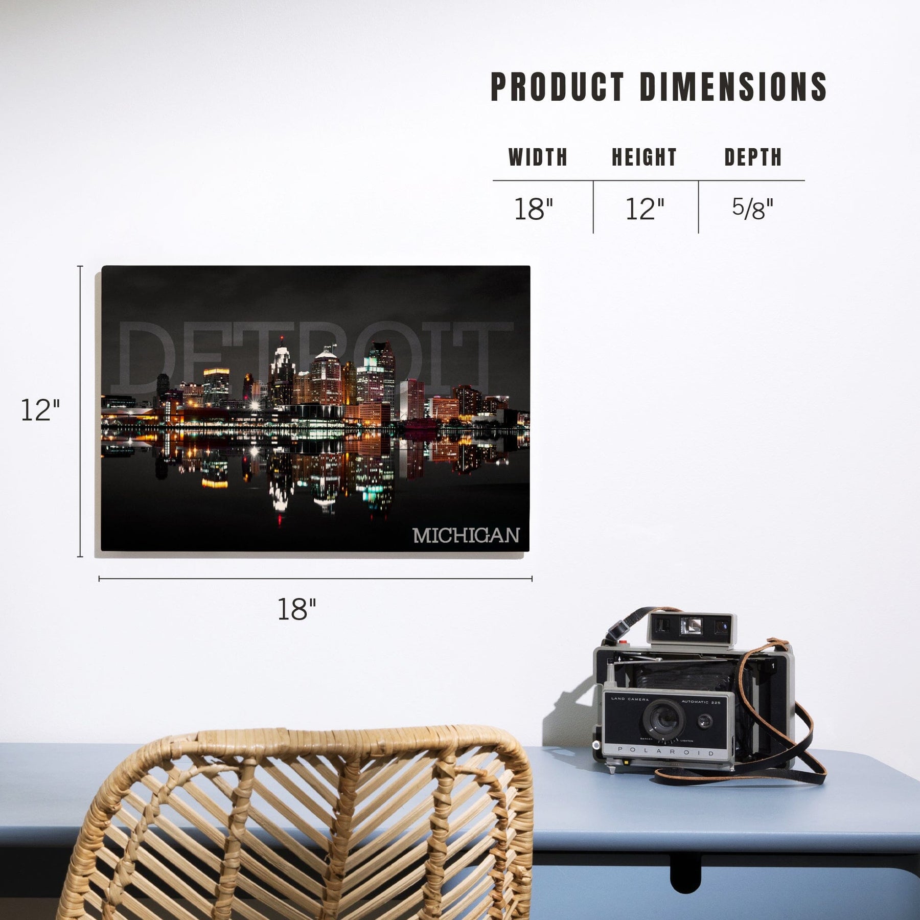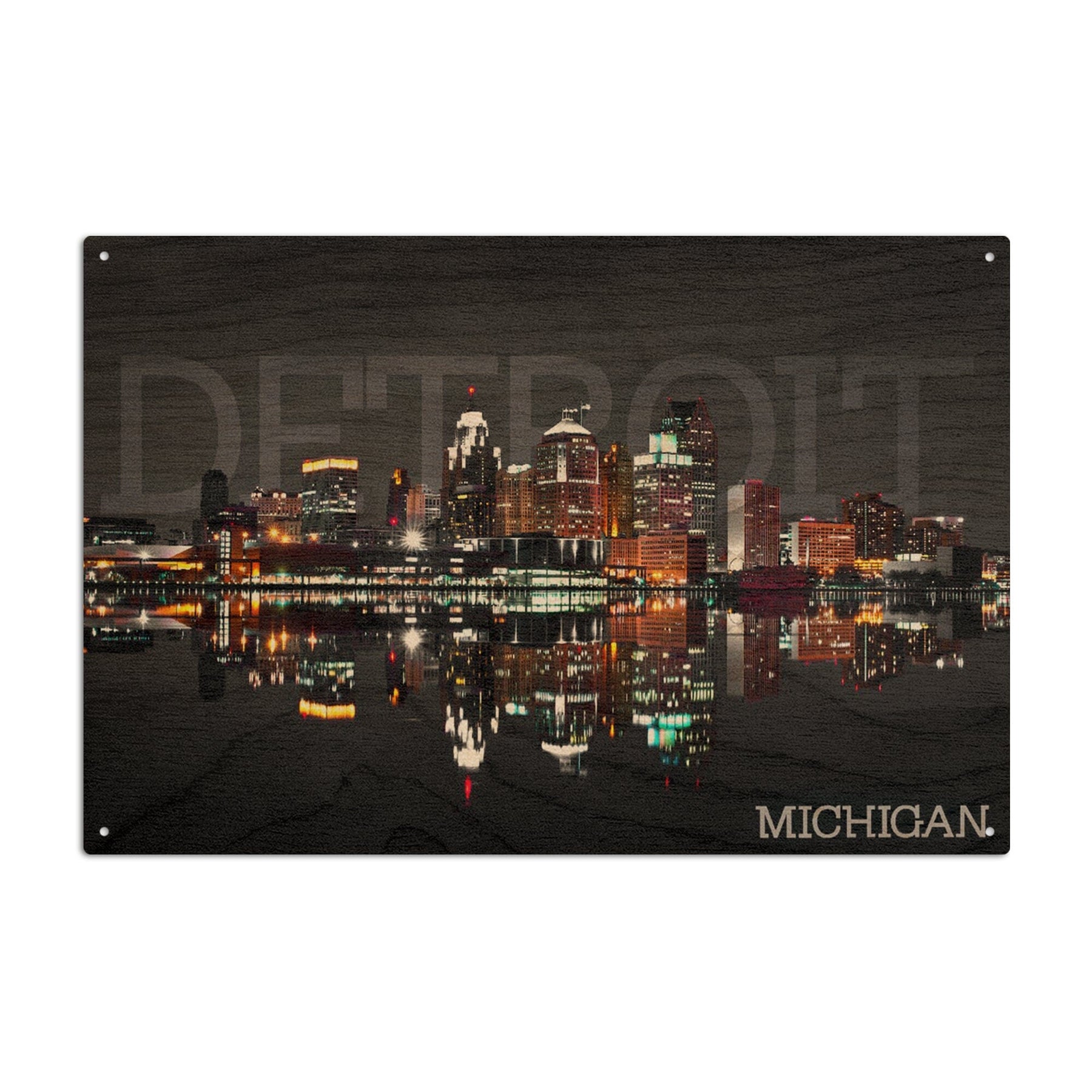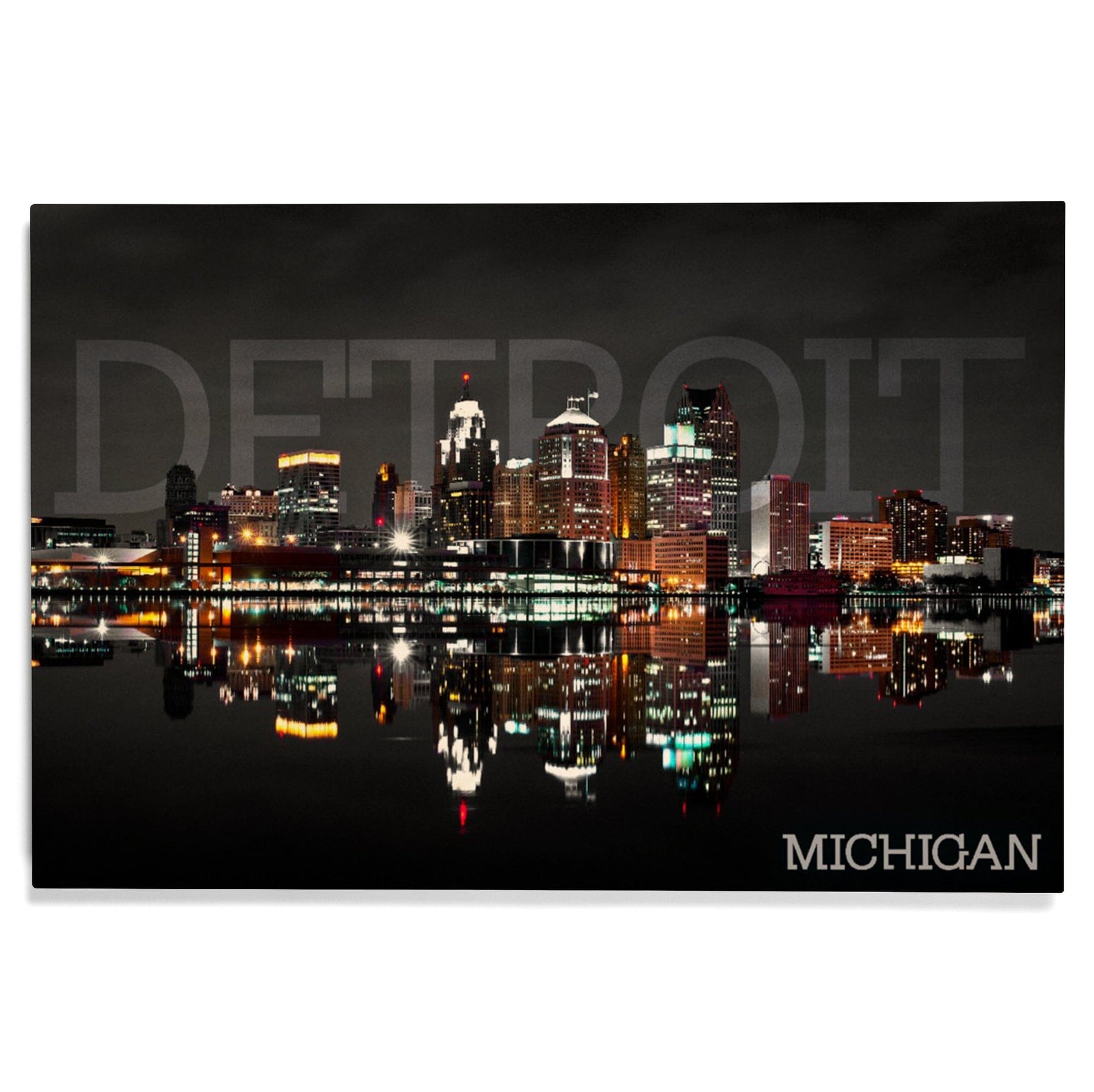 Detroit, Michigan, City at Night, Lantern Press Photography, Wood Signs and Postcards - Lantern Press