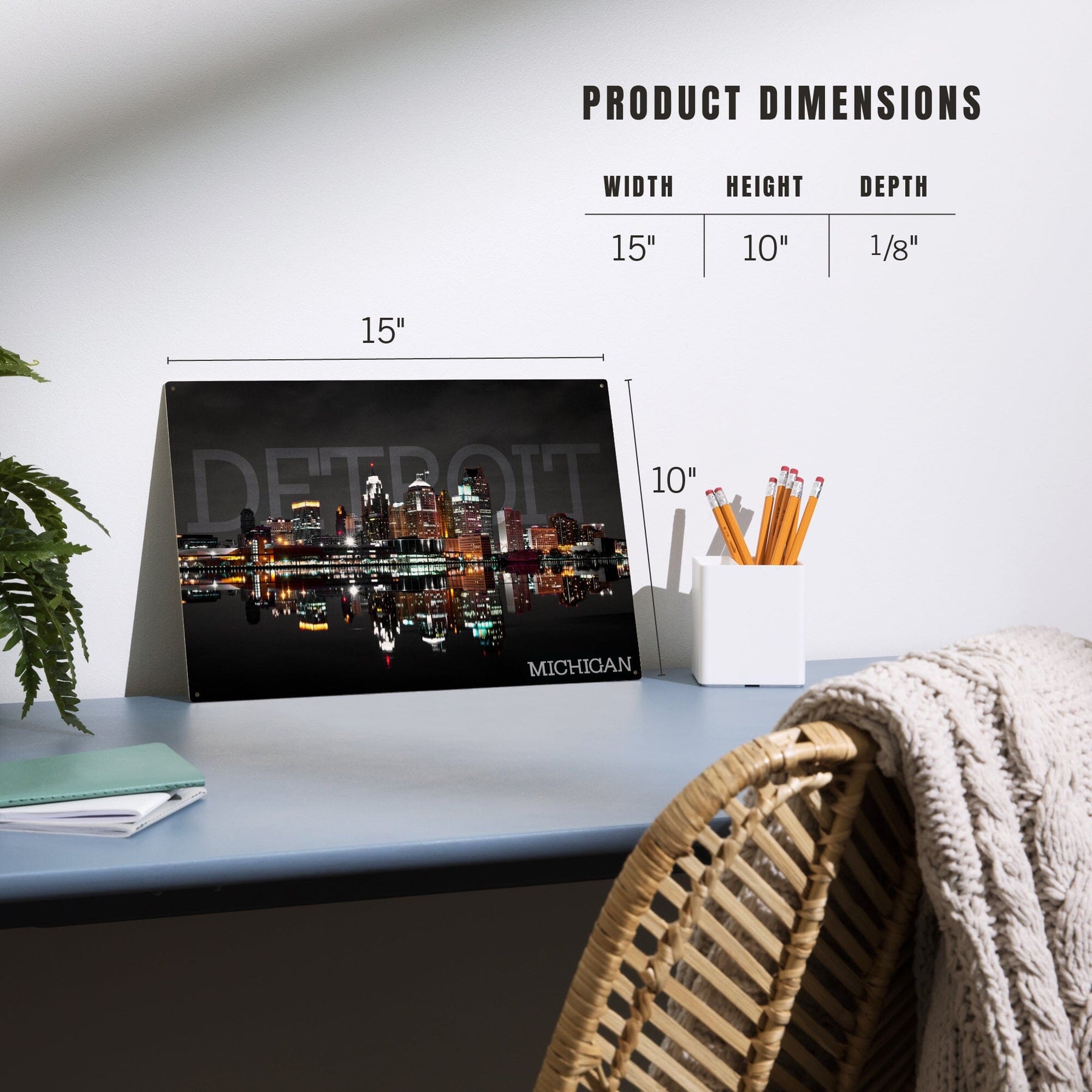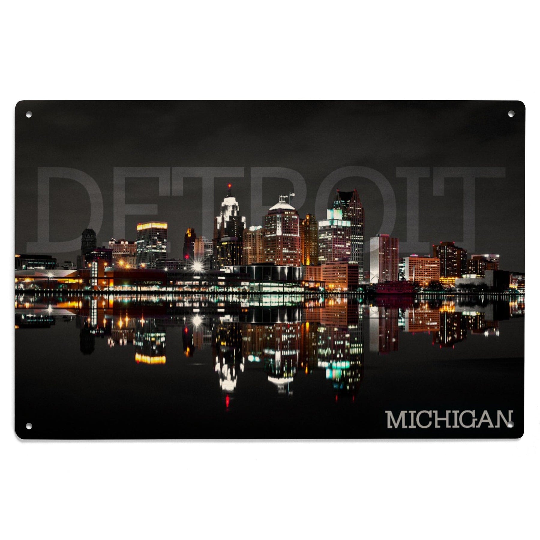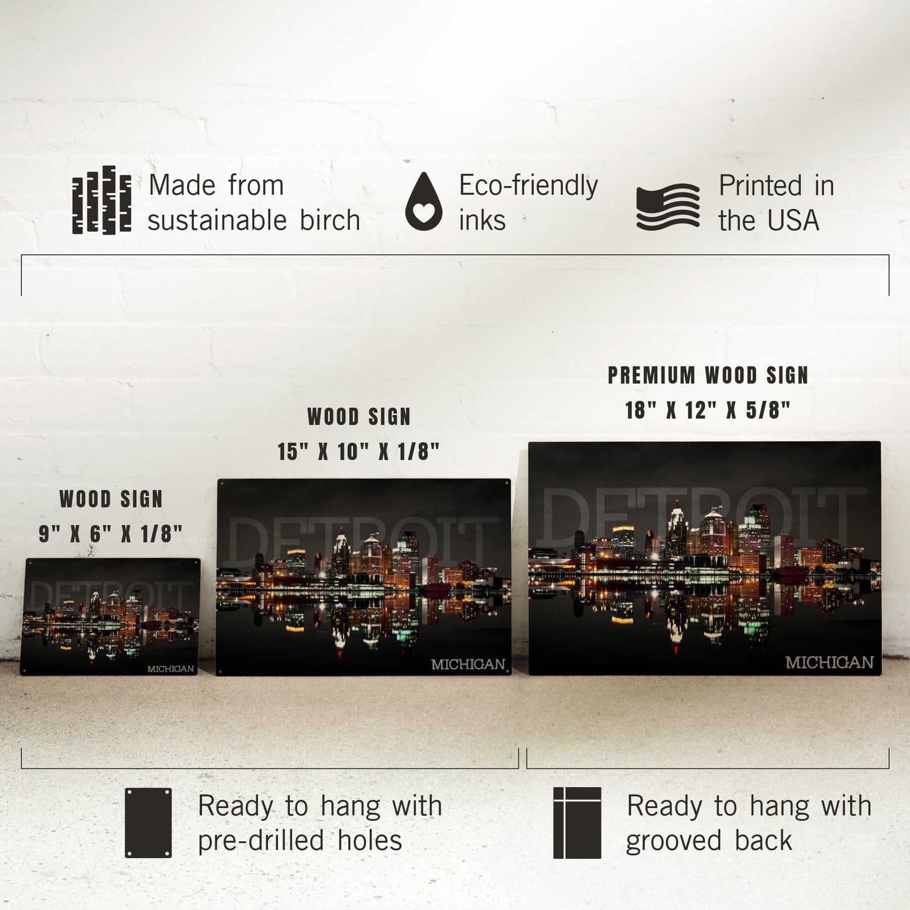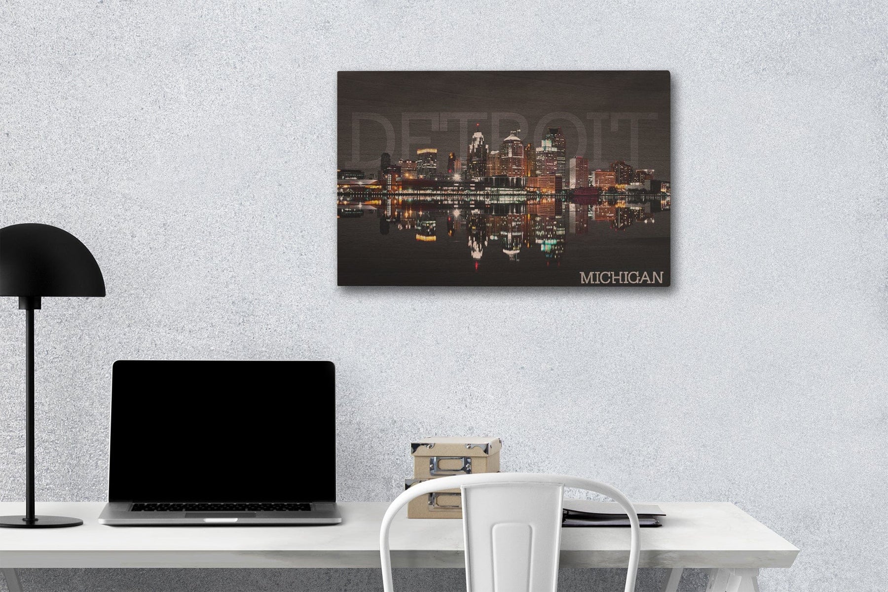 Detroit, Michigan, City at Night, Lantern Press Photography, Wood Signs and Postcards - Lantern Press