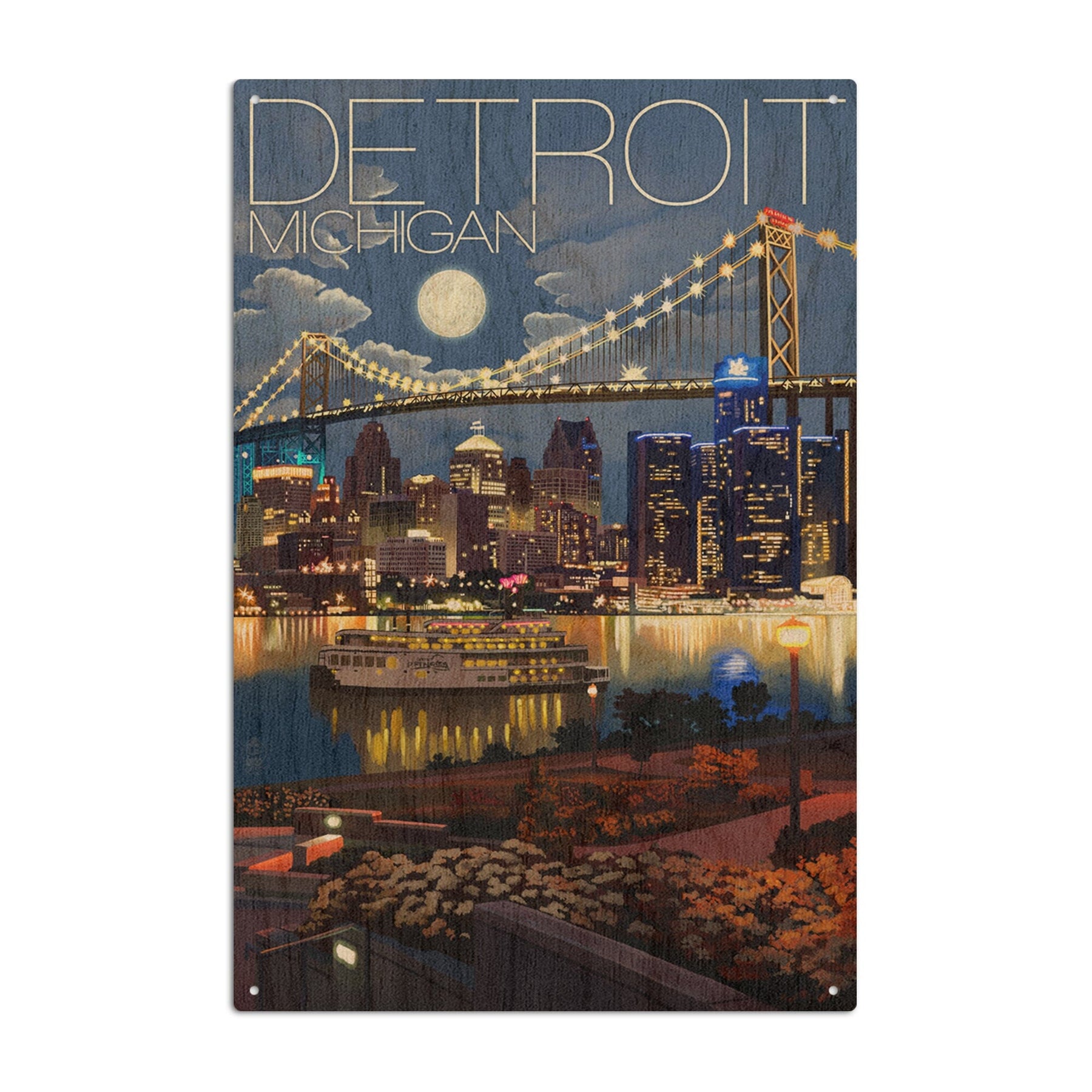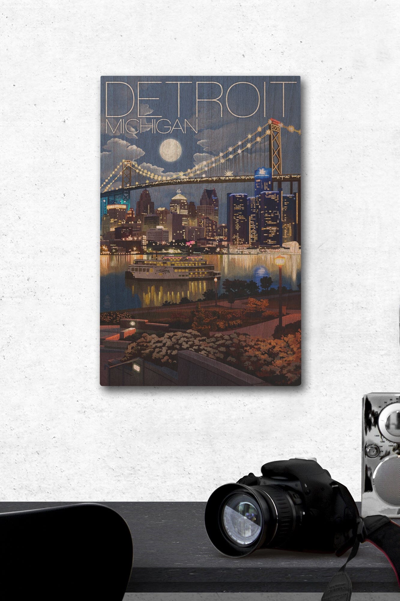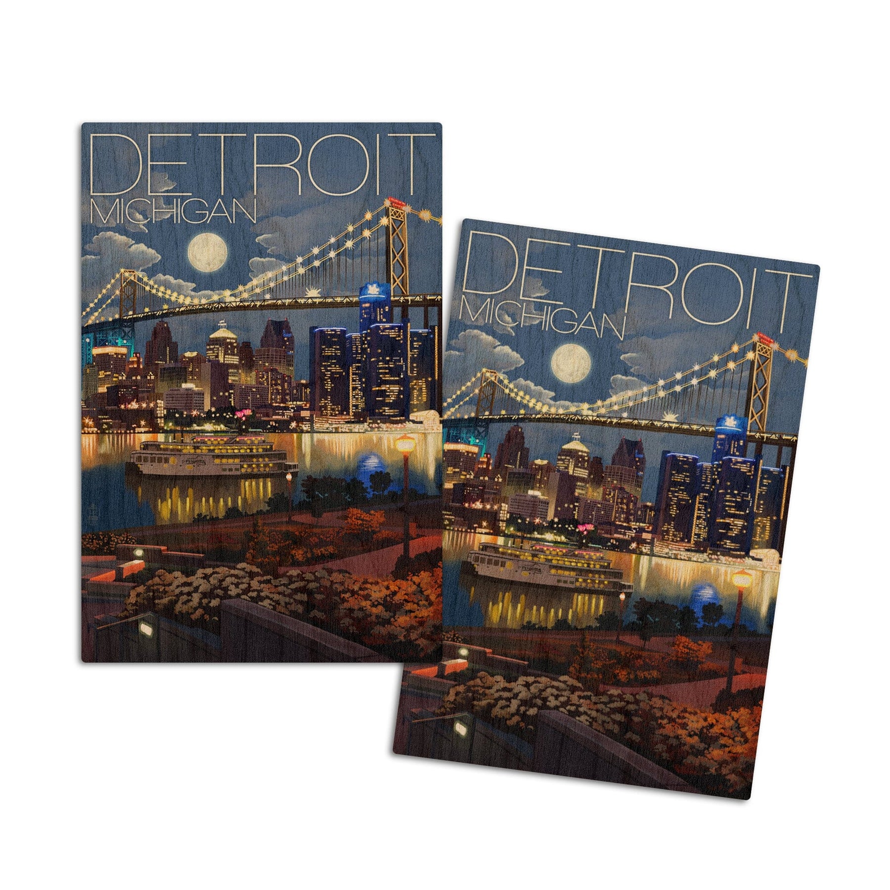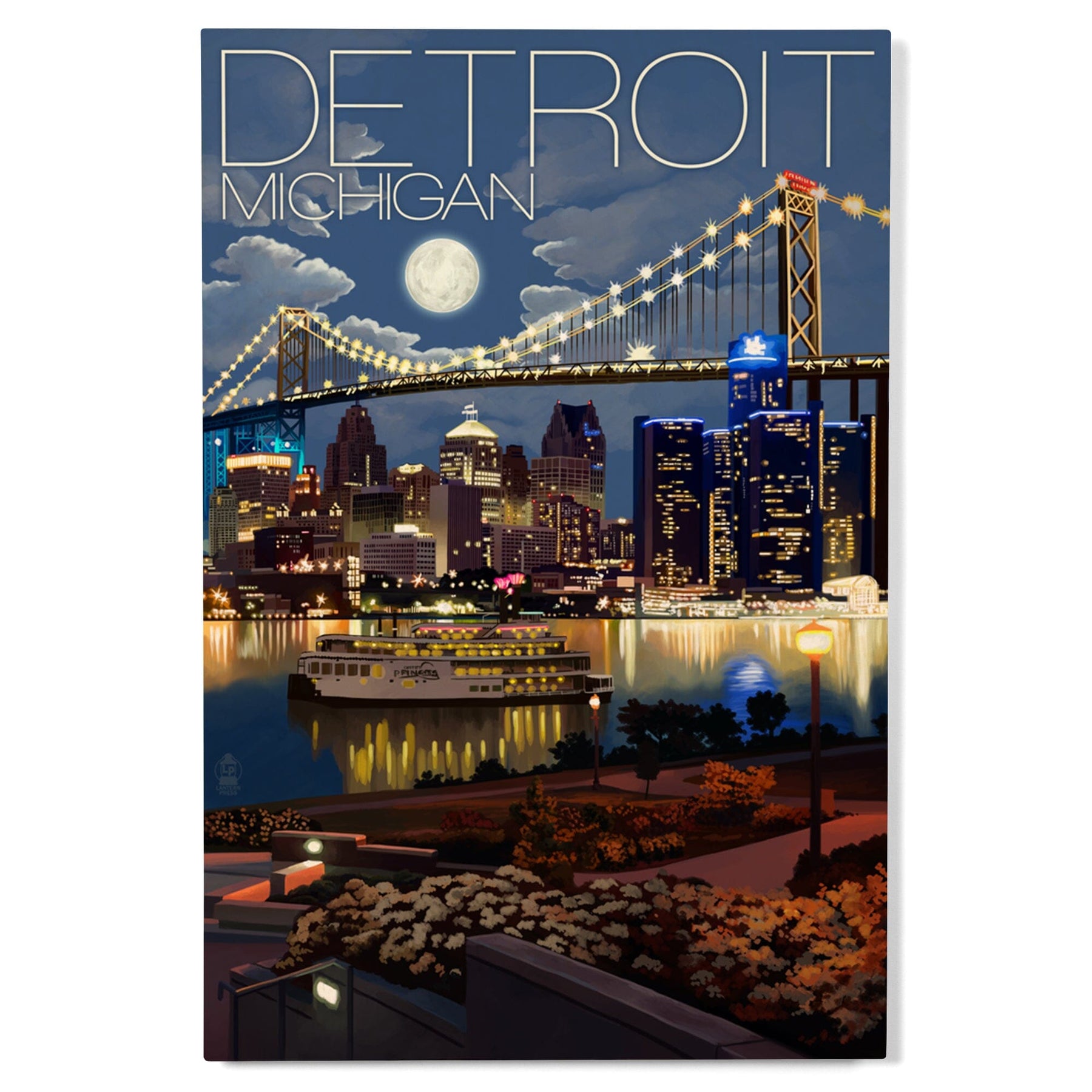 Detroit, Michigan, Skyline at Night, Lantern Press Artwork, Wood Signs and Postcards - Lantern Press