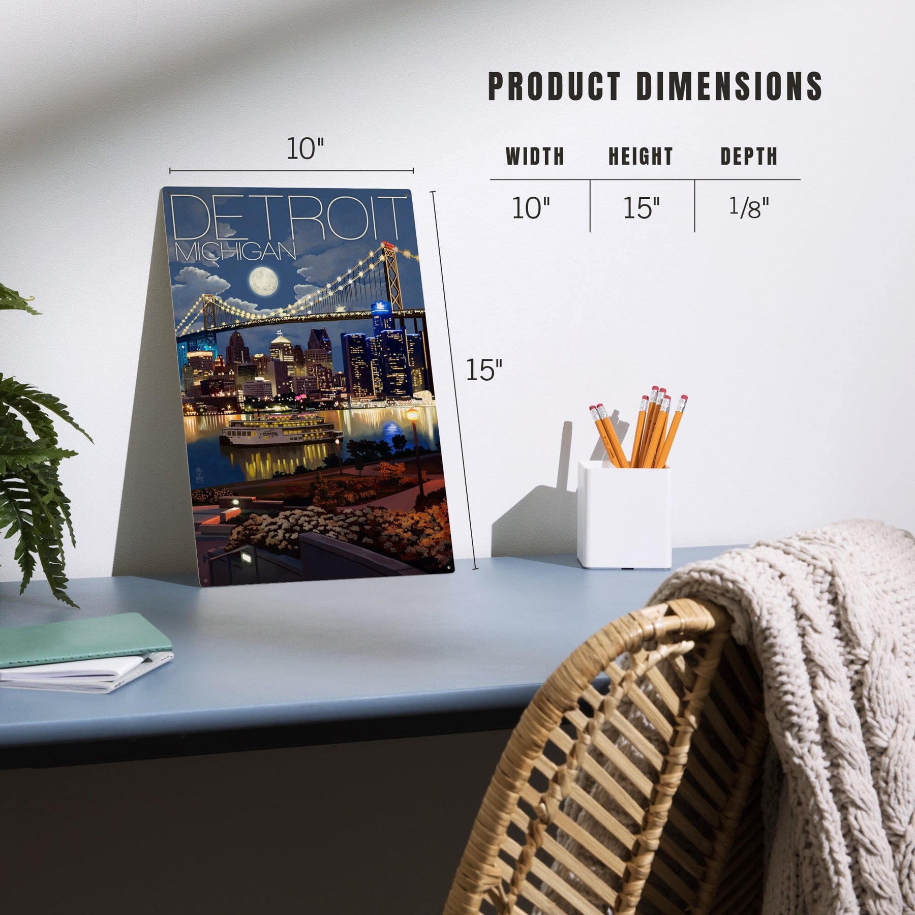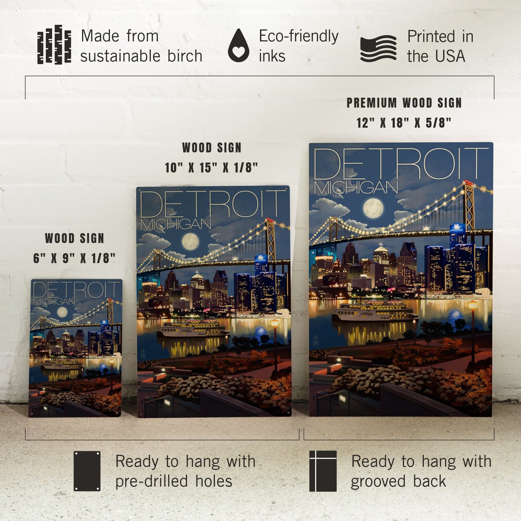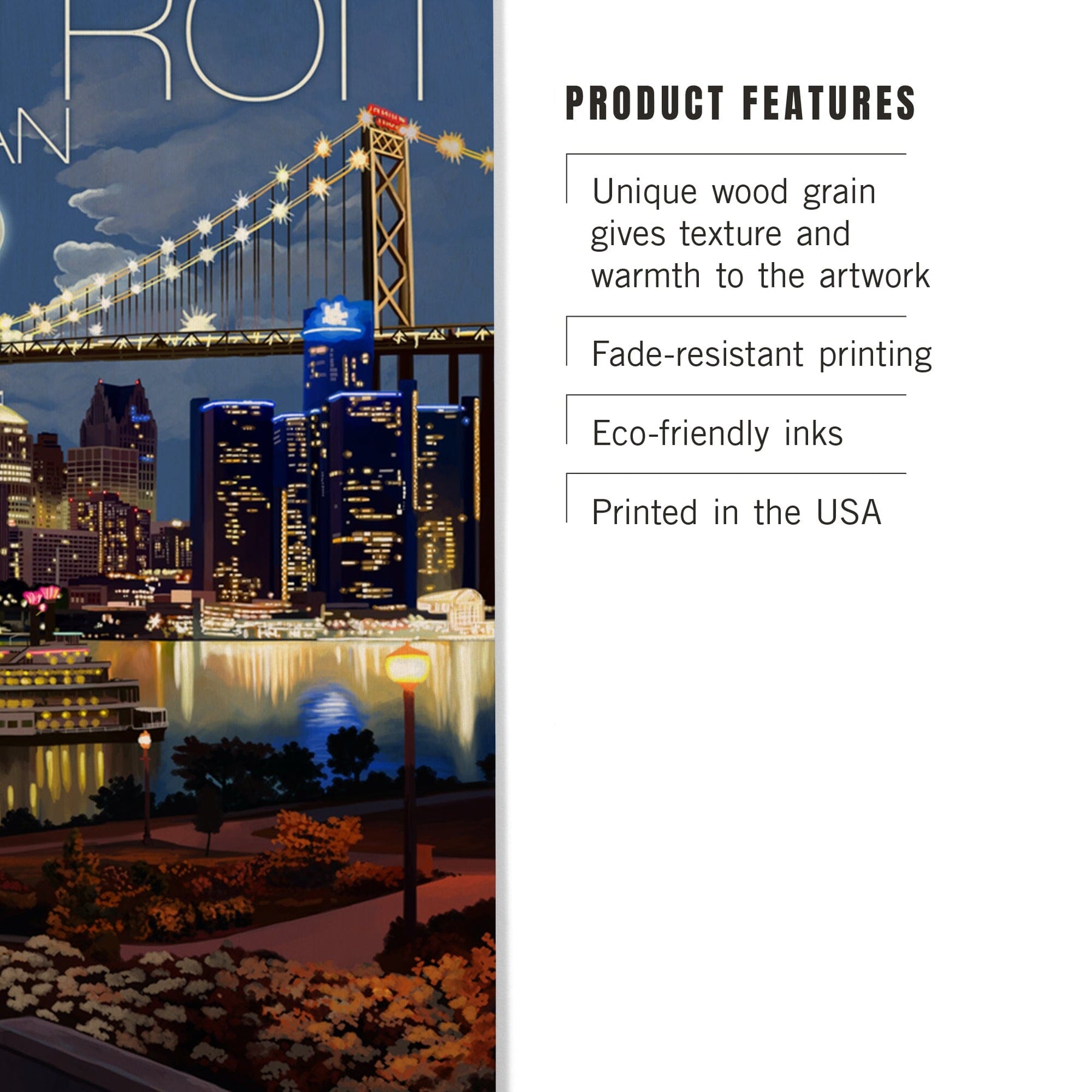 Detroit, Michigan, Skyline at Night, Lantern Press Artwork, Wood Signs and Postcards