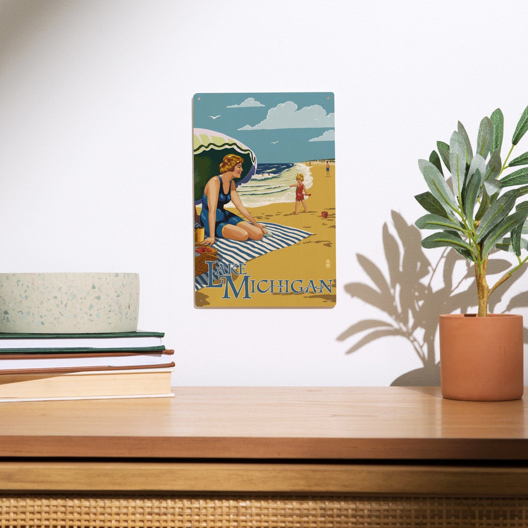 Lake Michigan, Beach Scene, Lantern Press Artwork, Wood Signs and Postcards - Lantern Press