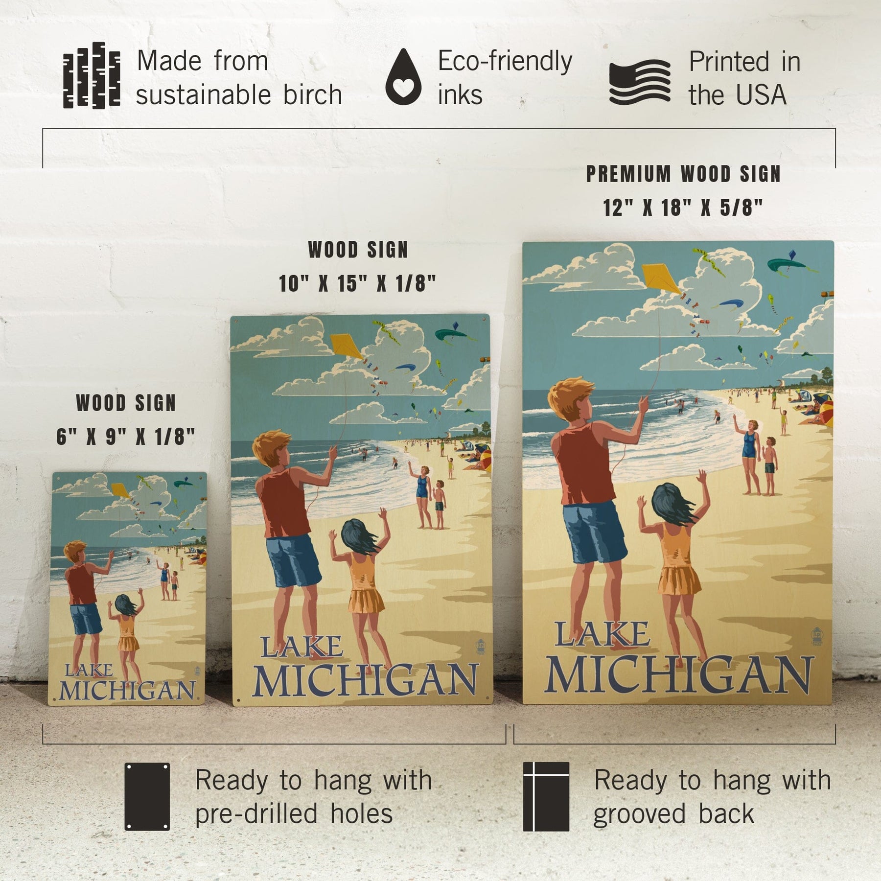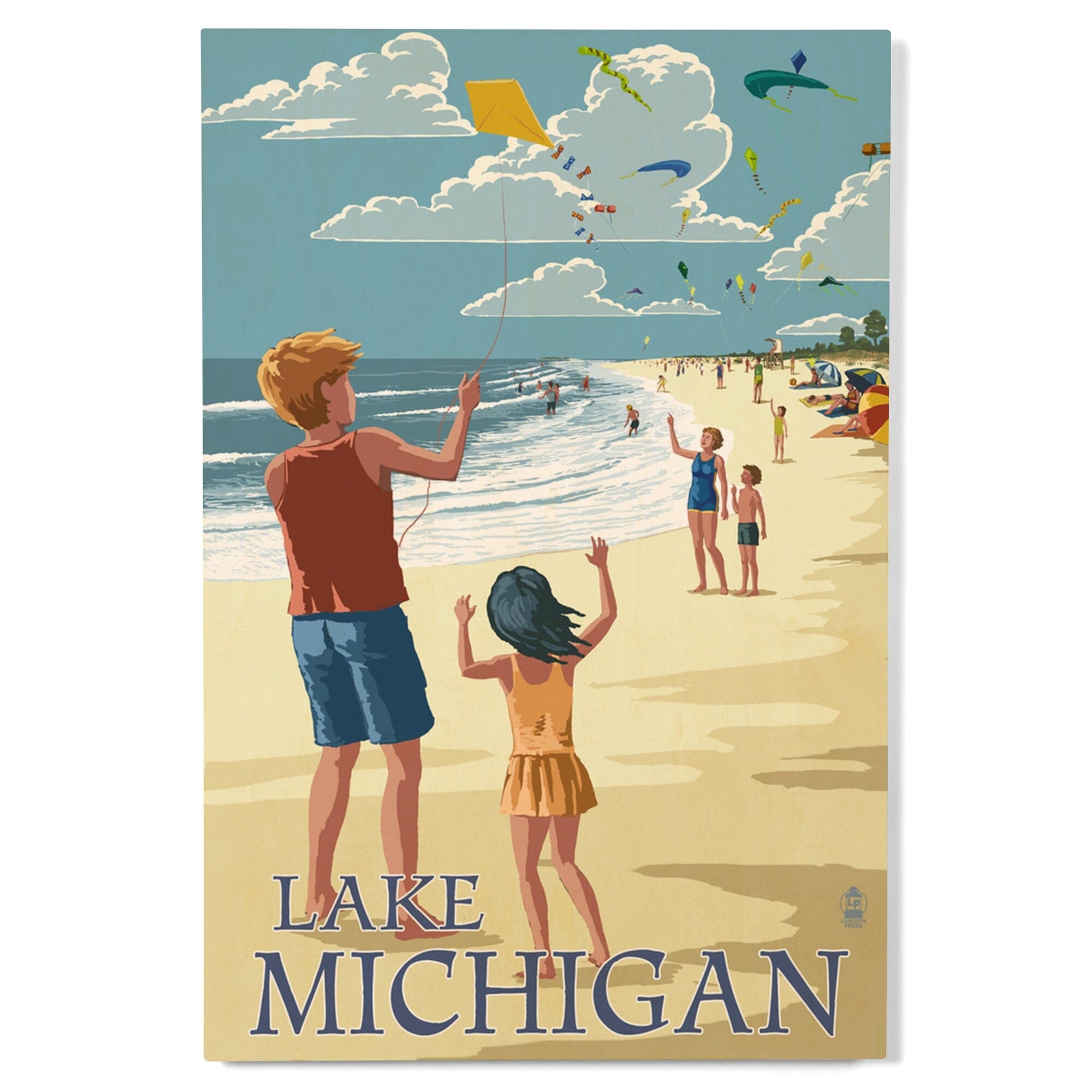Lake Michigan, Children Flying Kites, Lantern Press Artwork, Wood Signs and Postcards