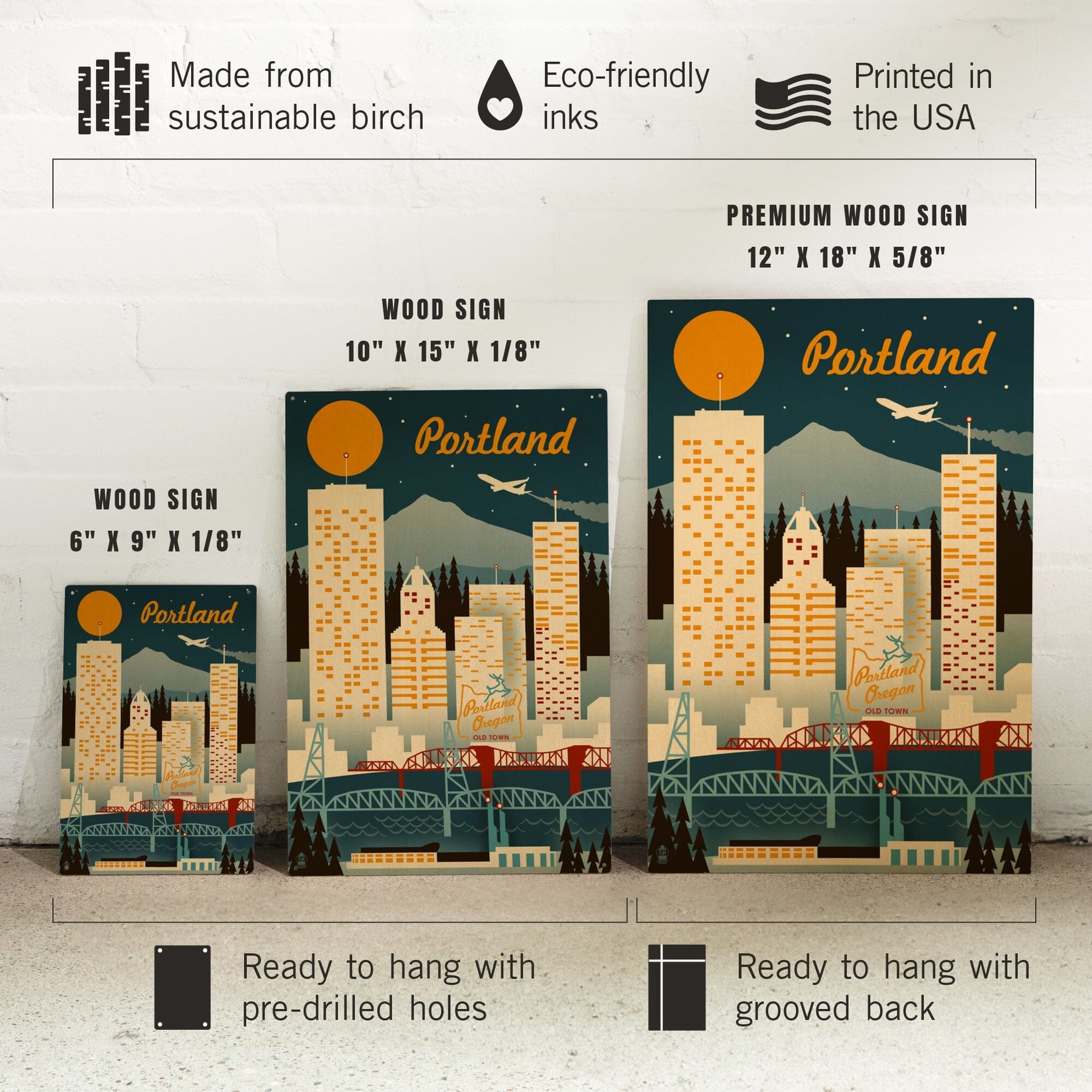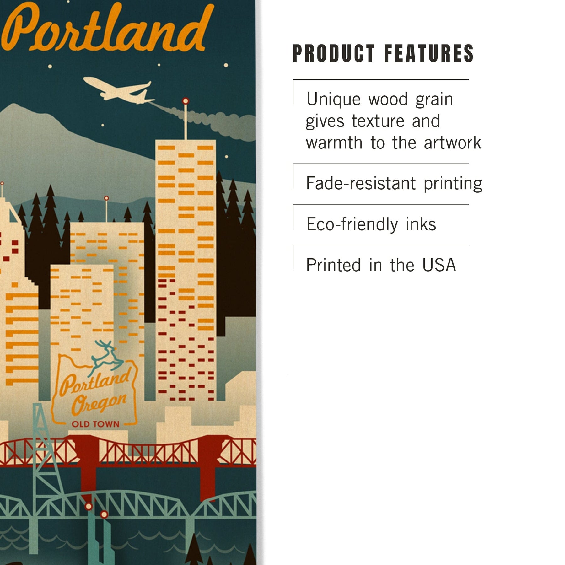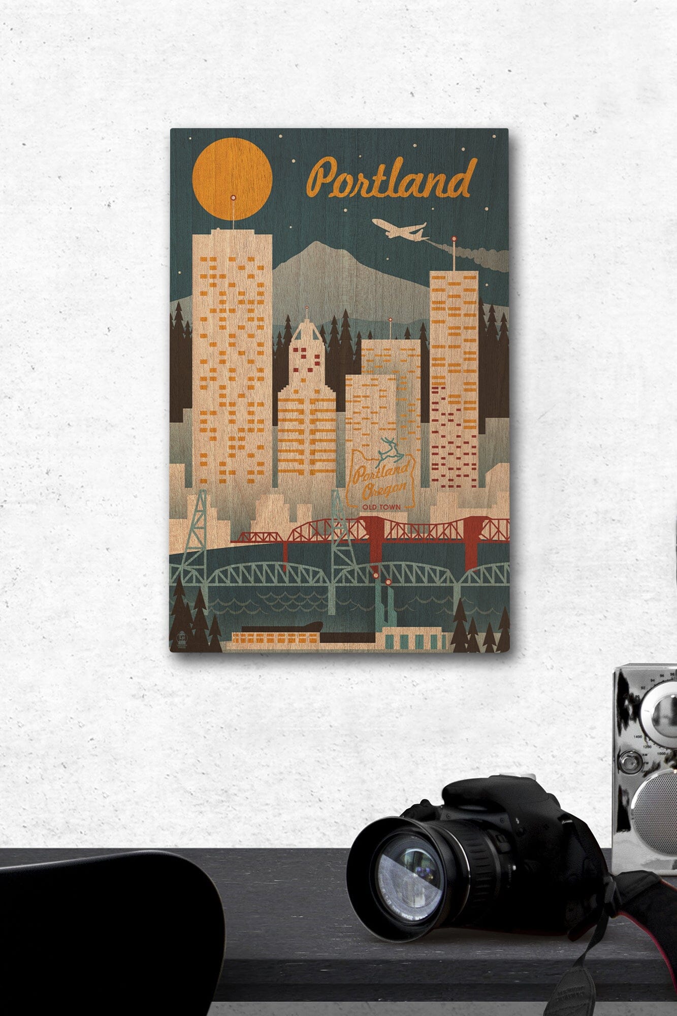 Portland, Oregon, Retro Skyline, Lantern Press Artwork, Wood Signs and Postcards Wood Lantern Press