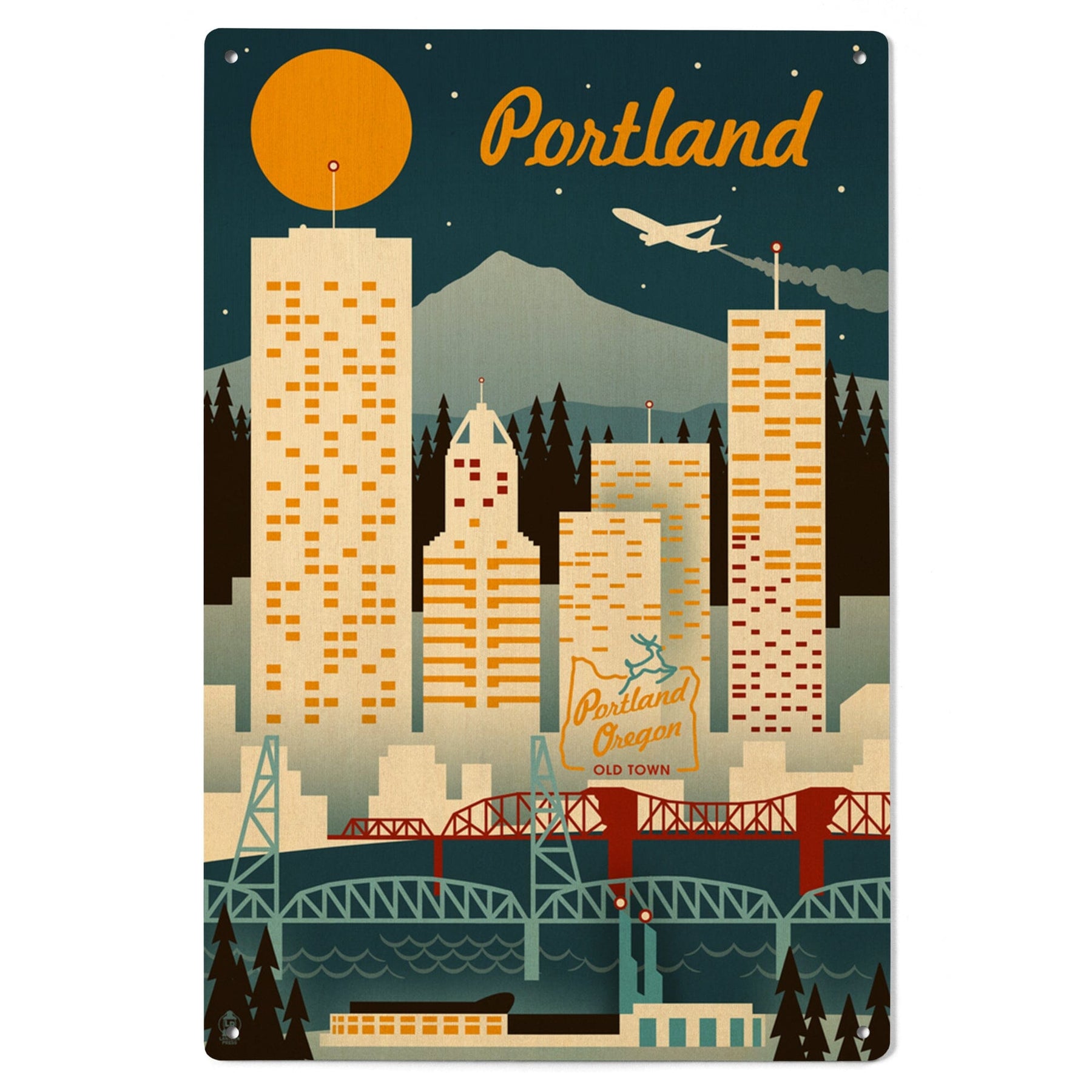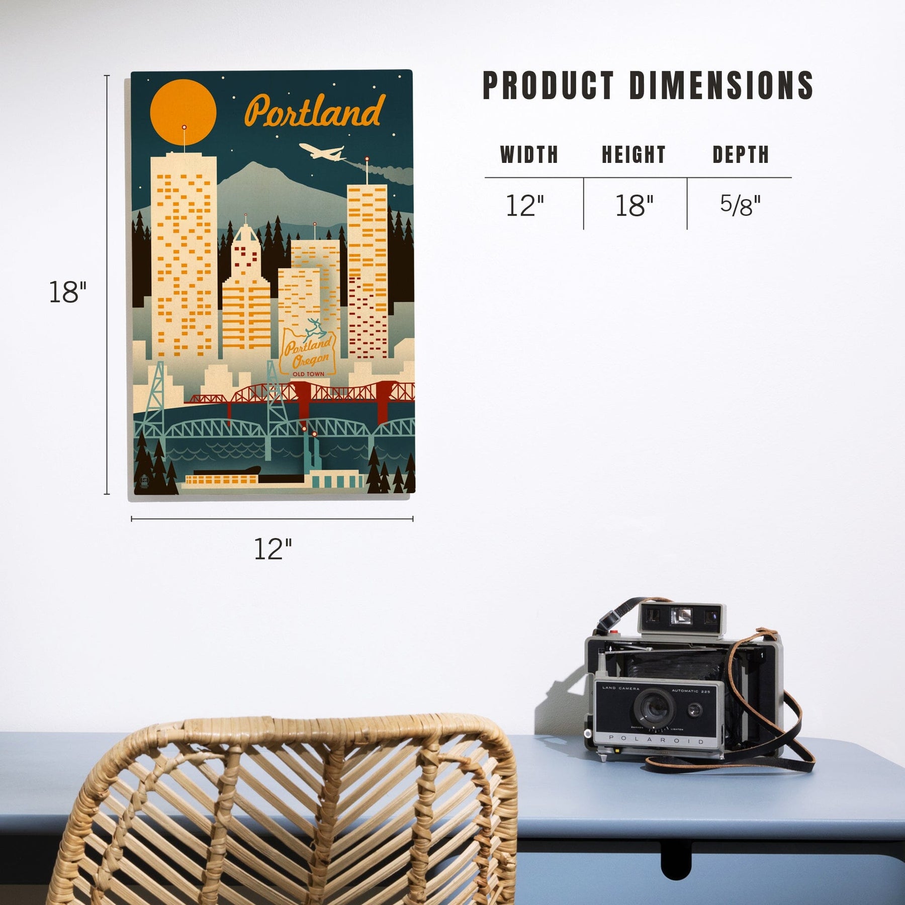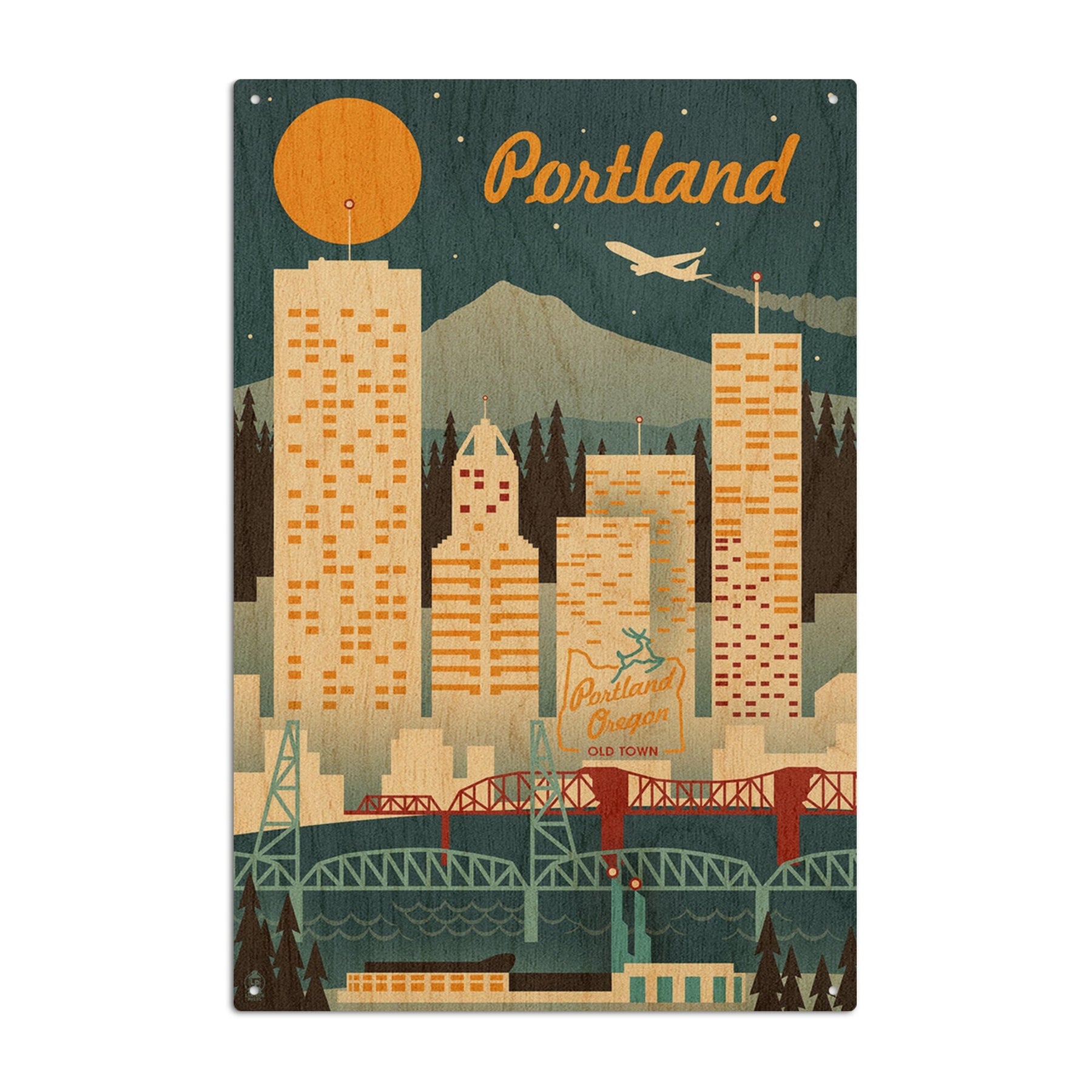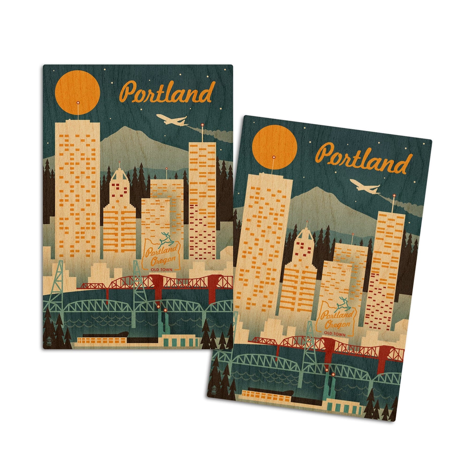 Portland, Oregon, Retro Skyline, Lantern Press Artwork, Wood Signs and Postcards Wood Lantern Press