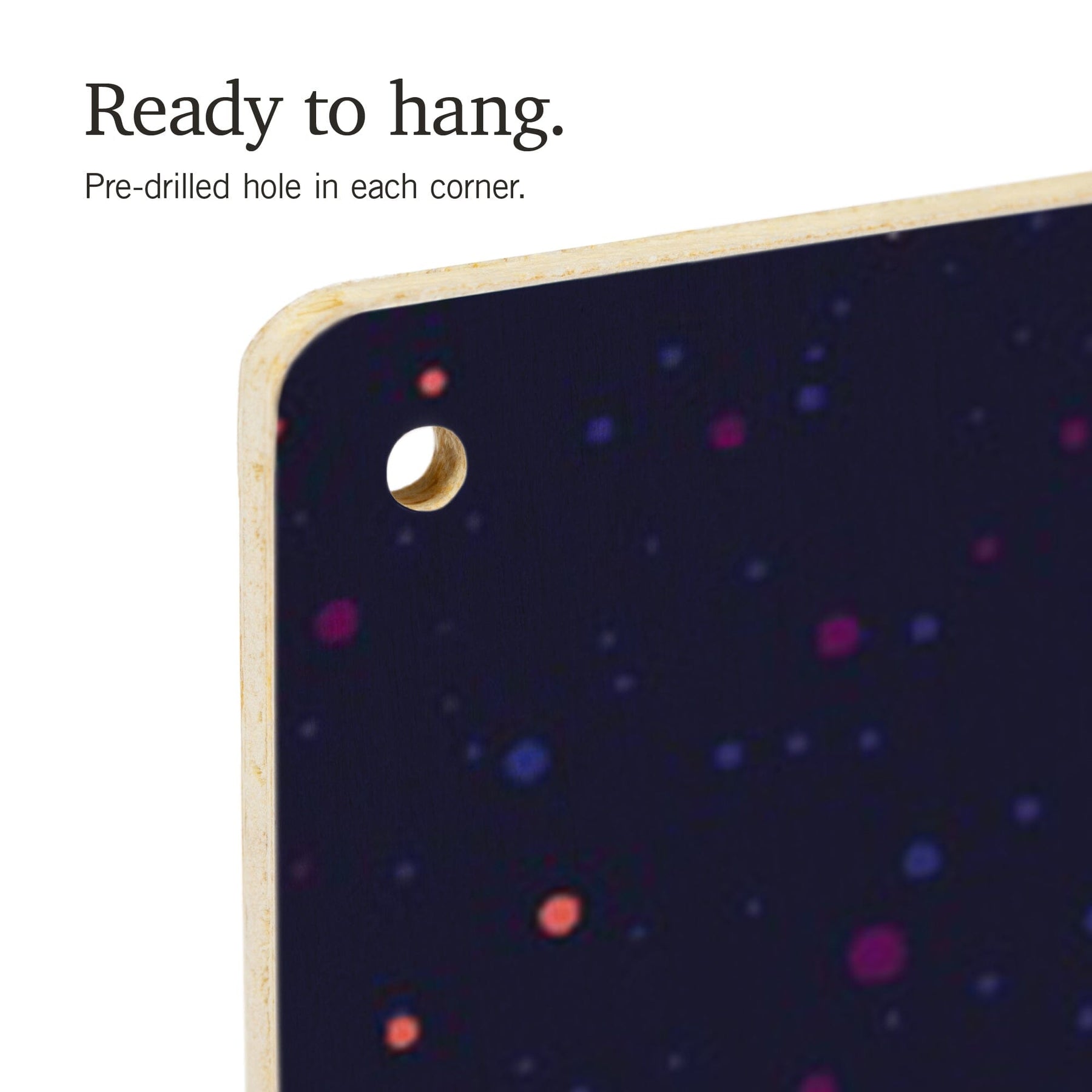 • Hole in each corner, ready to hang