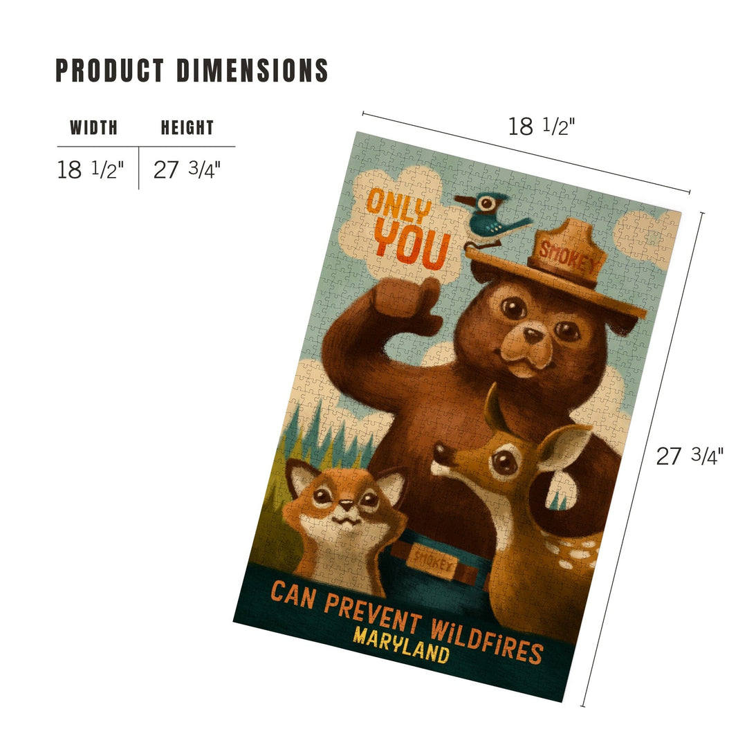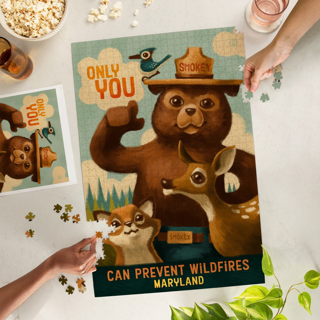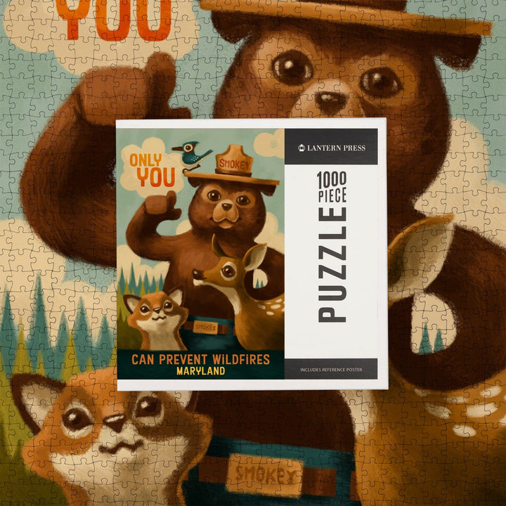 Print on demand puzzle with unique imagery, this 1000 piece puzzle boasts sharp detail and vivid imagery of Maryland, Oil Painting, Only You, Smokey Bear from Lantern Press.