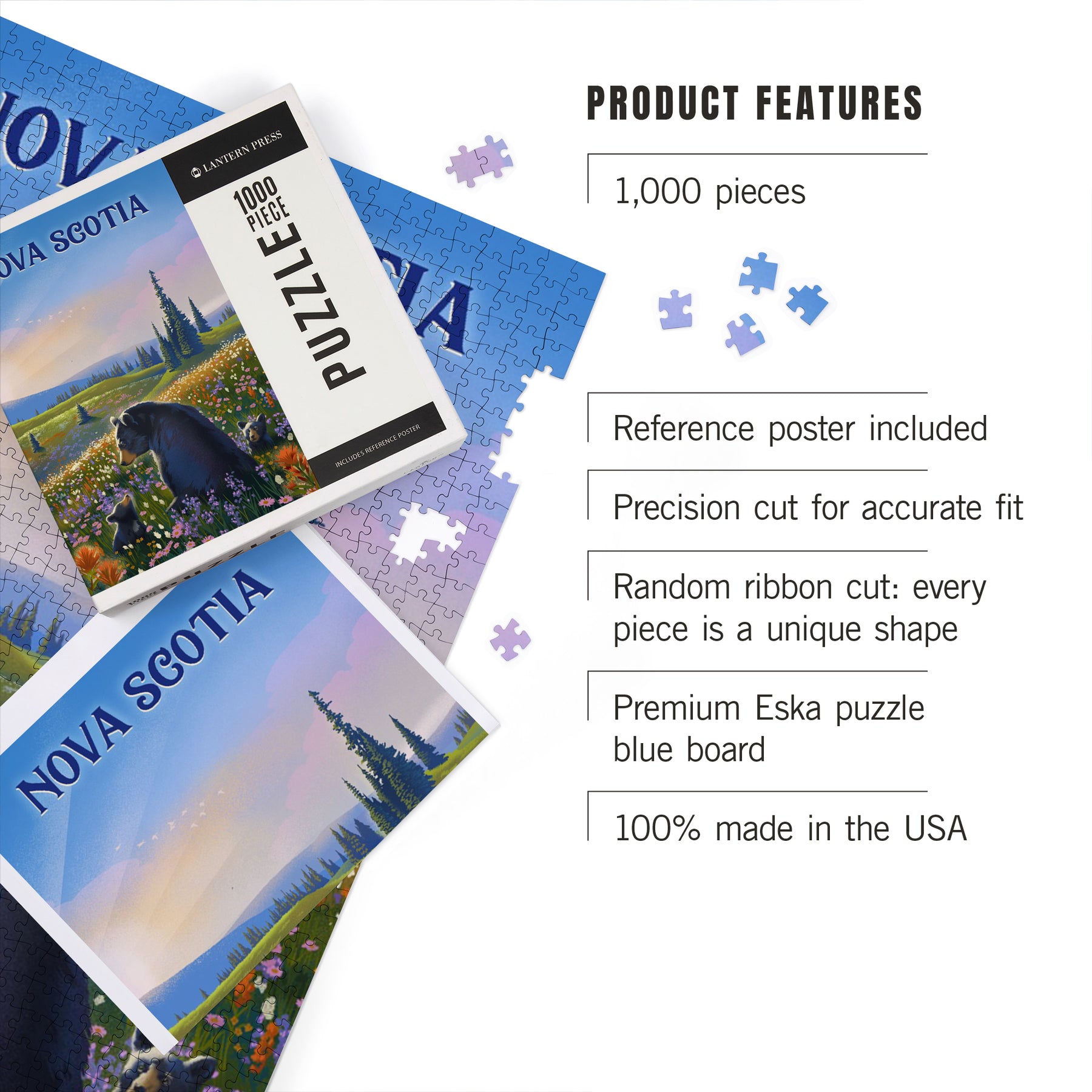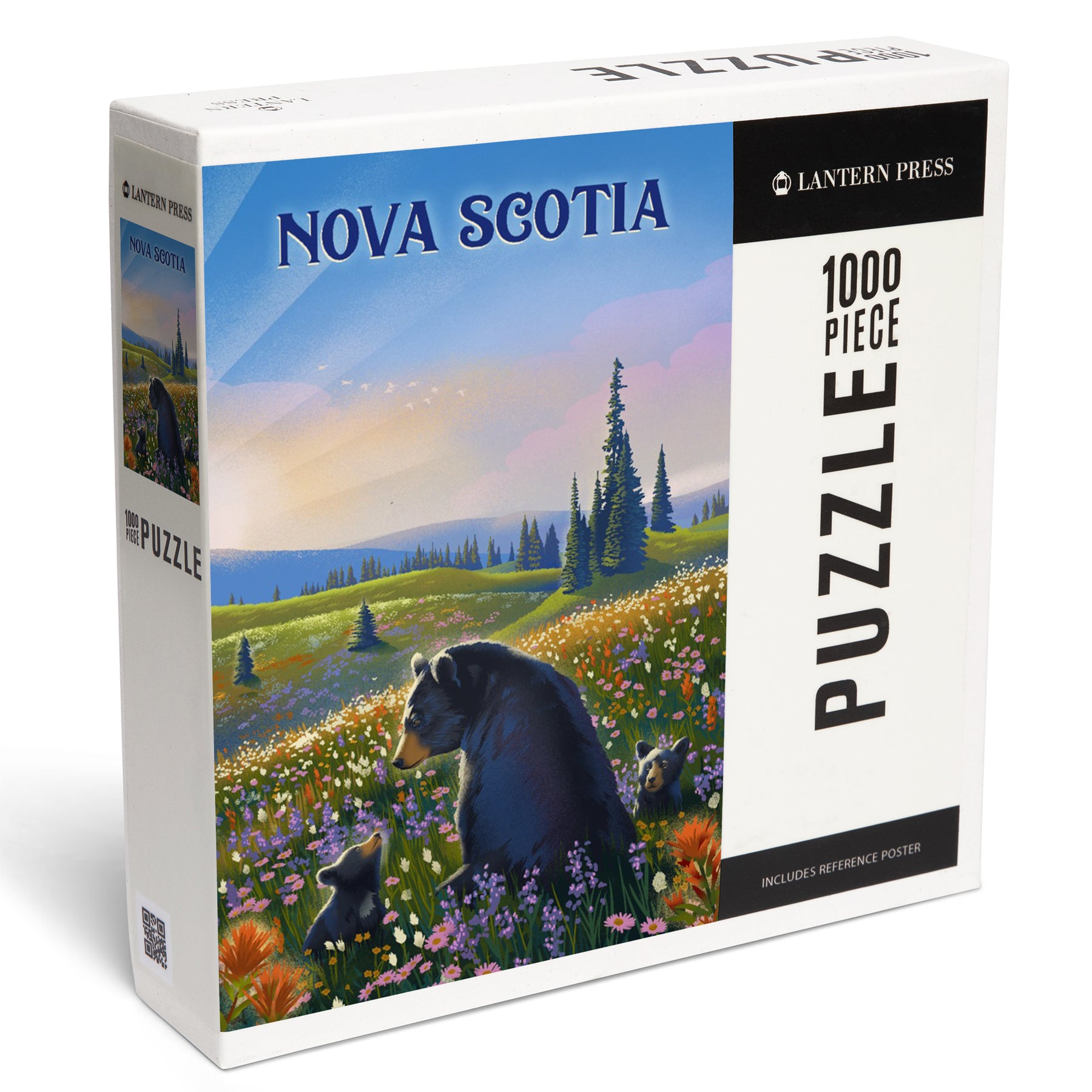 Nova Scotia, Lithograph, Bear Family in Field, Jigsaw Puzzle Puzzle Lantern Press