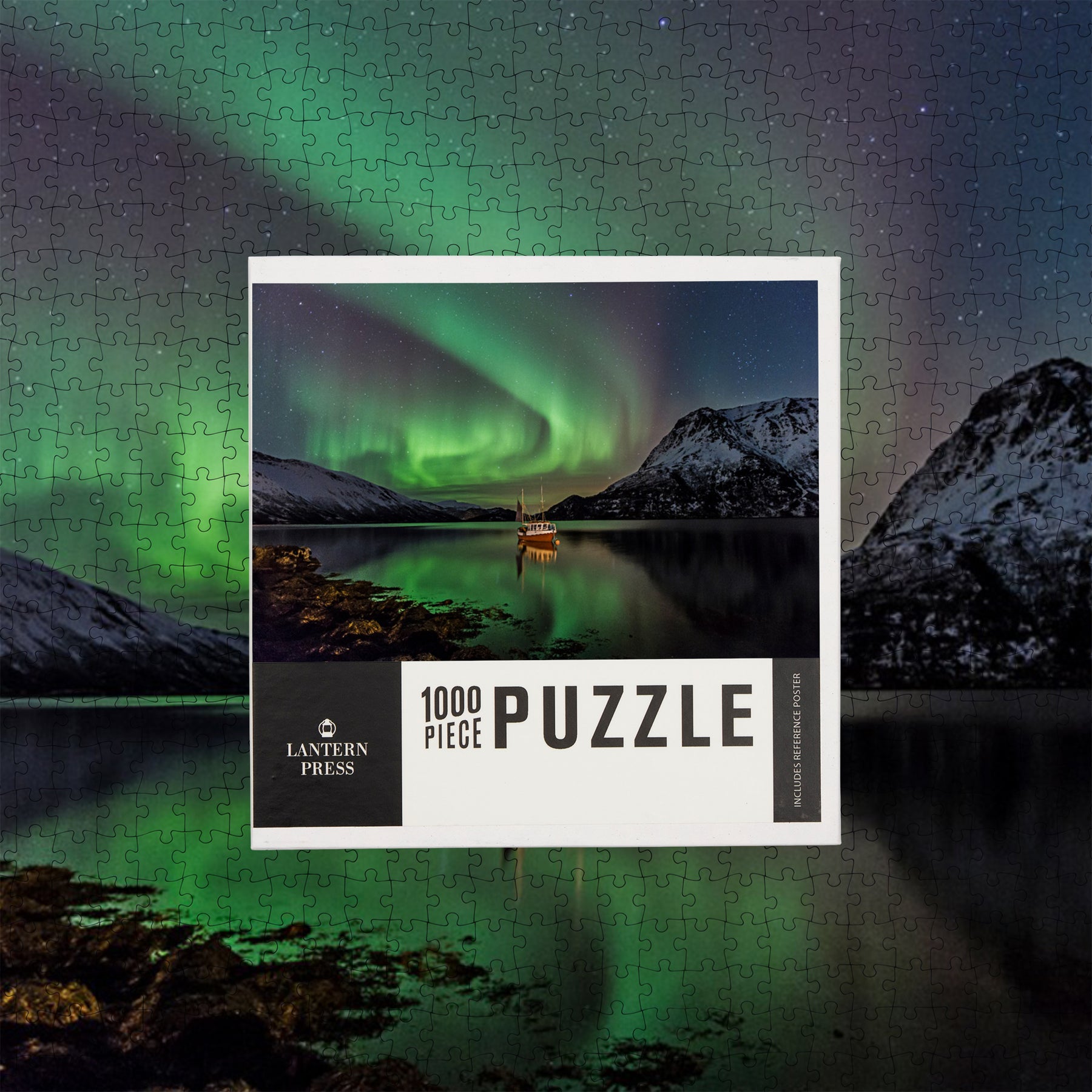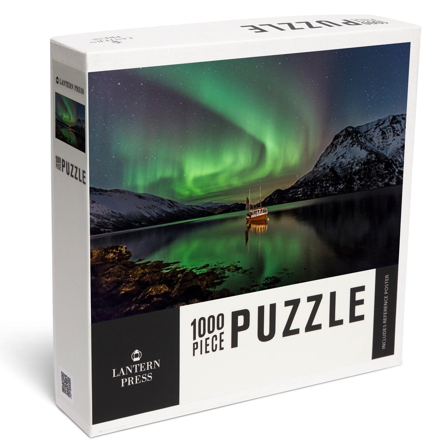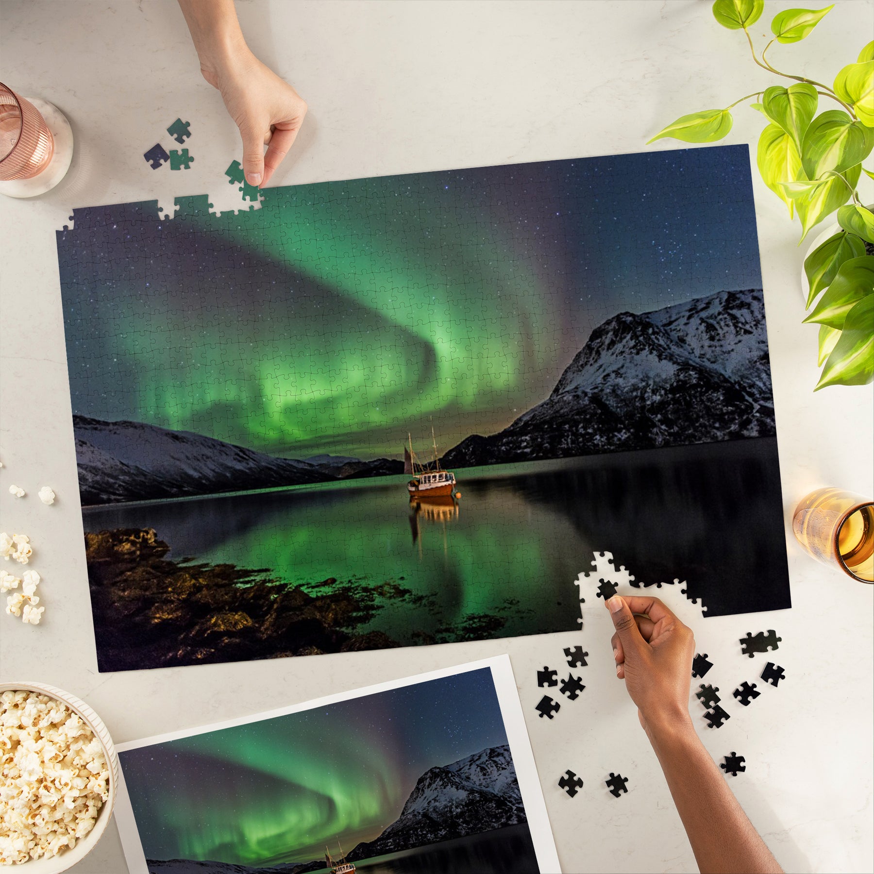 Fishing Boat on Lake and Northern Lights, Jigsaw Puzzle Puzzle Lantern Press