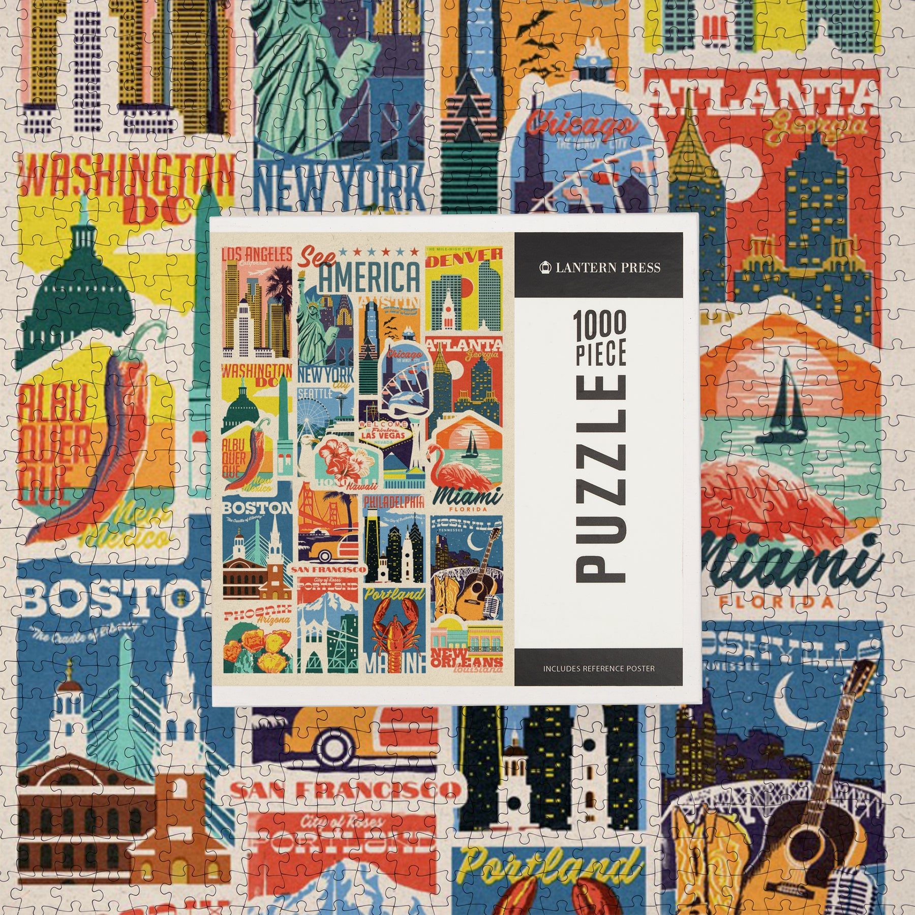 Woodblock Cities Collage, See America, Jigsaw Puzzle Puzzle Lantern Press